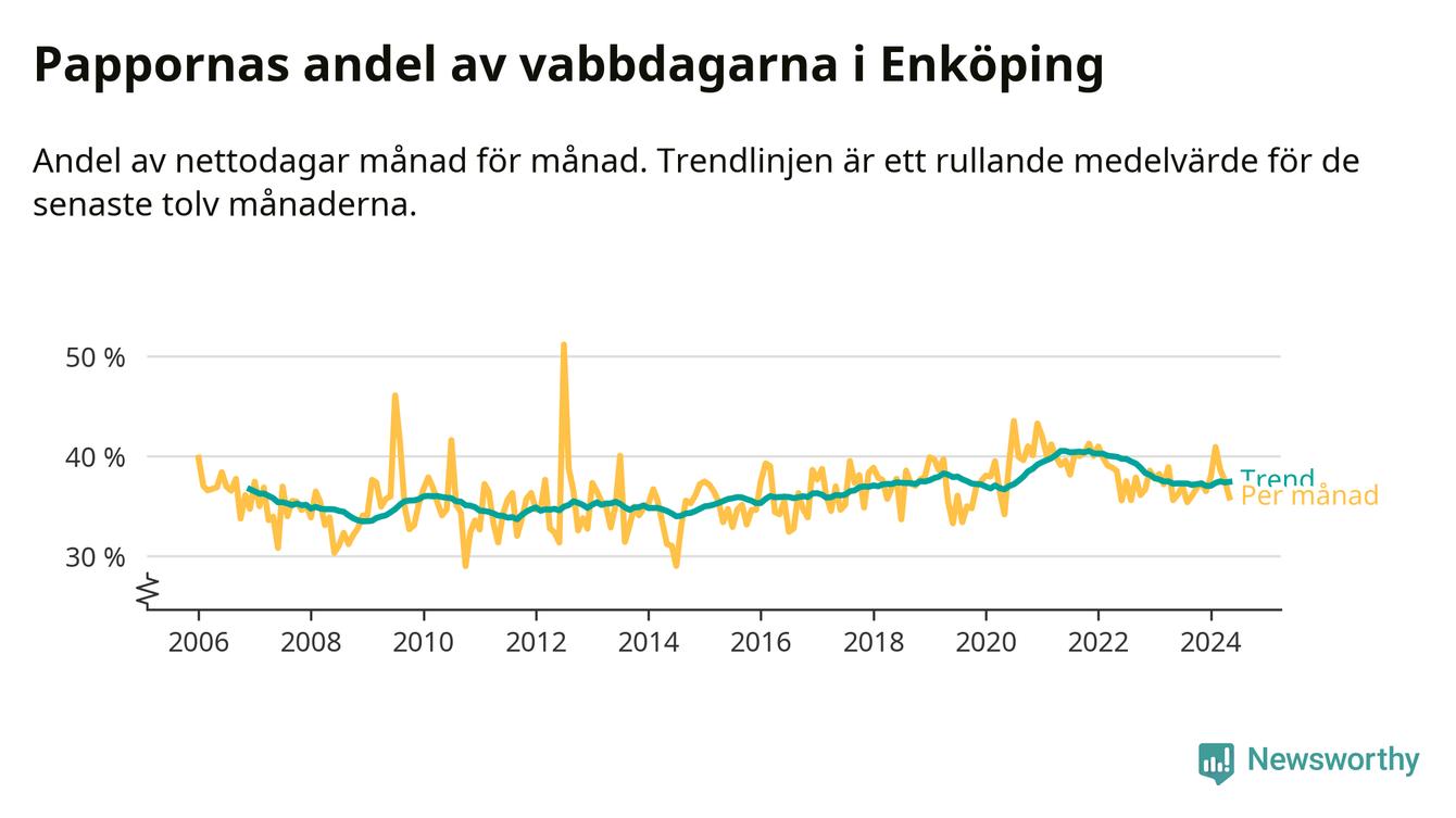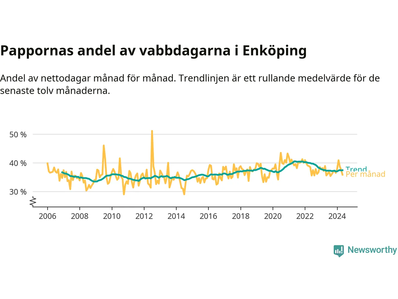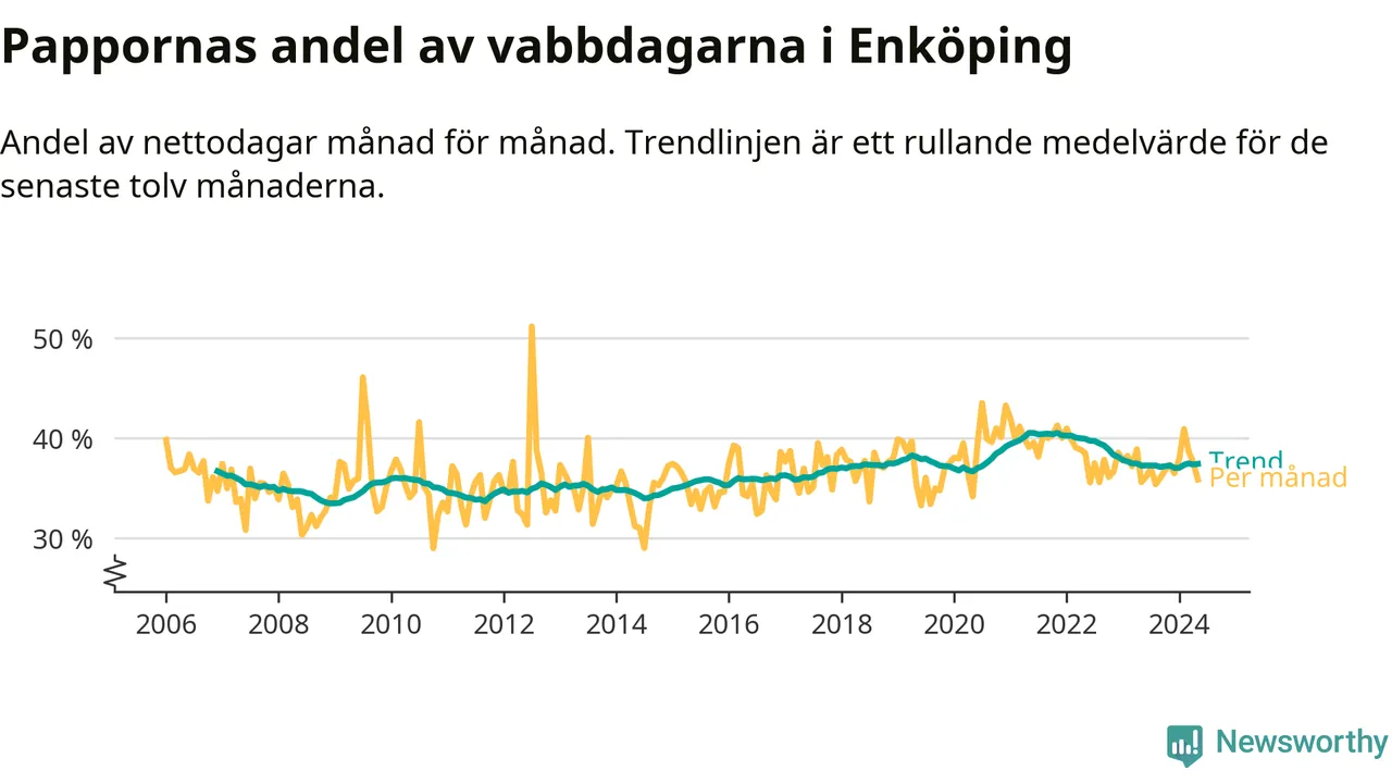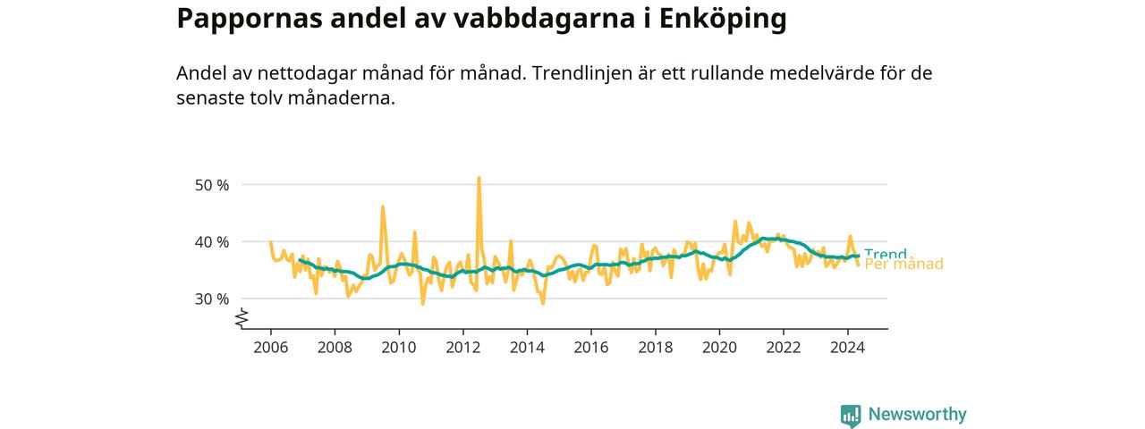 Enköping ligger en bit från ett jämställt uttag. Under de senaste tolv månaderna har männen stått för 37 procent av all vabb i kommunen. Pappornas uttag peakade hösten 2021 då kommunens fäder var uppe i 41 procent av vabbdagarna 1.