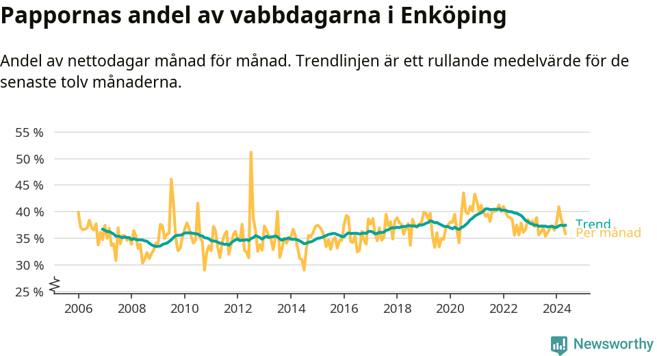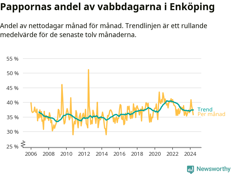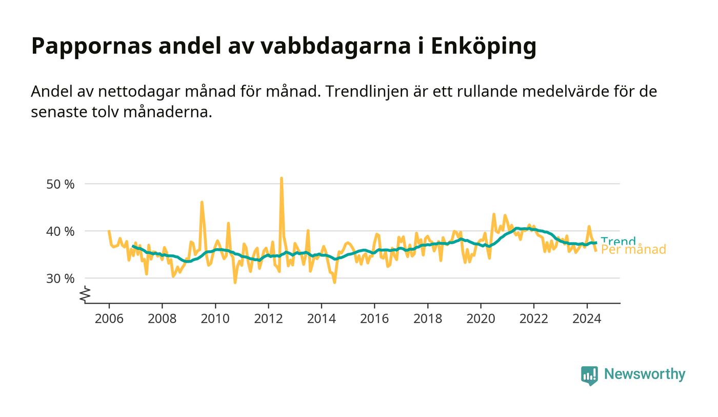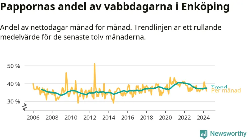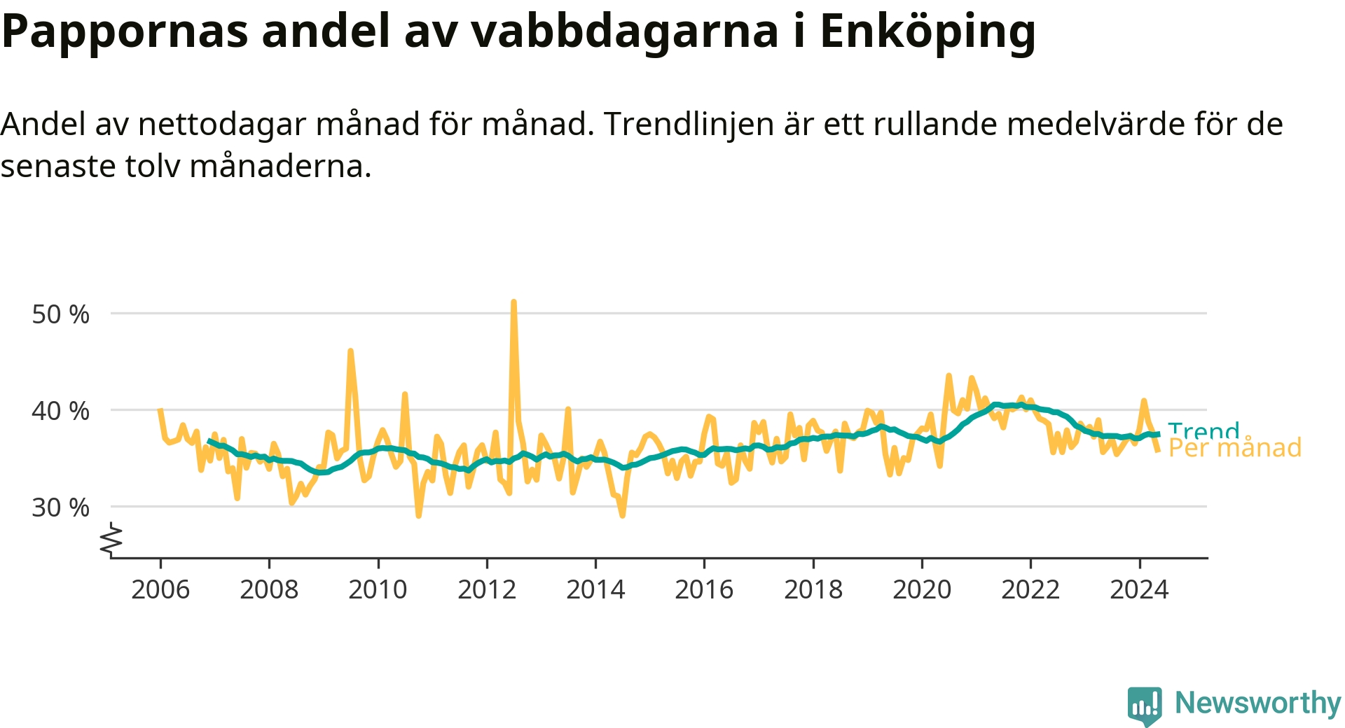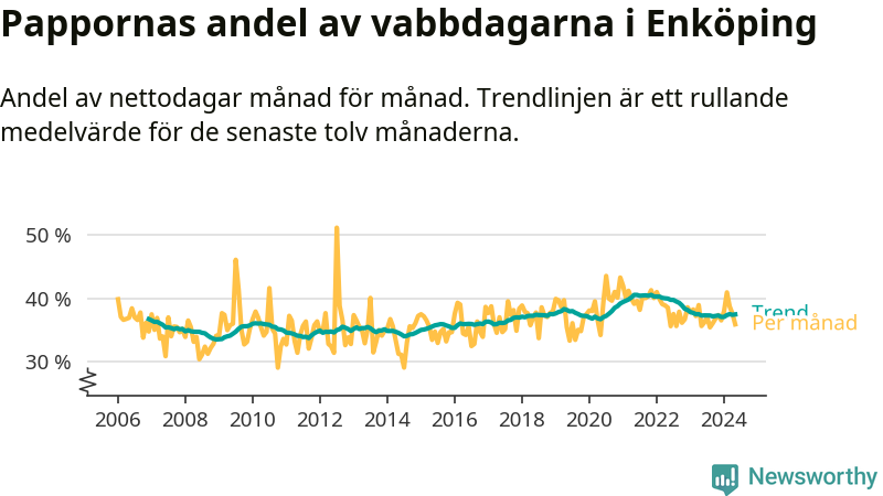 Enköping ligger en bit från ett jämställt uttag. Under de senaste tolv månaderna har männen stått för 37 procent av all vabb i kommunen. Pappornas uttag peakade hösten 2021 då kommunens fäder var uppe i 41 procent av vabbdagarna 1.