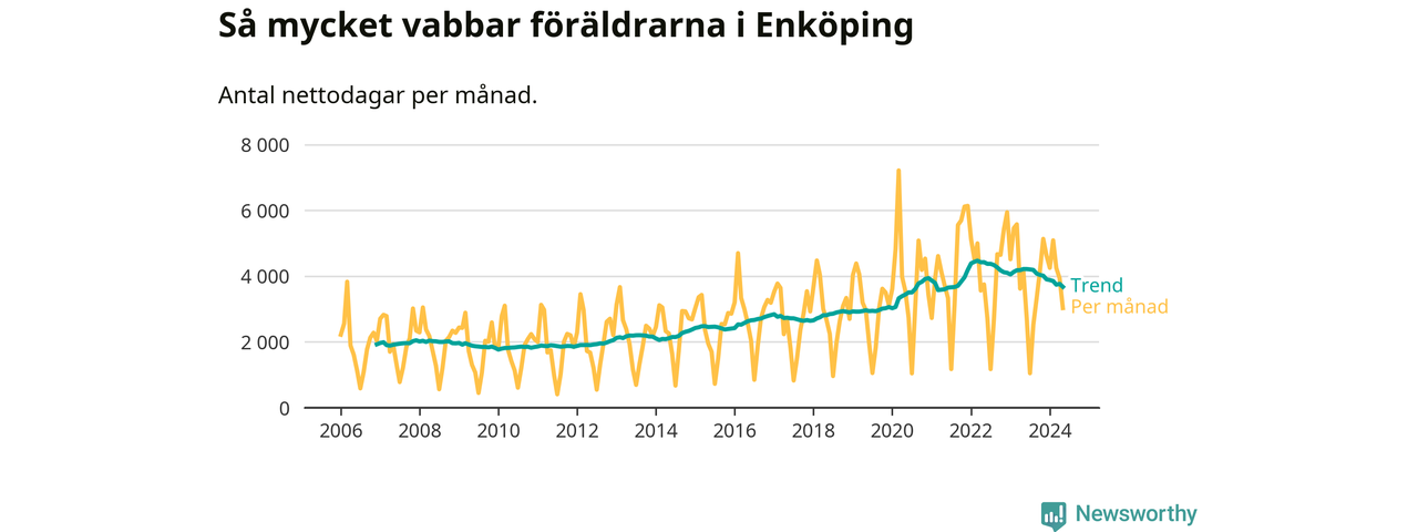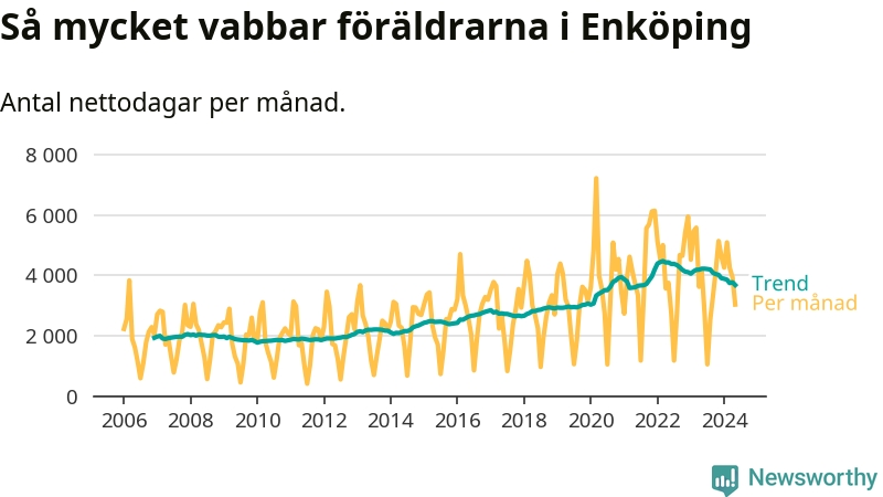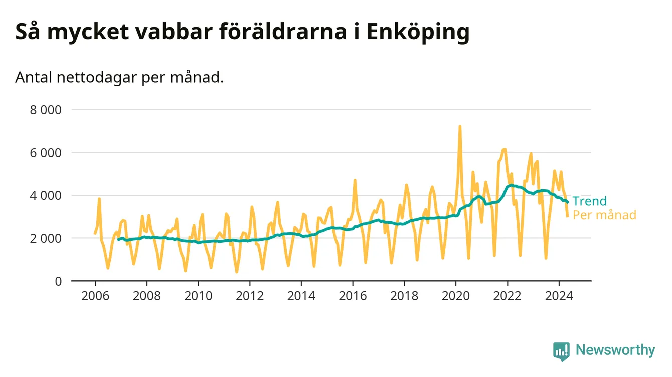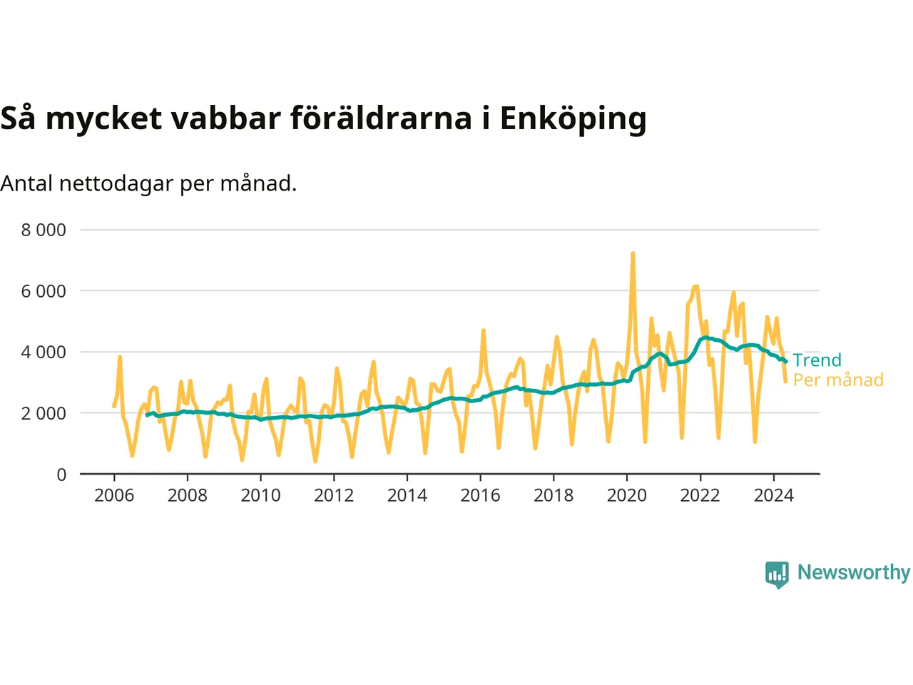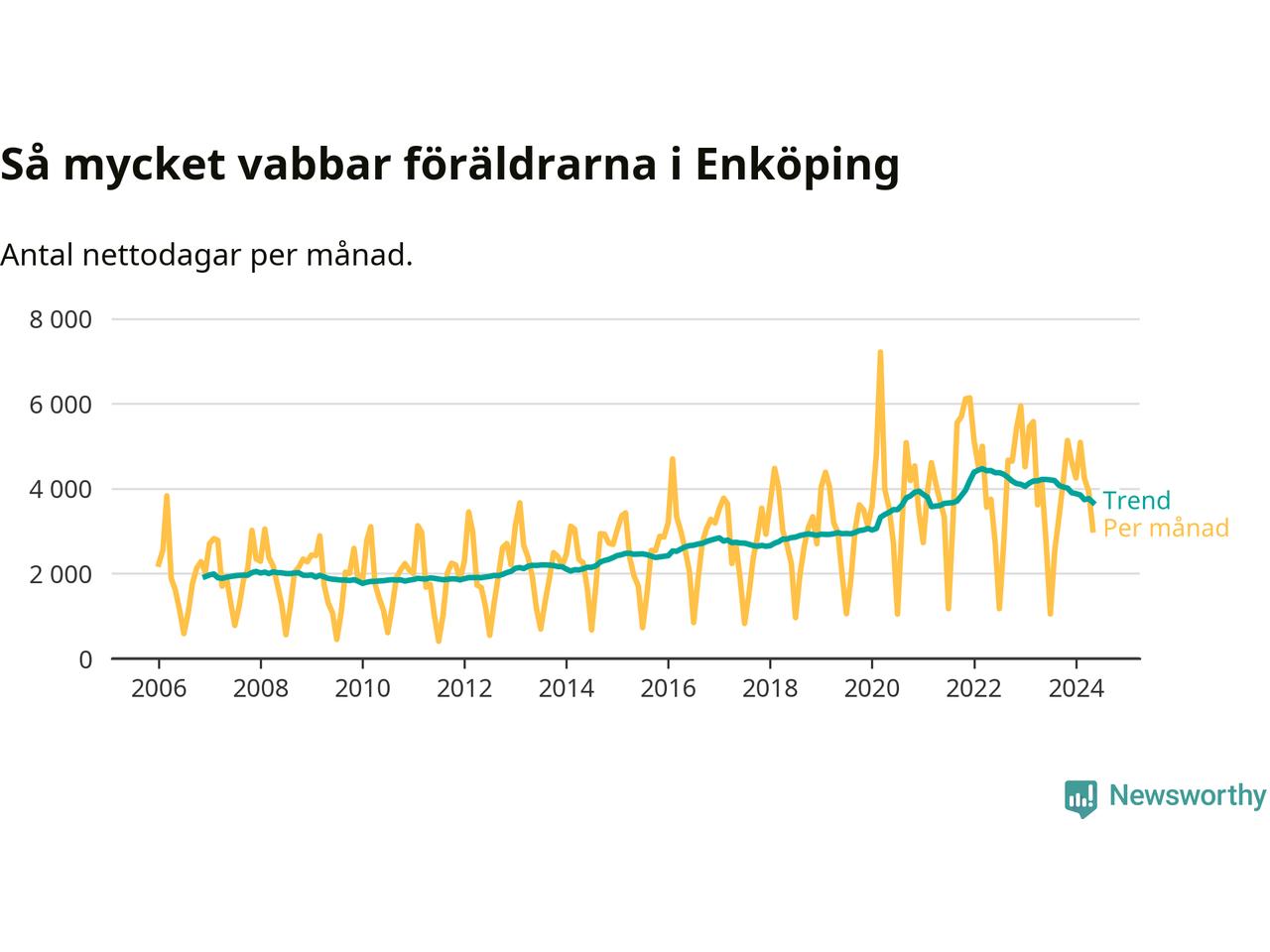 När coronapandemin drog in i mars 2020 peakade antalet vabbdagar både i Enköpings kommun och i riket som helhet. Under de senaste två åren har vabbuttaget börjat minska igen.