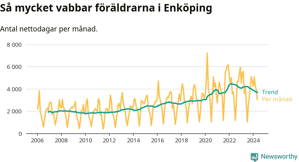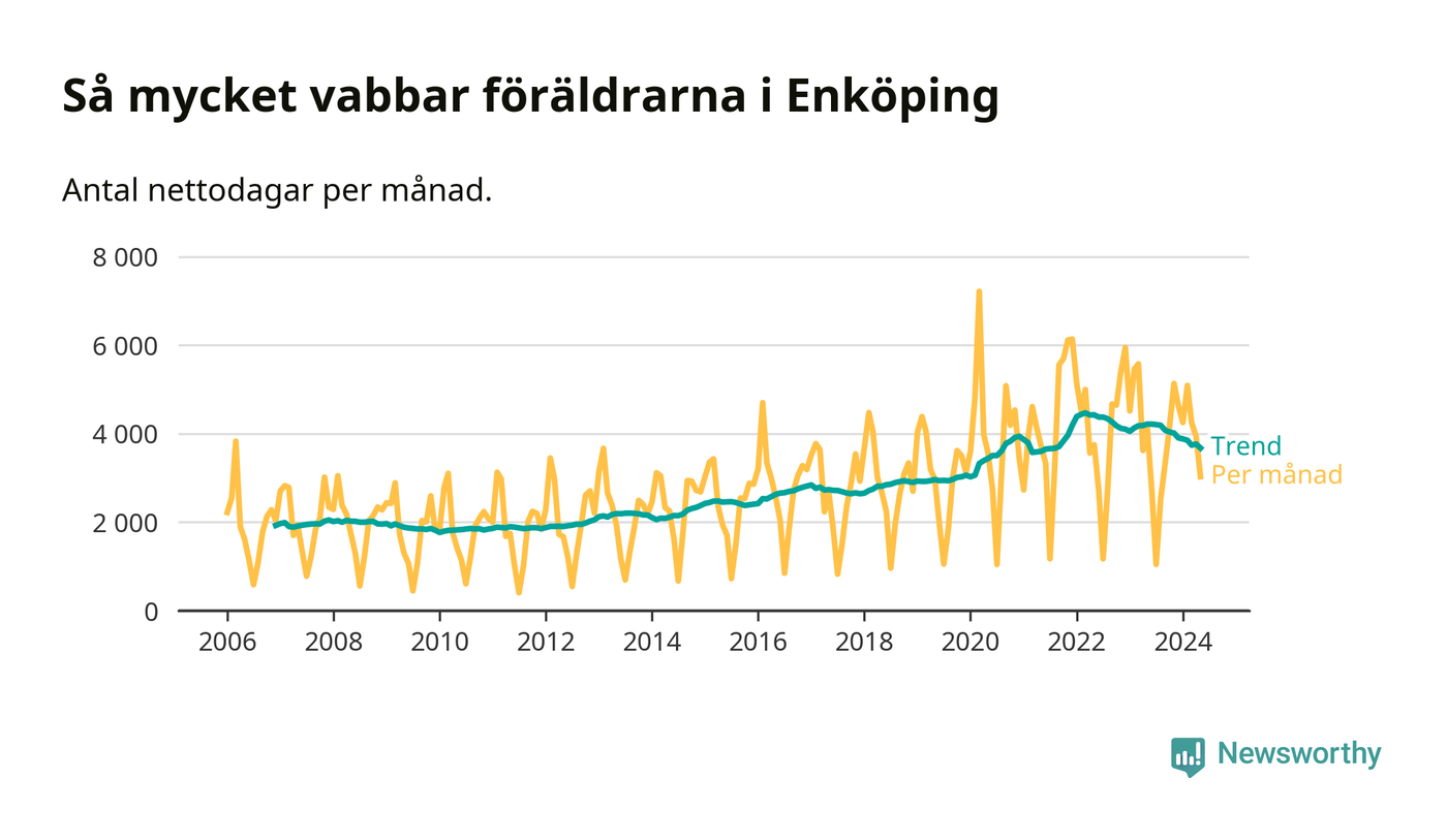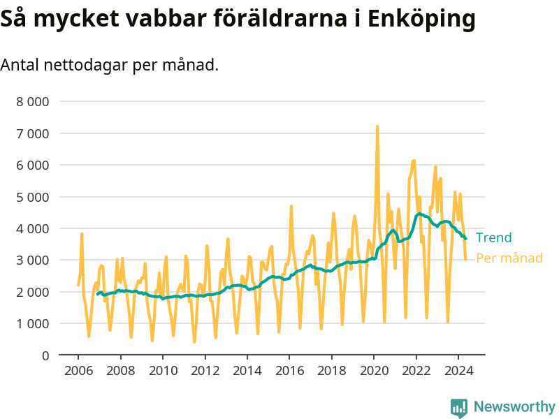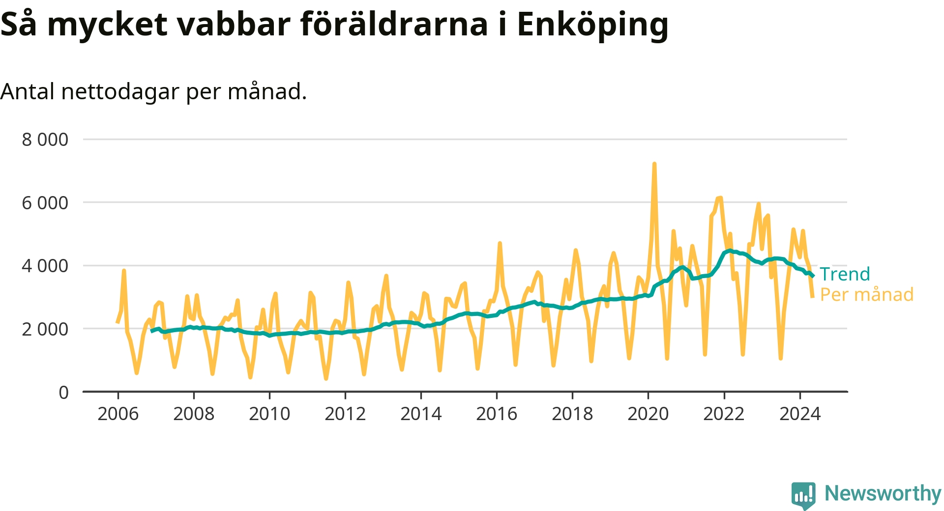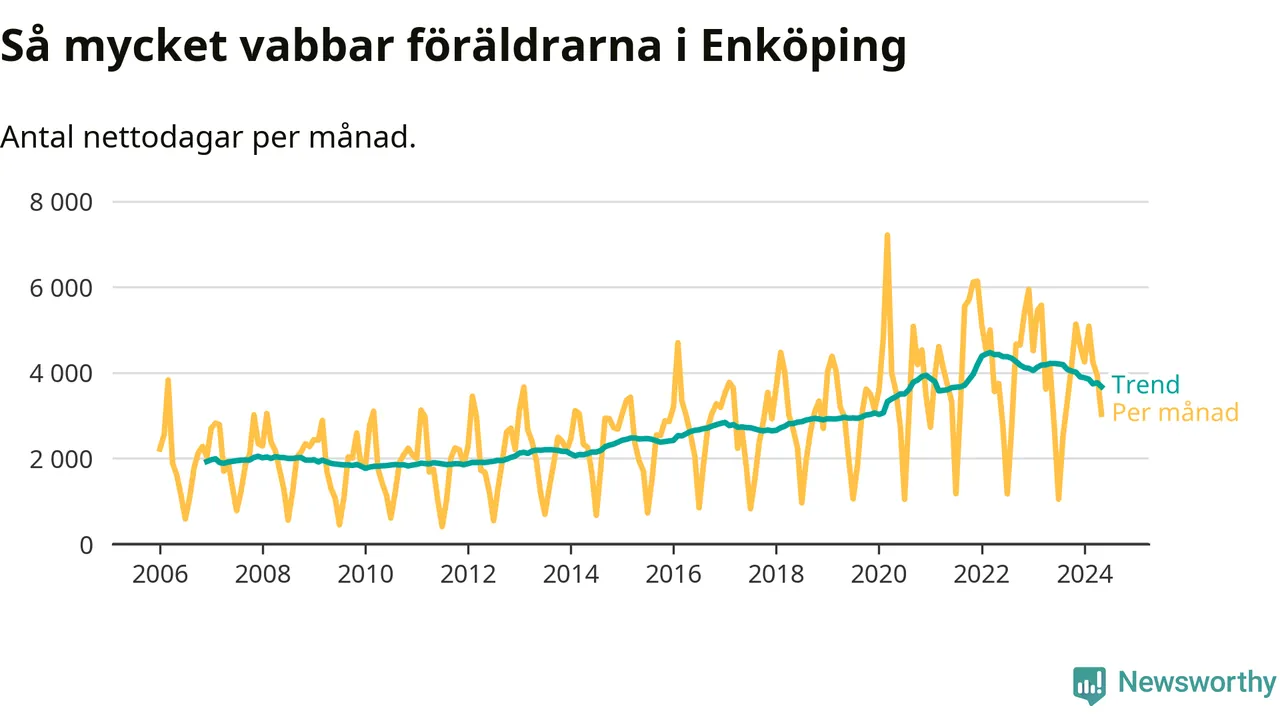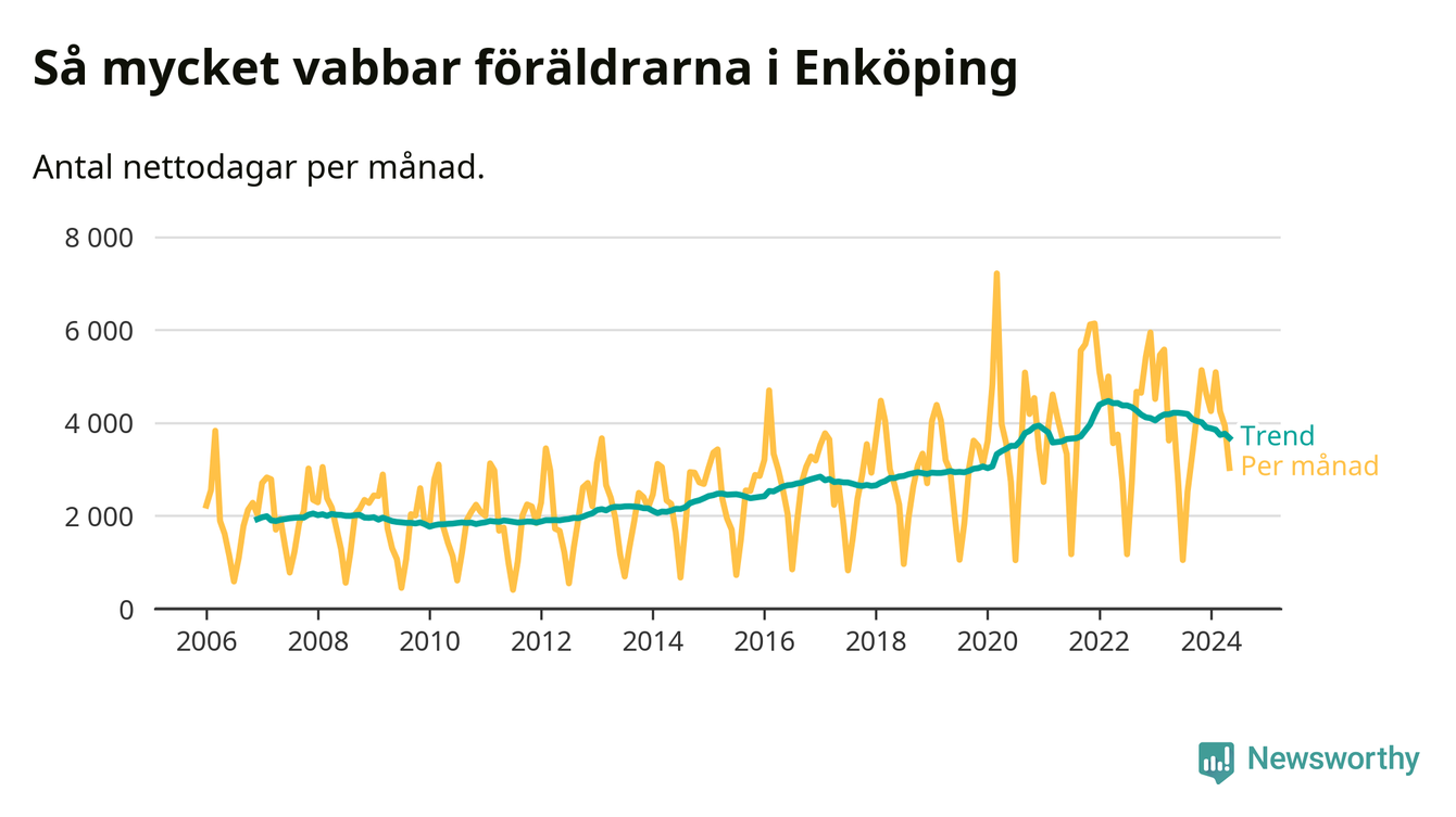 När coronapandemin drog in i mars 2020 peakade antalet vabbdagar både i Enköpings kommun och i riket som helhet. Under de senaste två åren har vabbuttaget börjat minska igen.