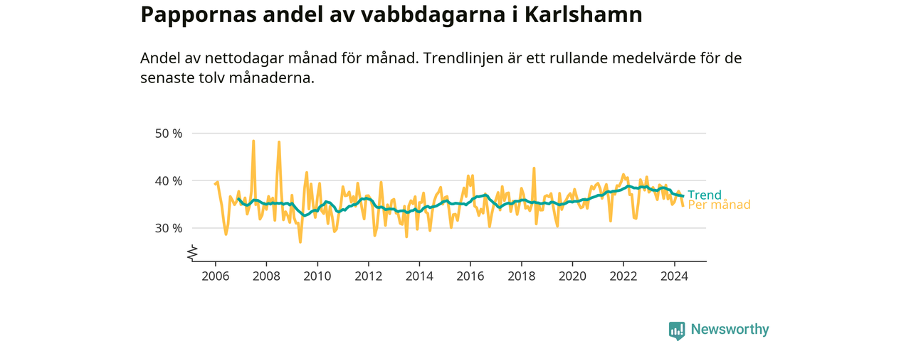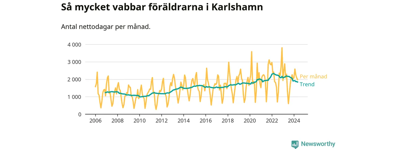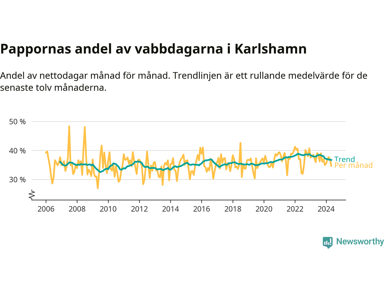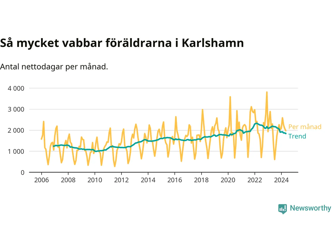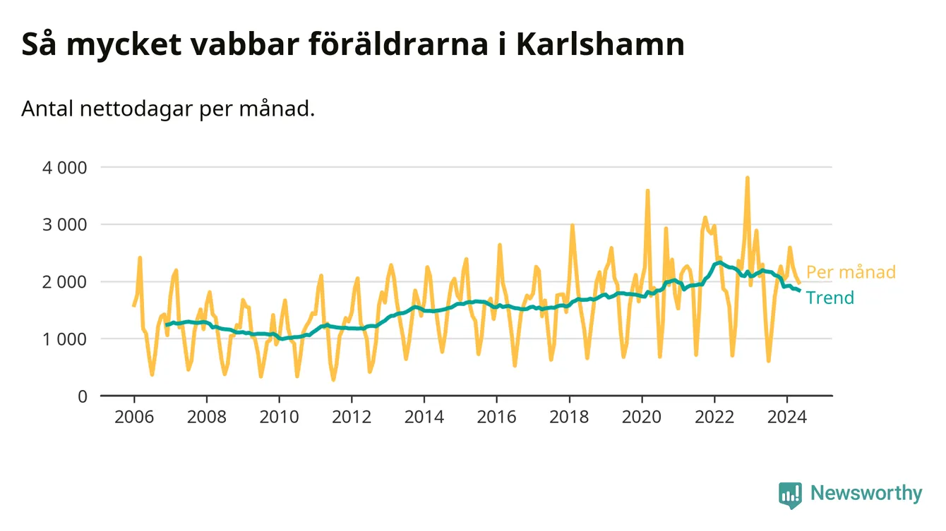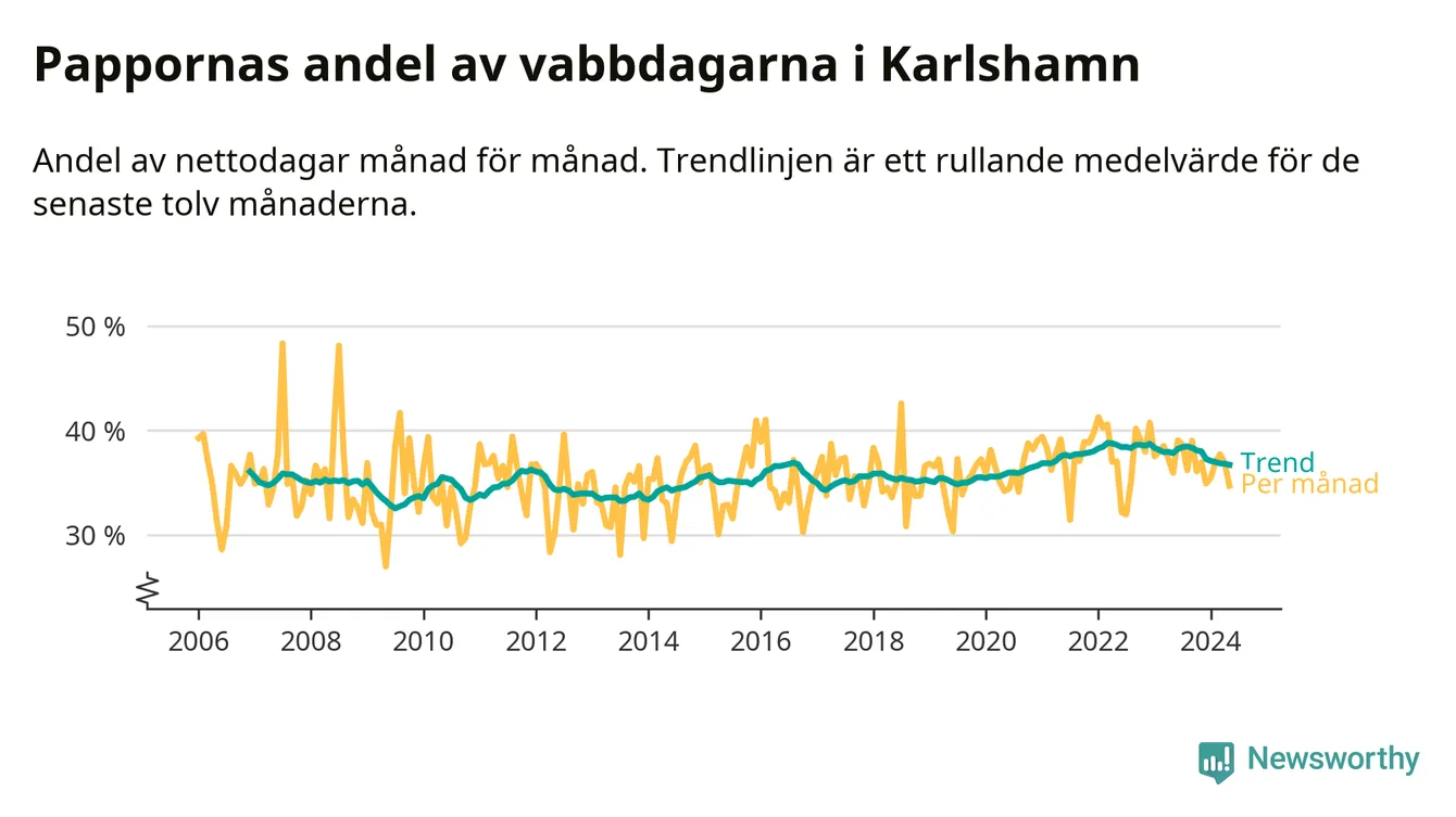 Karlshamn ligger en bit från ett jämställt uttag. Under de senaste tolv månaderna har männen stått för 37 procent av all vabb i kommunen. Pappornas uttag peakade våren 2022 då kommunens fäder var uppe i 39 procent av vabbdagarna 1.