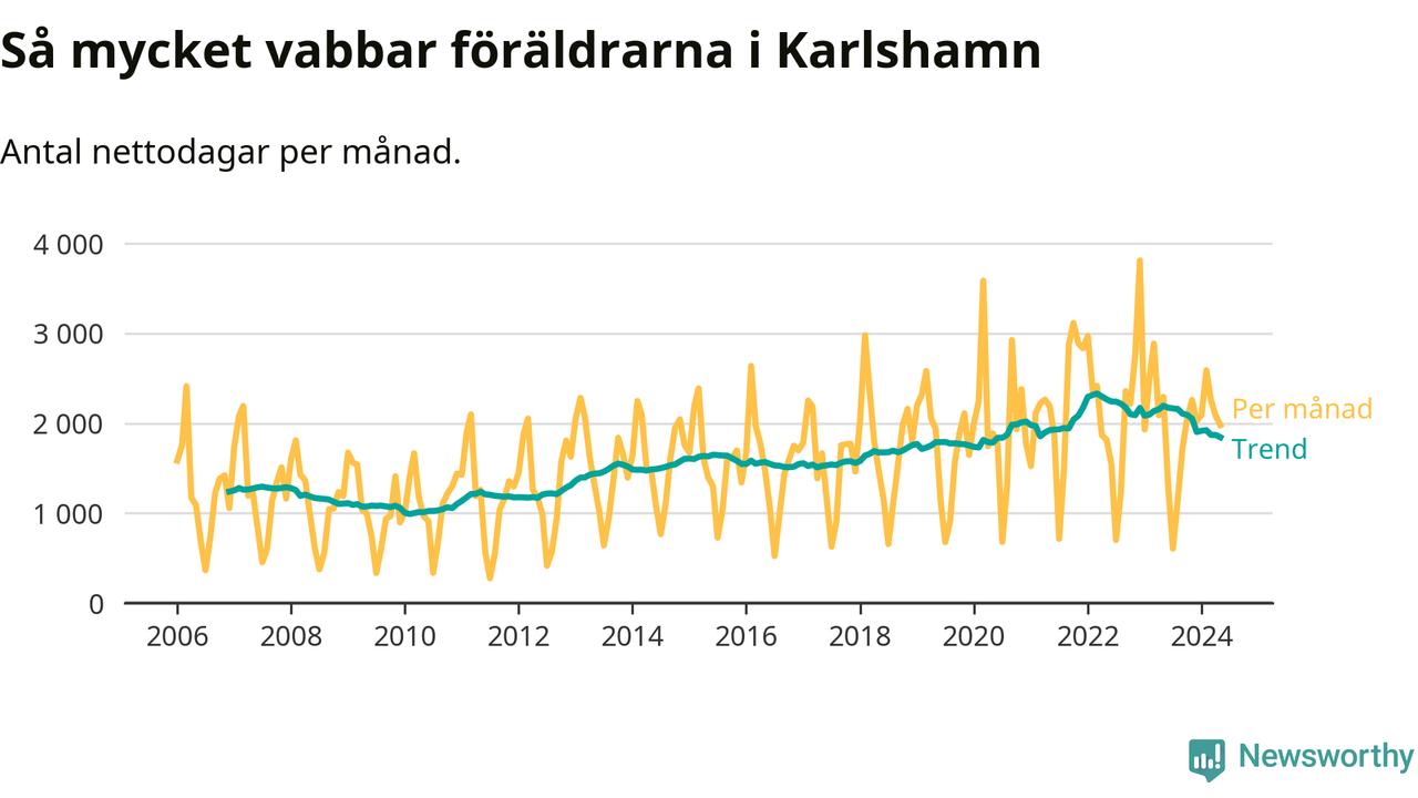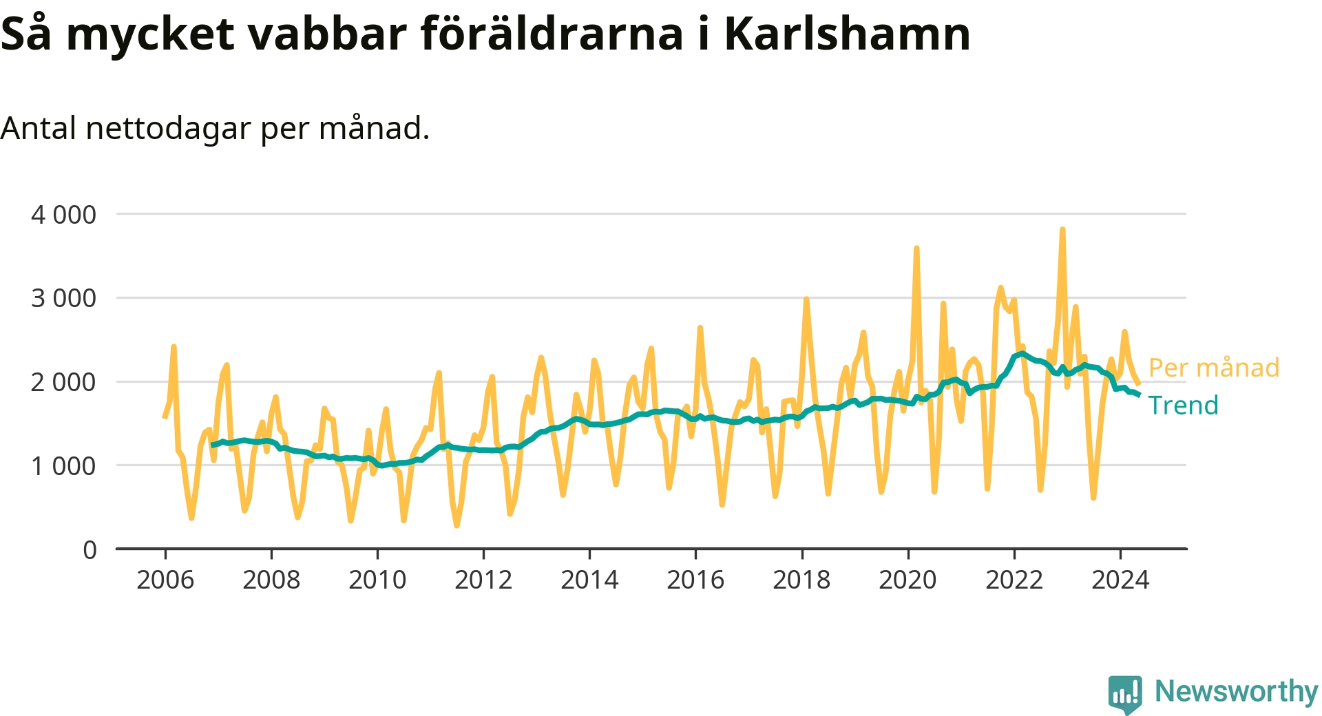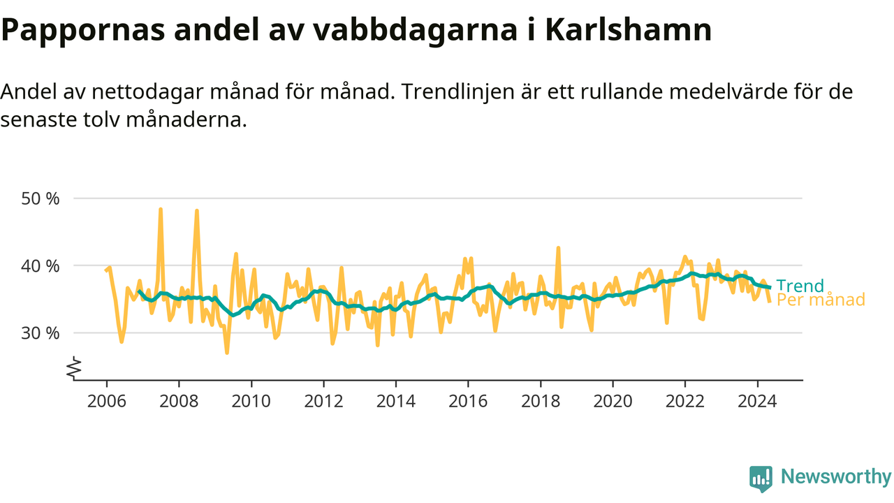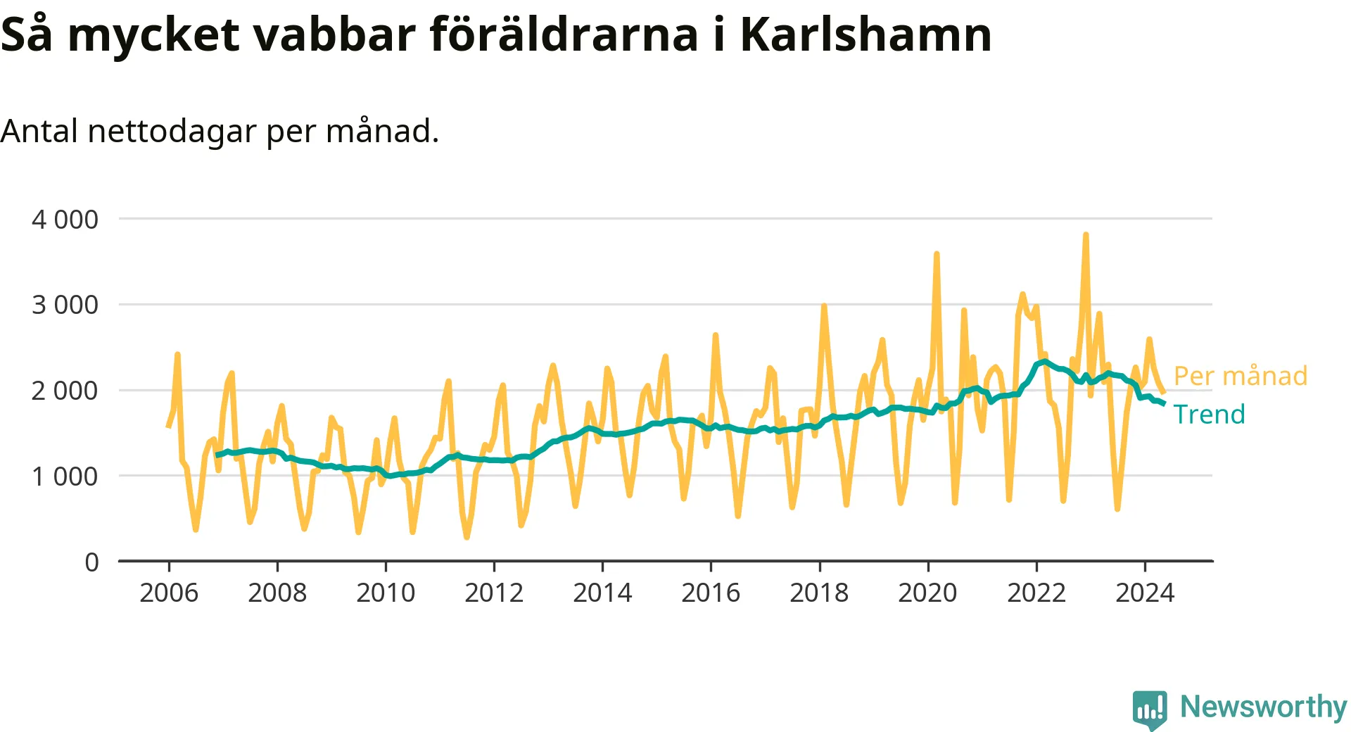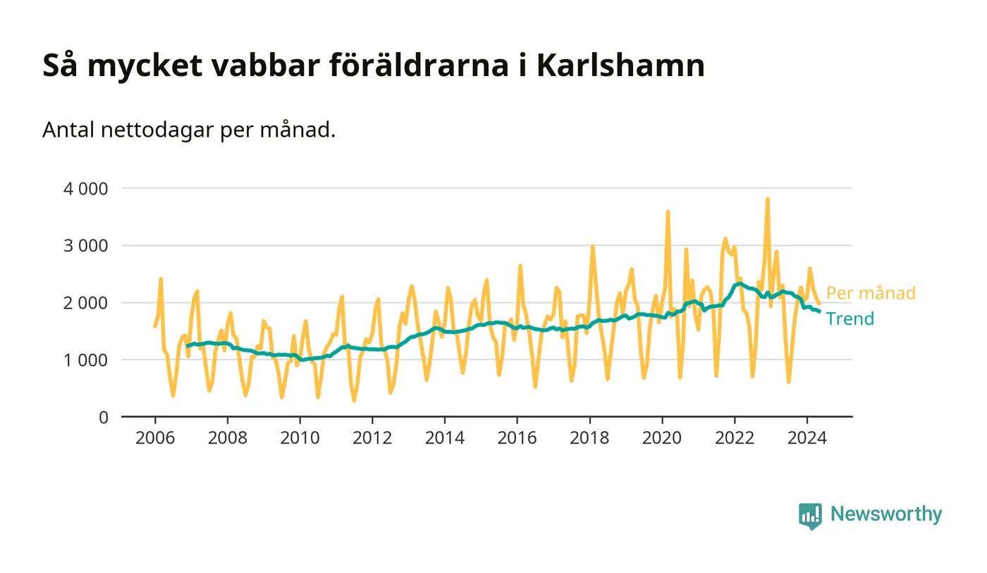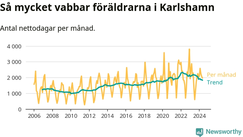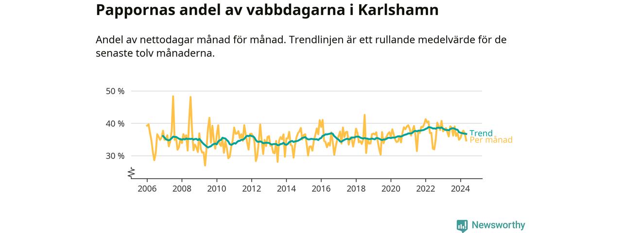 Karlshamn ligger en bit från ett jämställt uttag. Under de senaste tolv månaderna har männen stått för 37 procent av all vabb i kommunen. Pappornas uttag peakade våren 2022 då kommunens fäder var uppe i 39 procent av vabbdagarna 1.