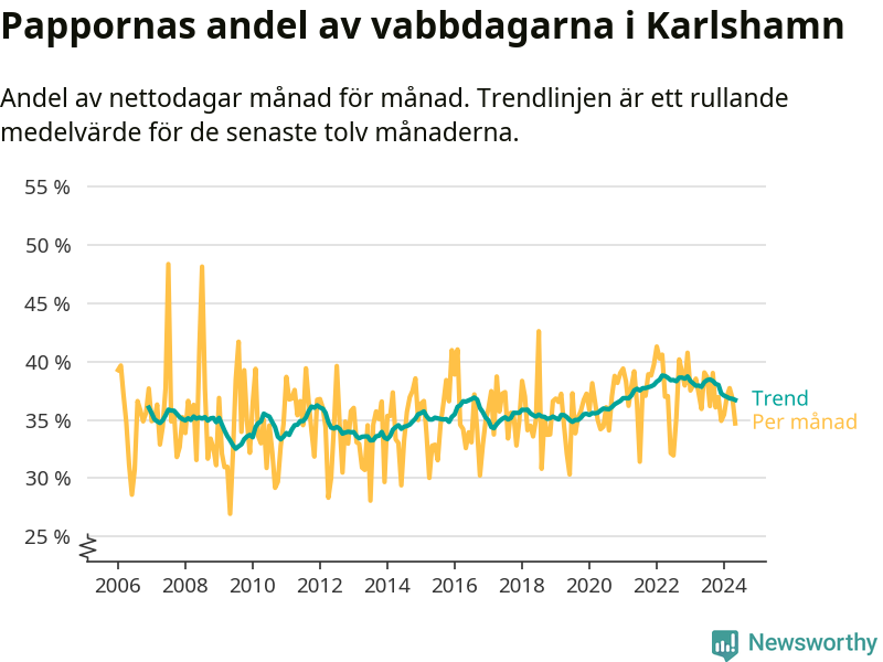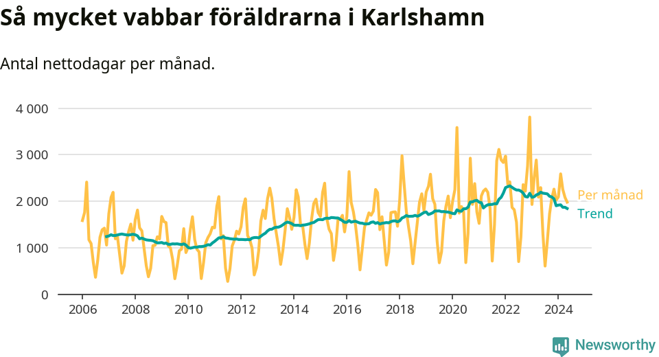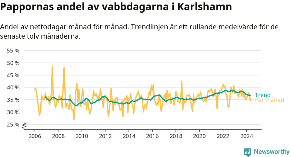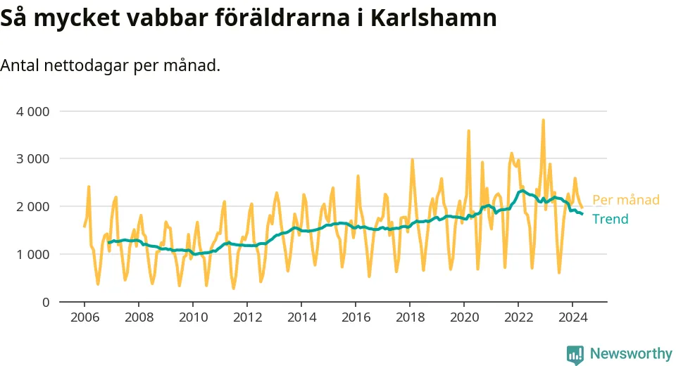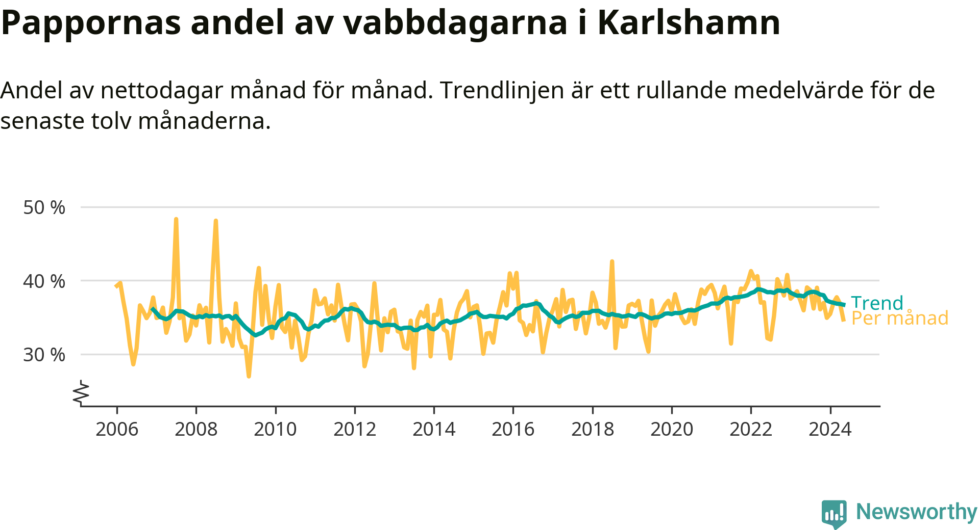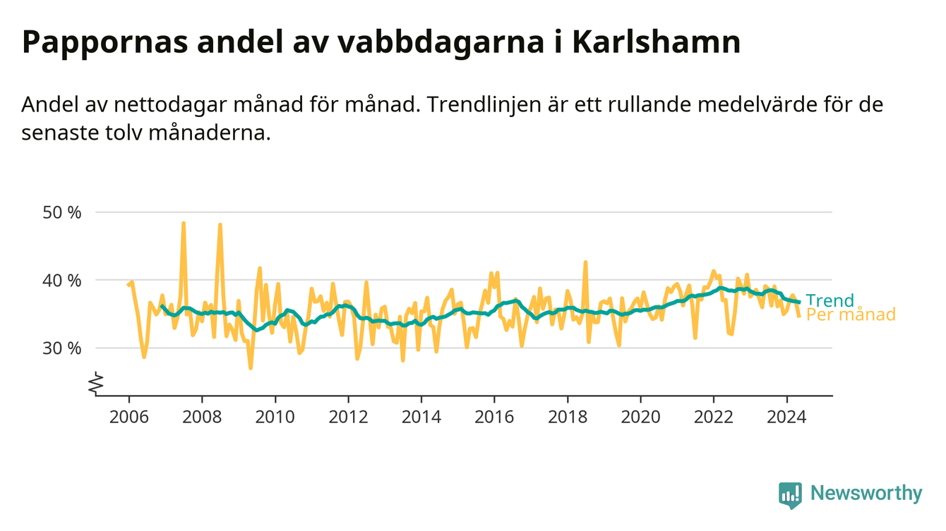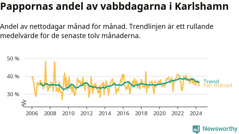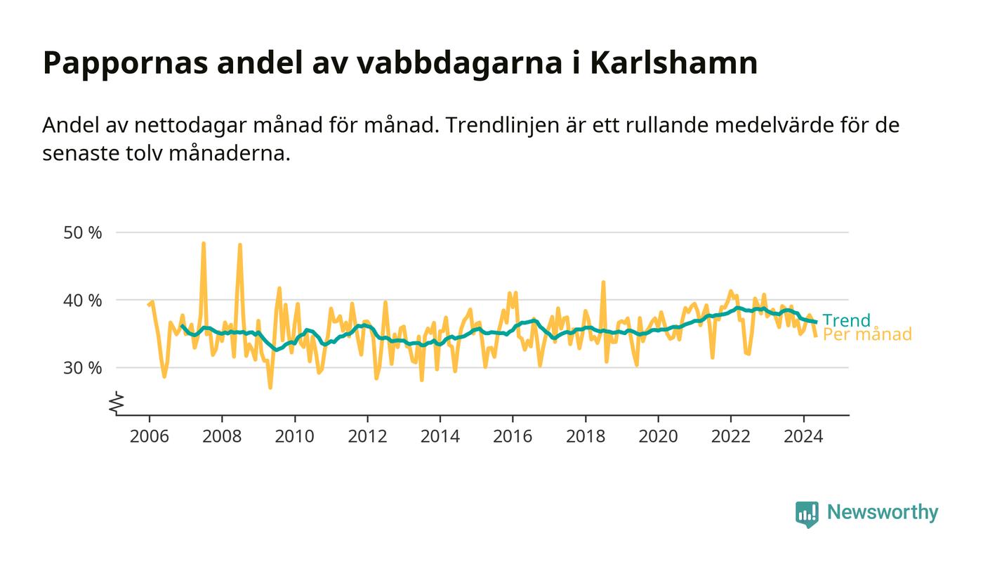 Karlshamn ligger en bit från ett jämställt uttag. Under de senaste tolv månaderna har männen stått för 37 procent av all vabb i kommunen. Pappornas uttag peakade våren 2022 då kommunens fäder var uppe i 39 procent av vabbdagarna 1.