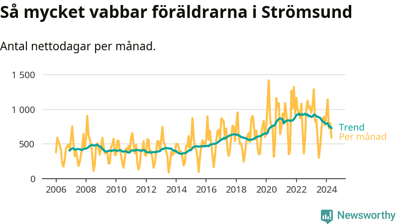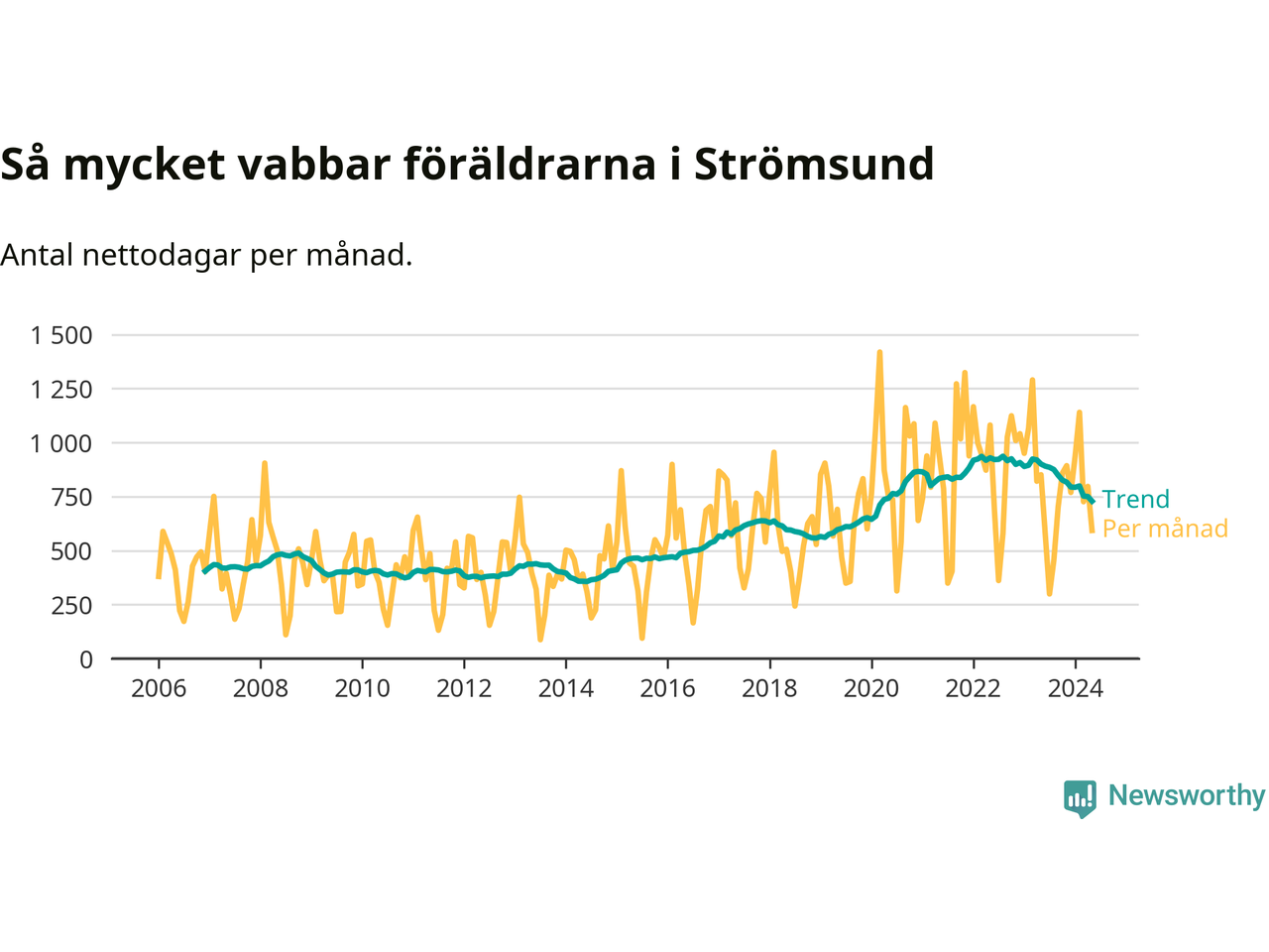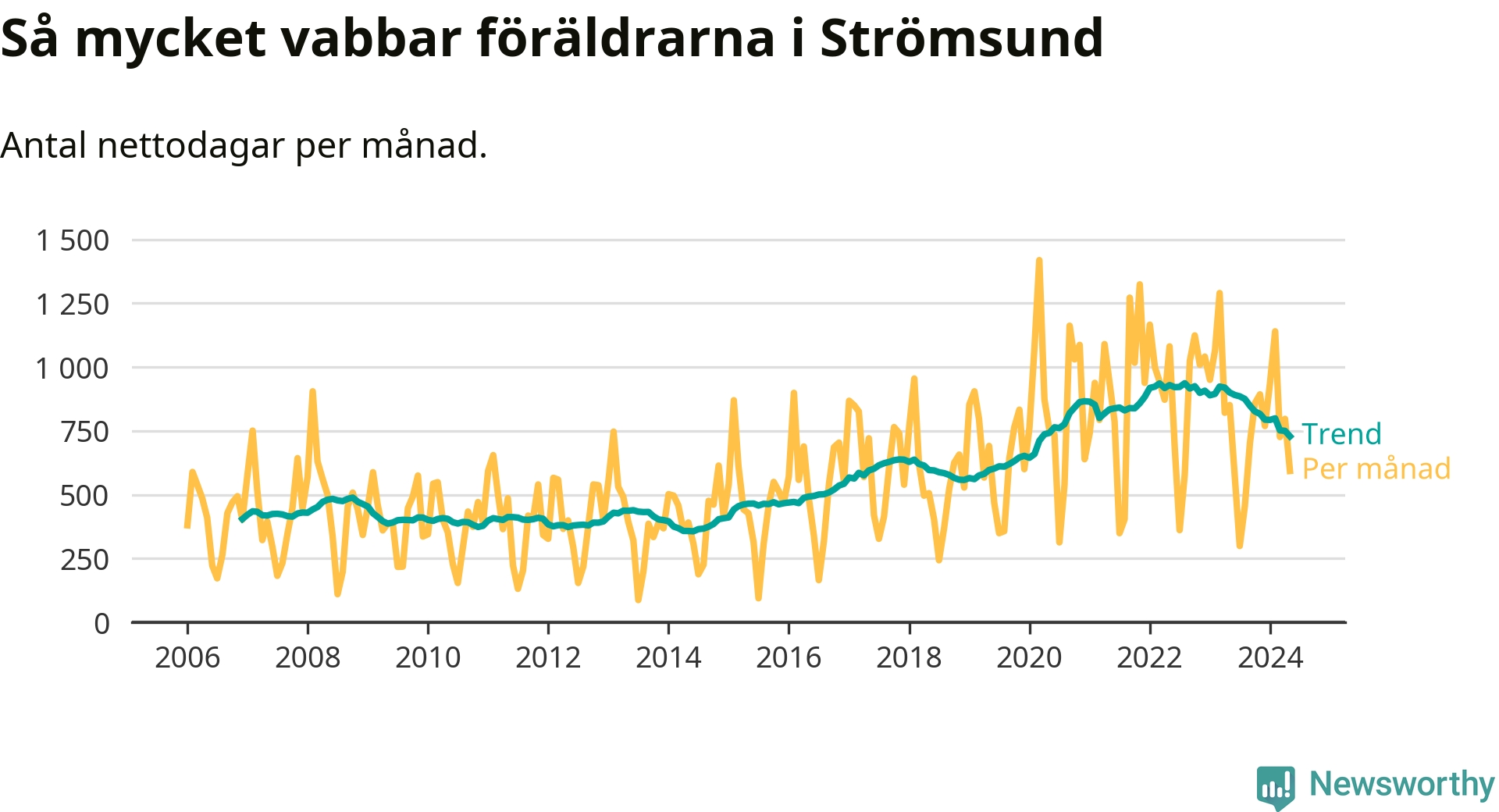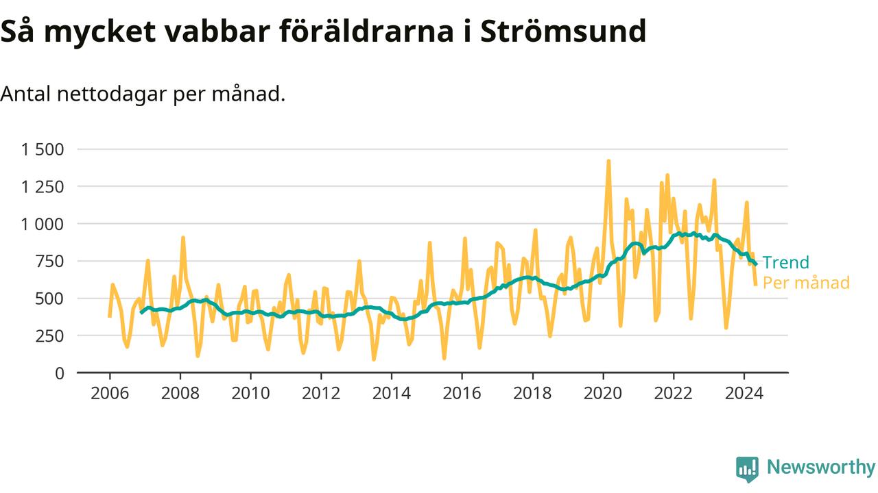 När coronapandemin drog in i mars 2020 peakade antalet vabbdagar både i Strömsunds kommun och i riket som helhet. Under de senaste två åren har vabbuttaget börjat minska igen.