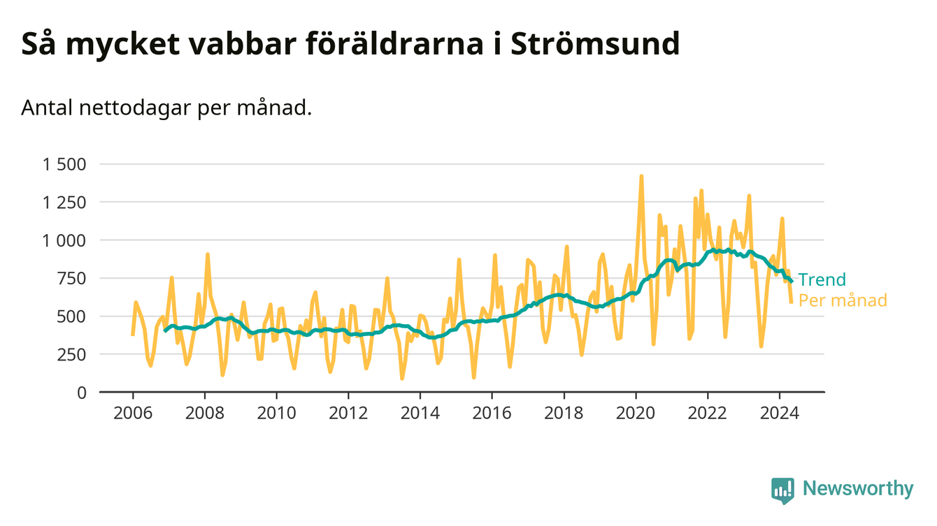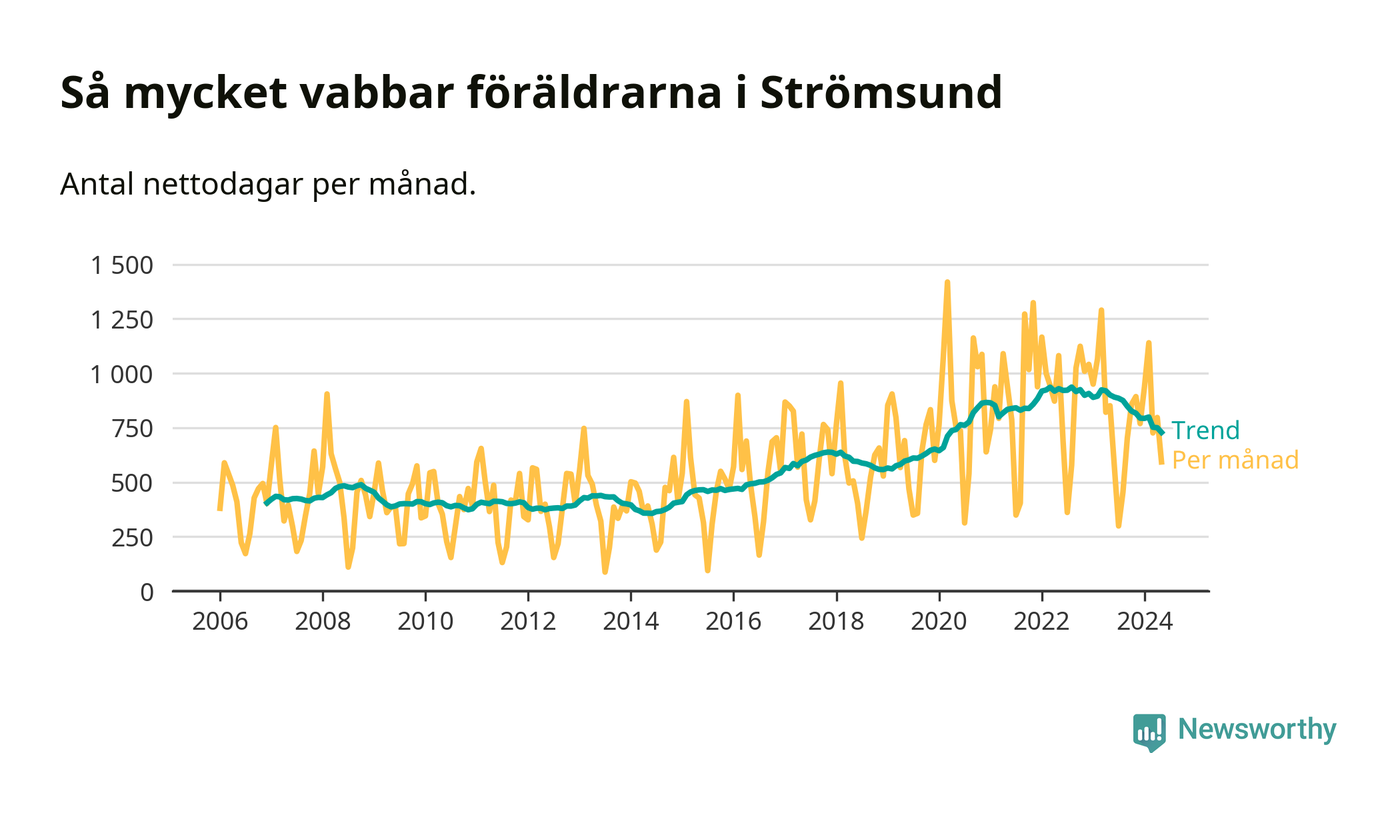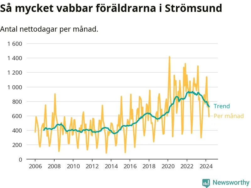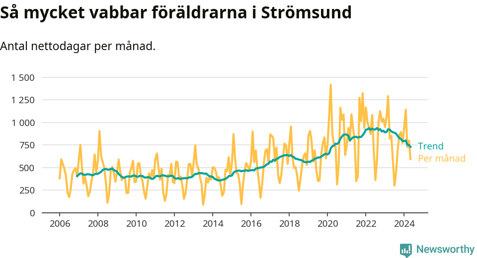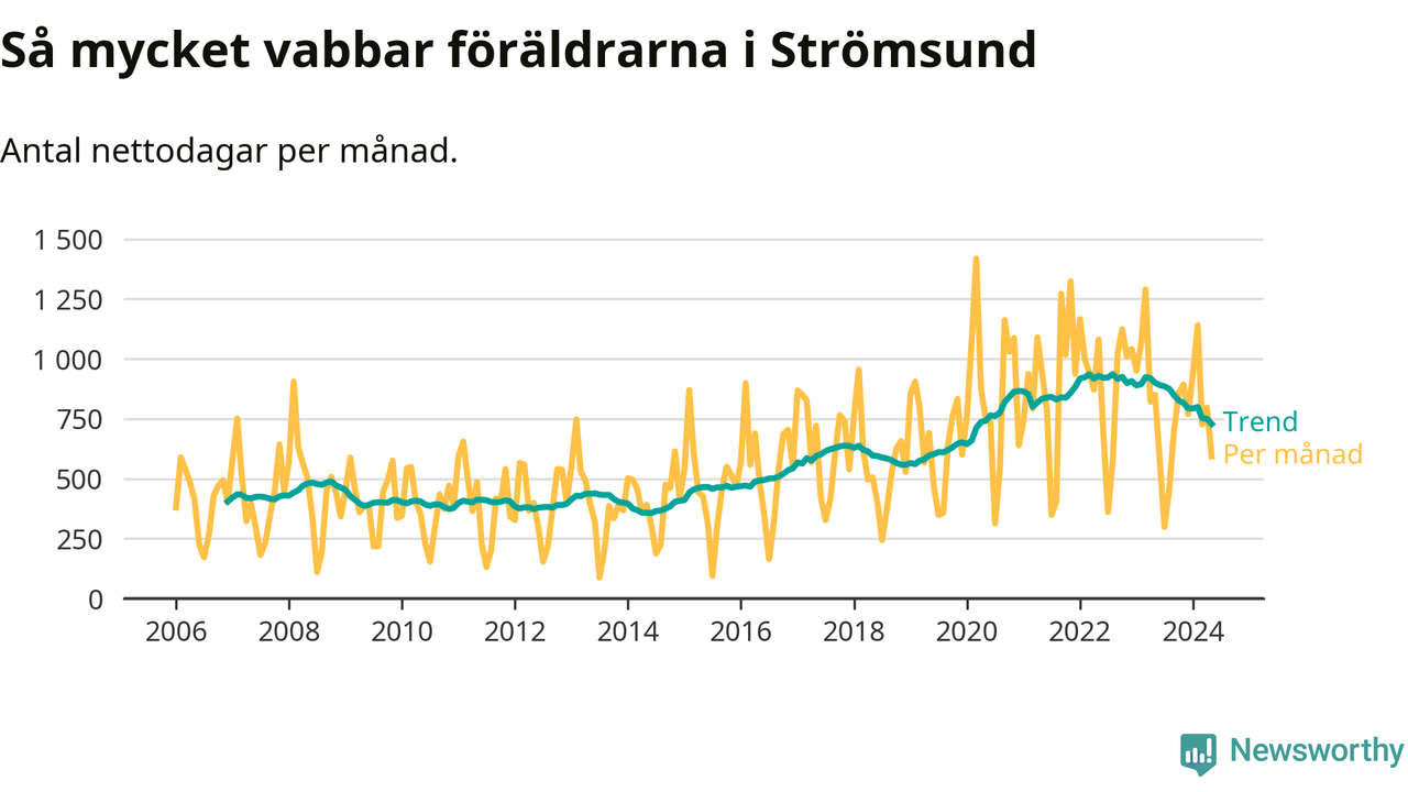 När coronapandemin drog in i mars 2020 peakade antalet vabbdagar både i Strömsunds kommun och i riket som helhet. Under de senaste två åren har vabbuttaget börjat minska igen.