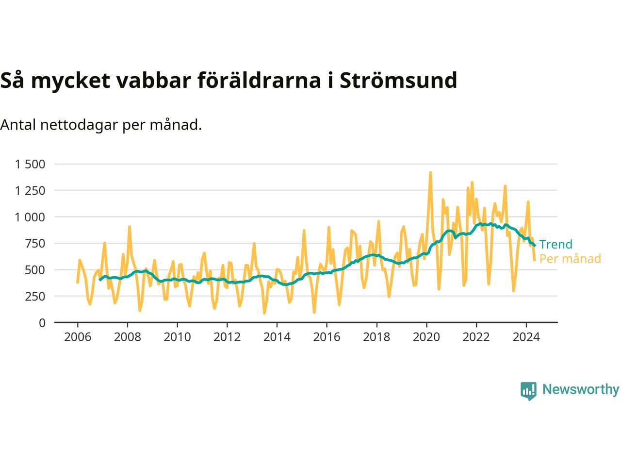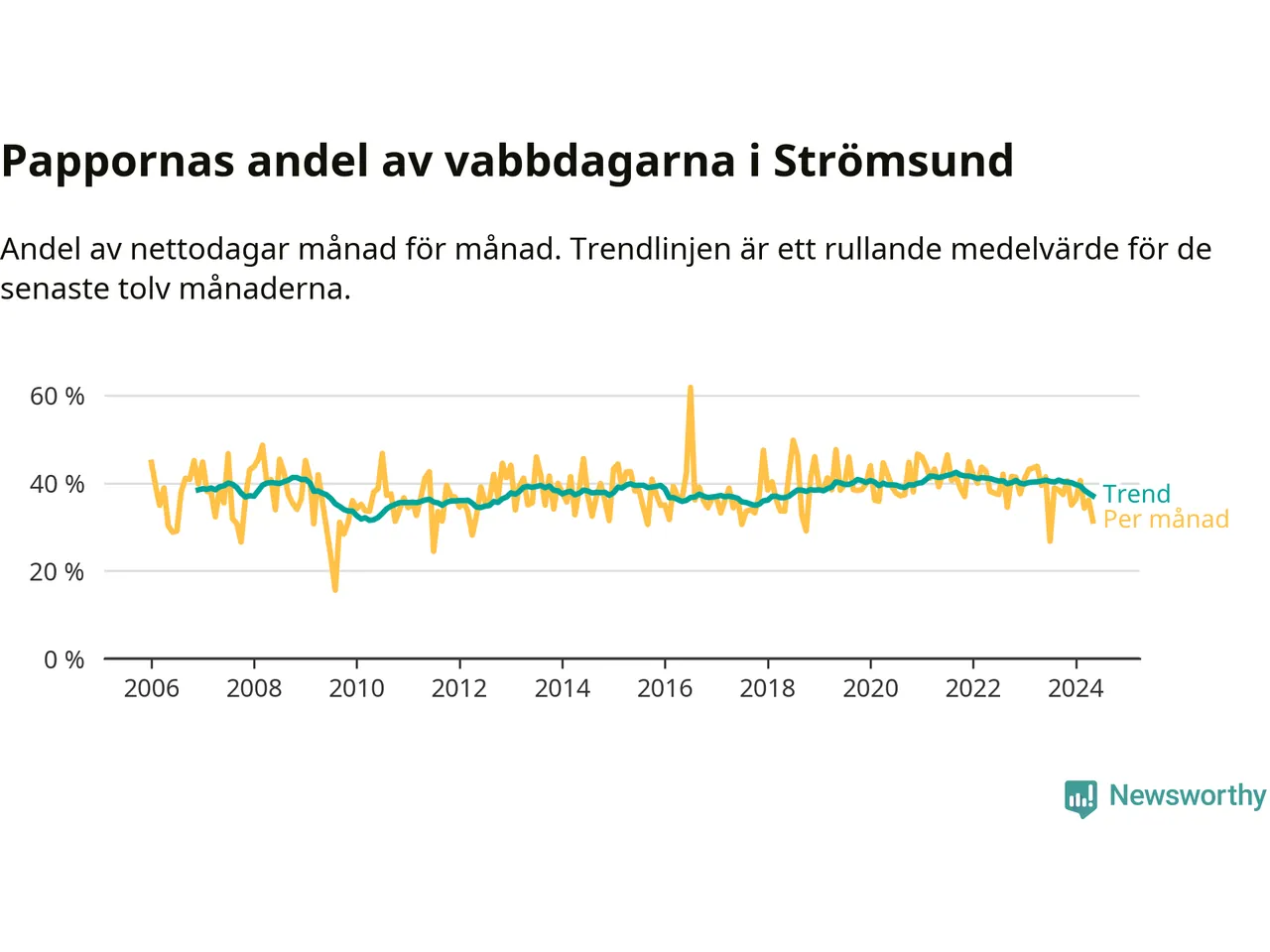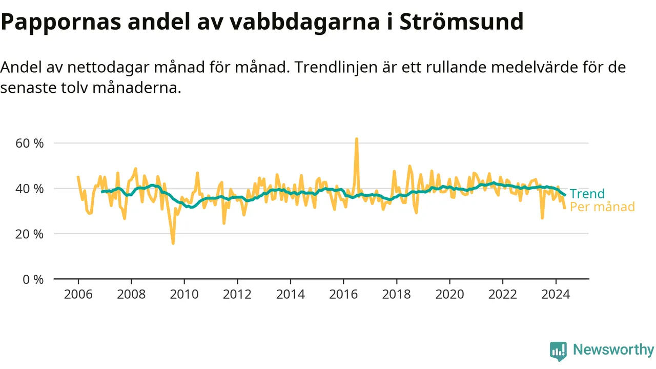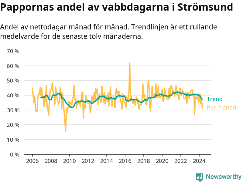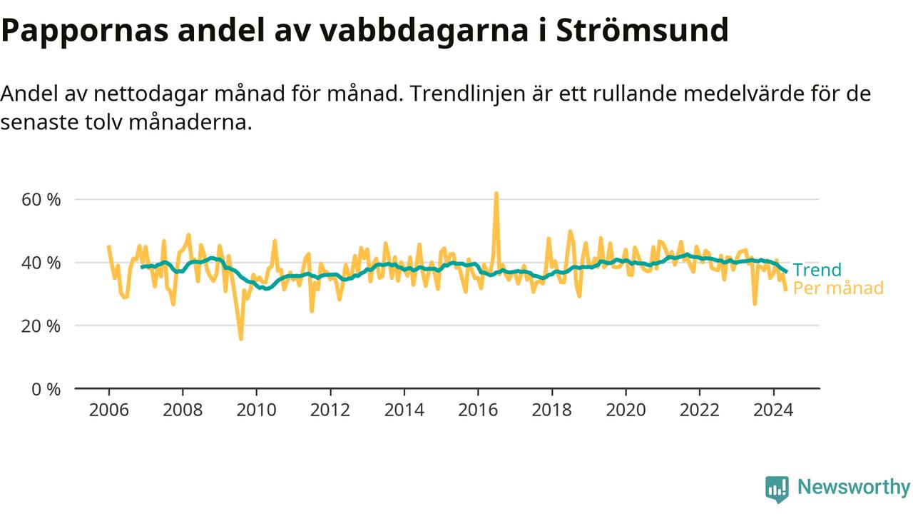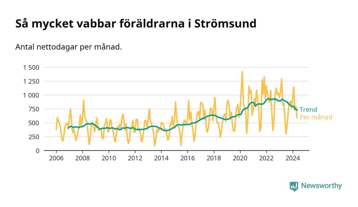 Strömsund ligger en bit från ett jämställt uttag. Under de senaste tolv månaderna har männen stått för 37 procent av all vabb i kommunen. Pappornas uttag peakade hösten 2021 då kommunens fäder var uppe i 42 procent av vabbdagarna 1.