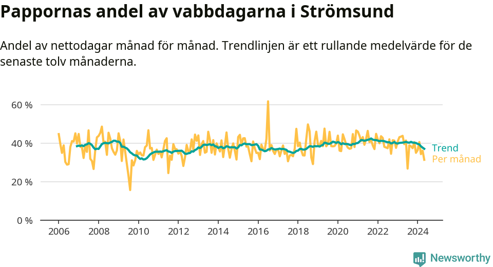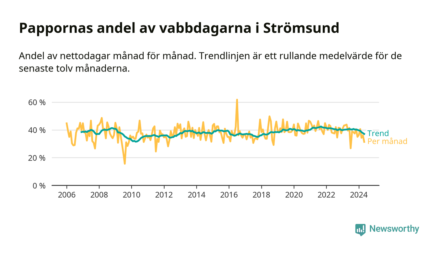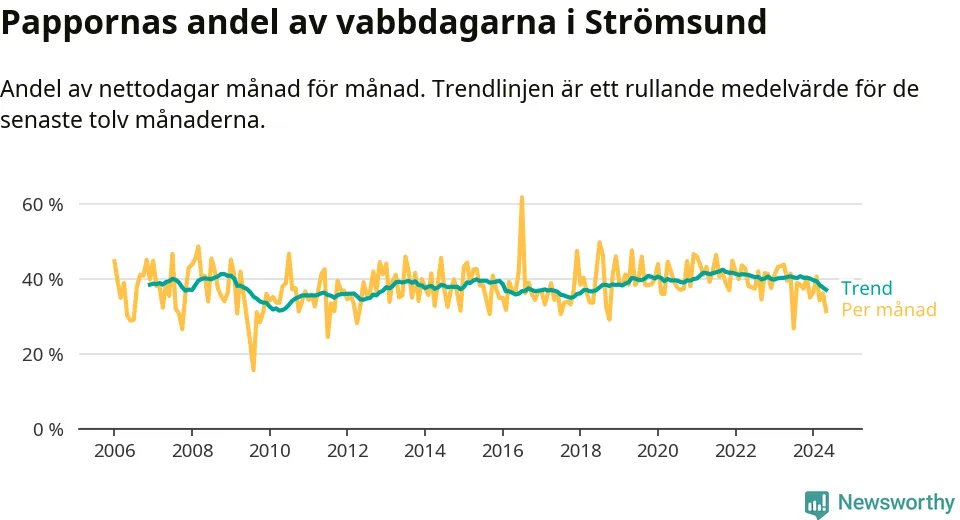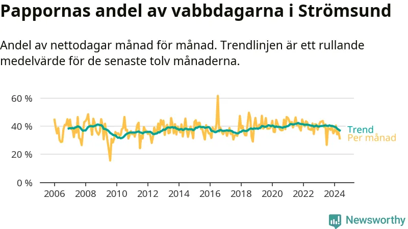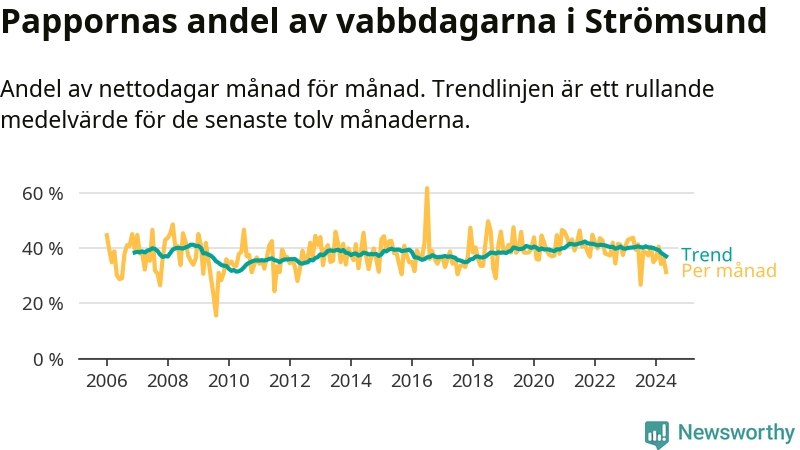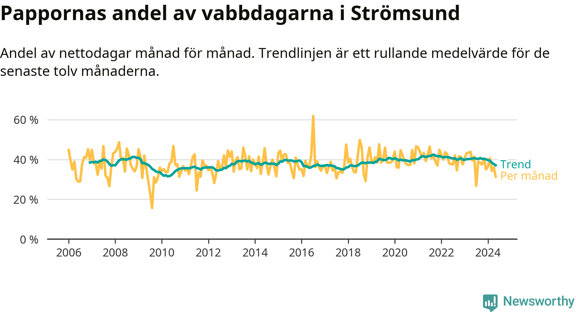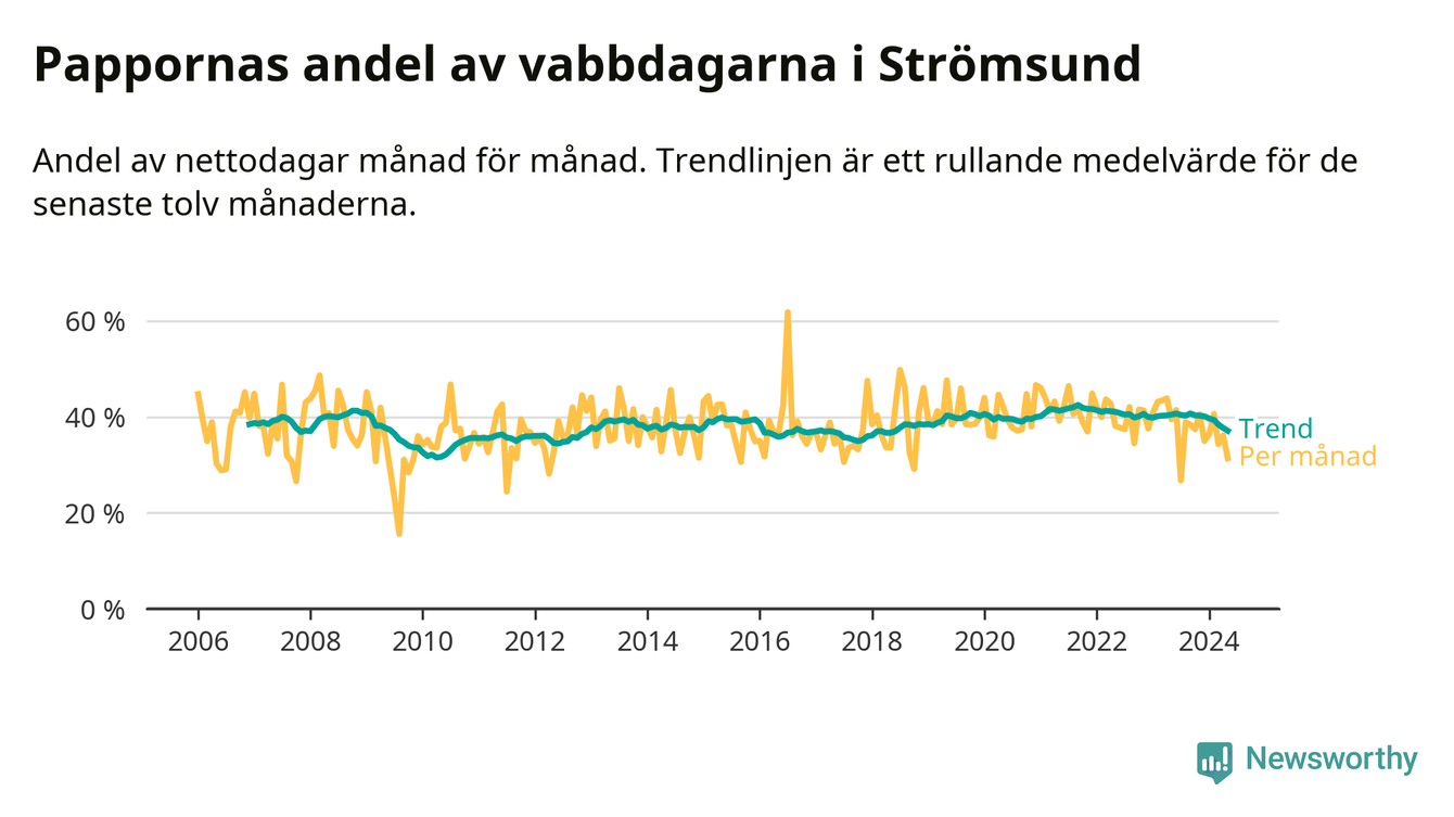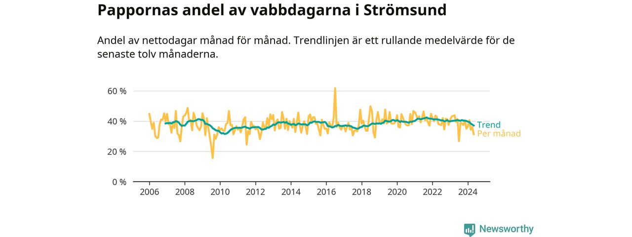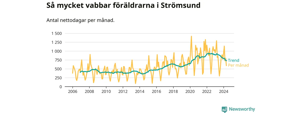 Strömsund ligger en bit från ett jämställt uttag. Under de senaste tolv månaderna har männen stått för 37 procent av all vabb i kommunen. Pappornas uttag peakade hösten 2021 då kommunens fäder var uppe i 42 procent av vabbdagarna 1.