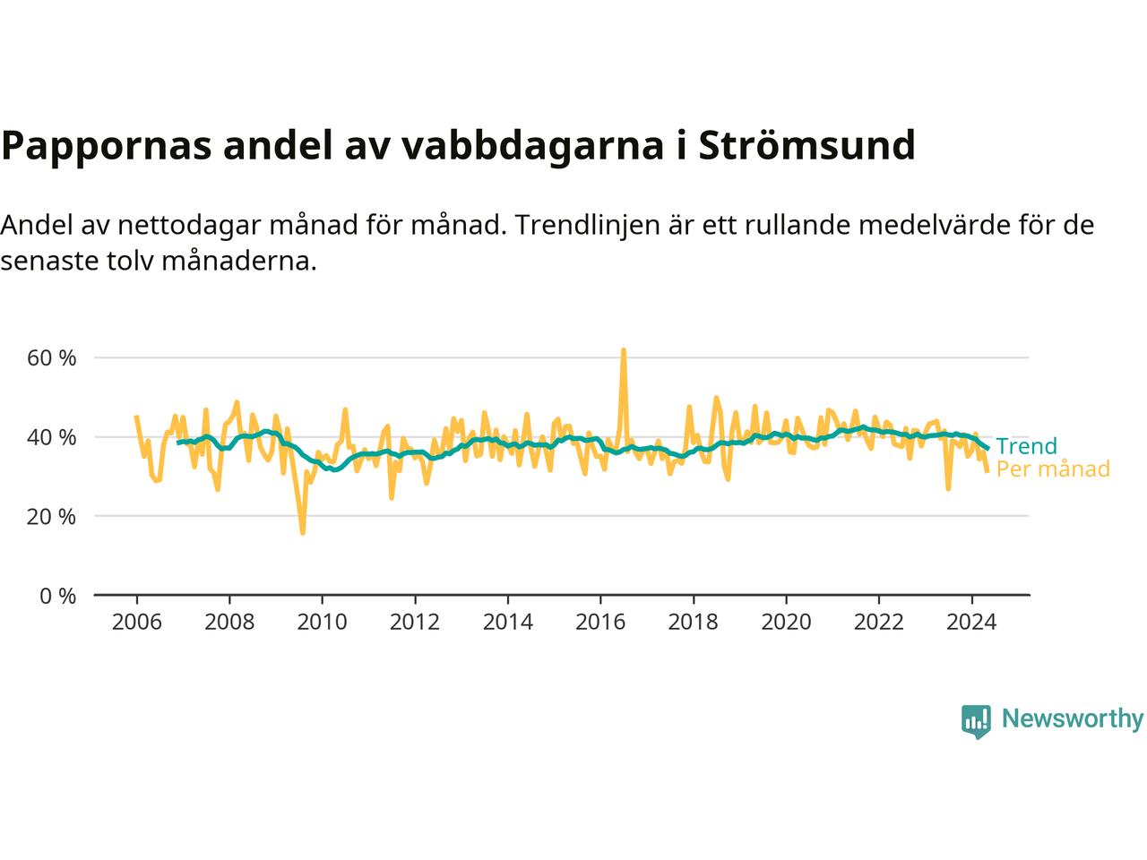 Pappor i Strömsund vabbar ungefär som rikssnittet och som andra män i Jämtlands län. Andelen är näst minst i länet. Skillnaderna inom landet är stora. Ingen kommun i landet når 50–50-fördelning. I Markaryd har papporna tagit ut 45 procent av alla vabbdagar under det senaste året. Det är mest i landet.