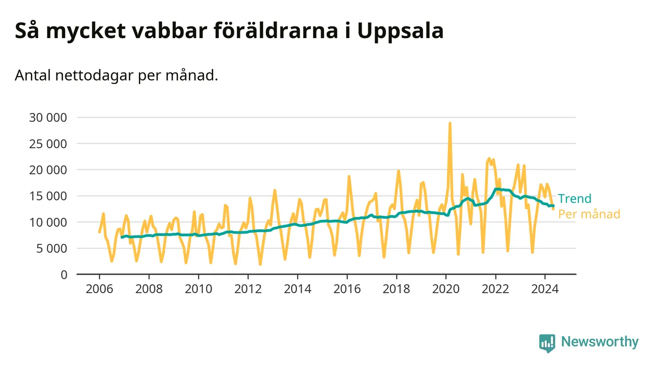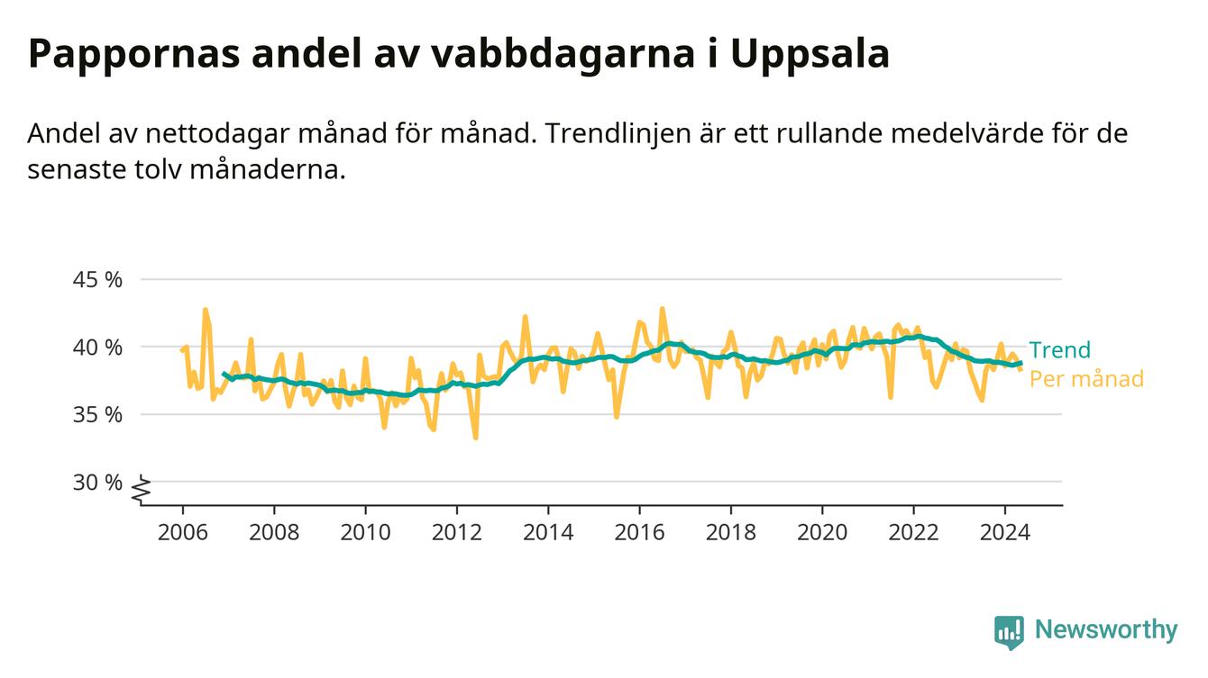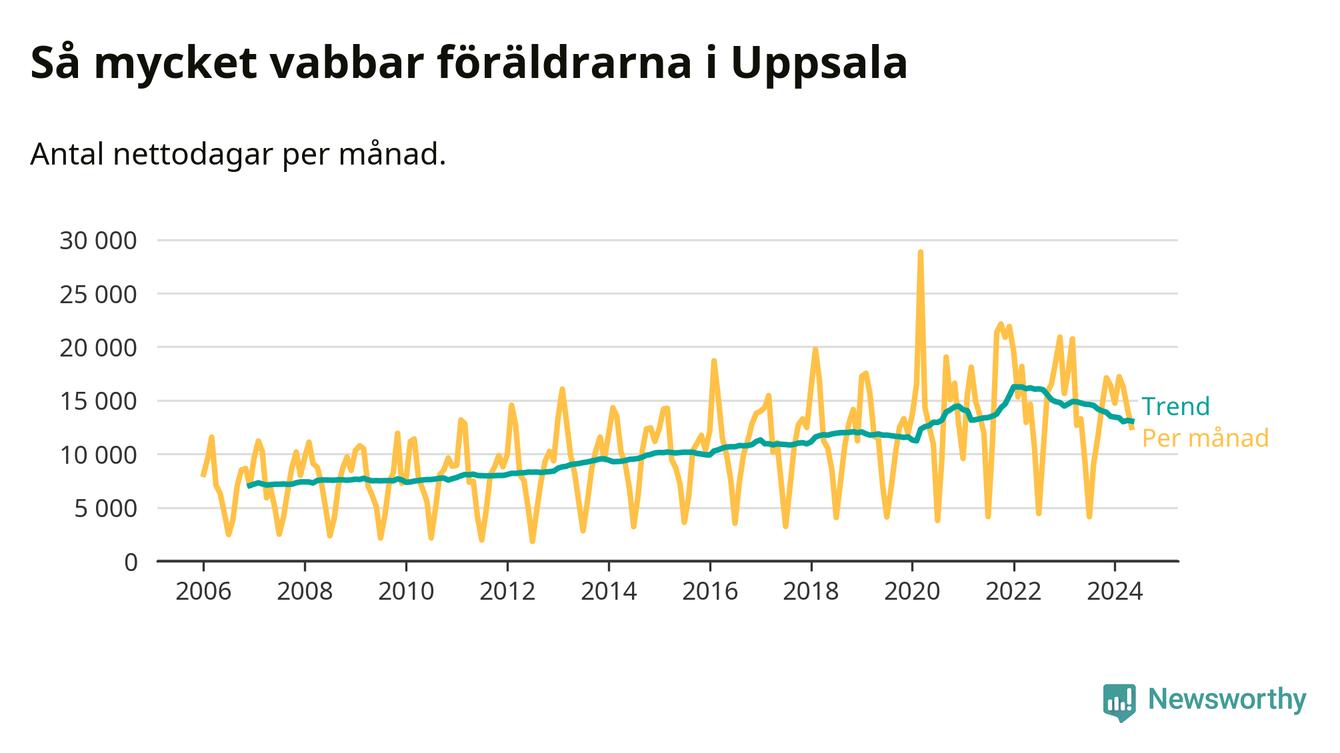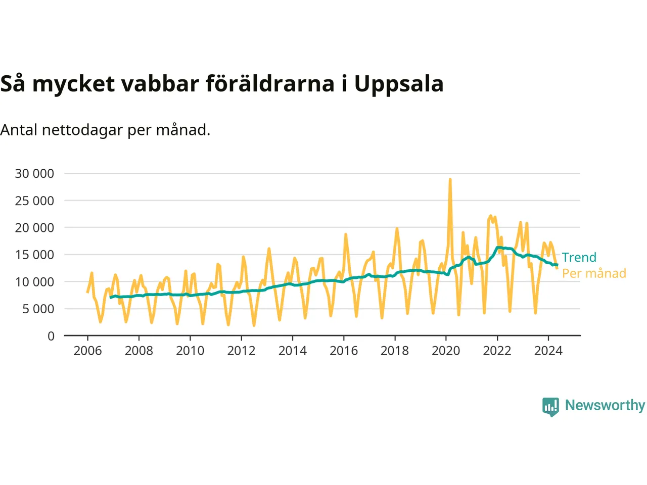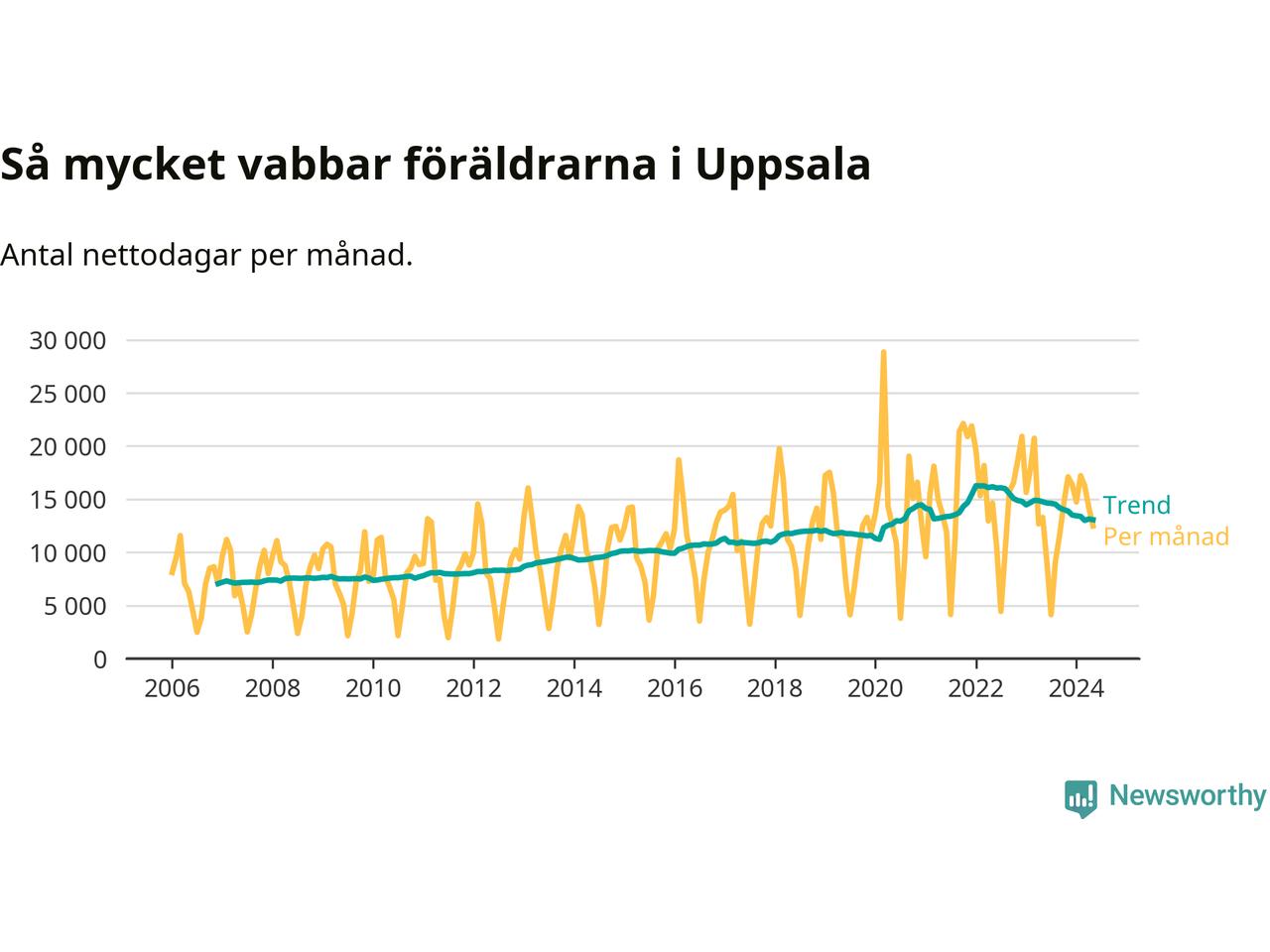 När coronapandemin drog in i mars 2020 peakade antalet vabbdagar både i Uppsala kommun och i riket som helhet. Under de senaste två åren har vabbuttaget börjat minska igen.
