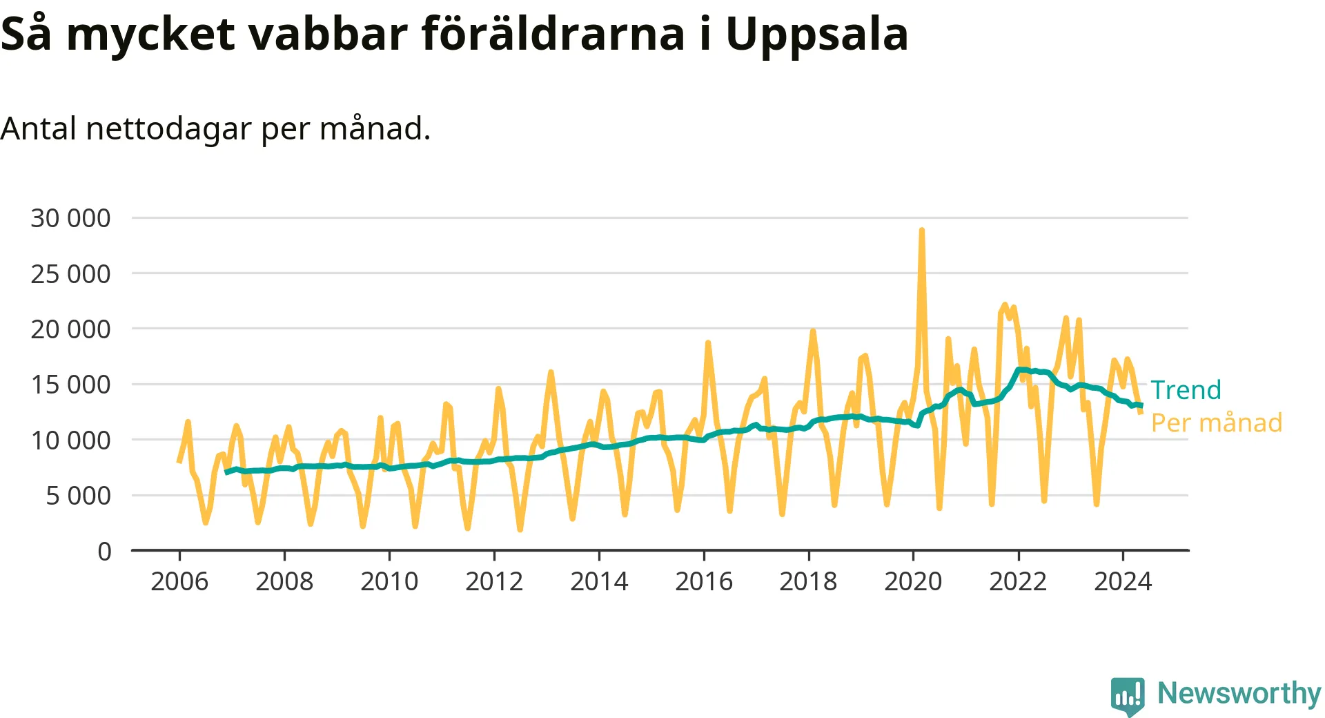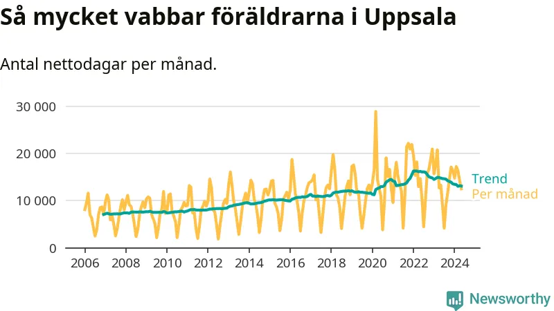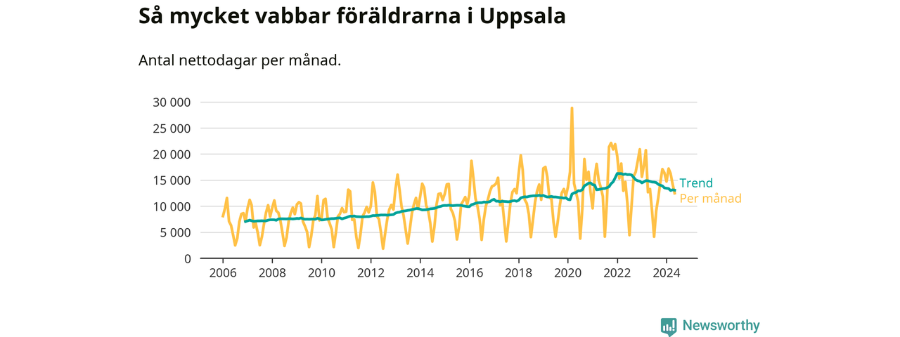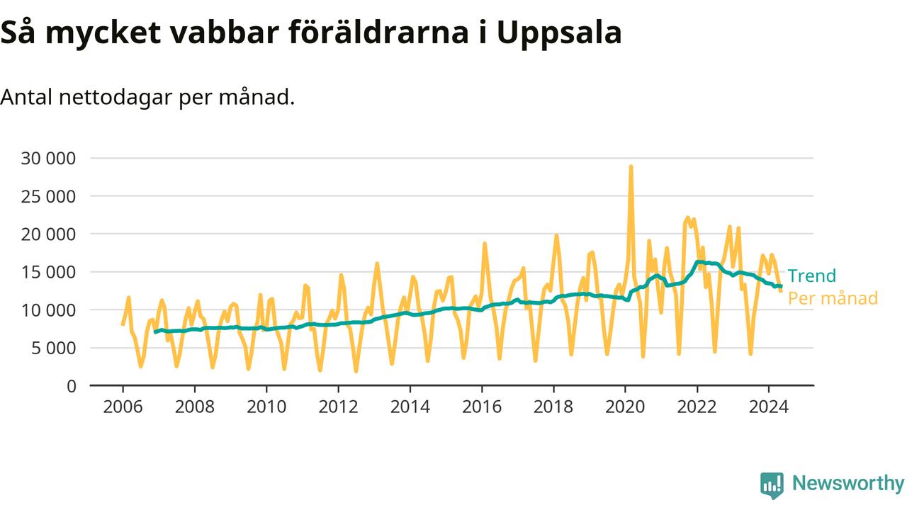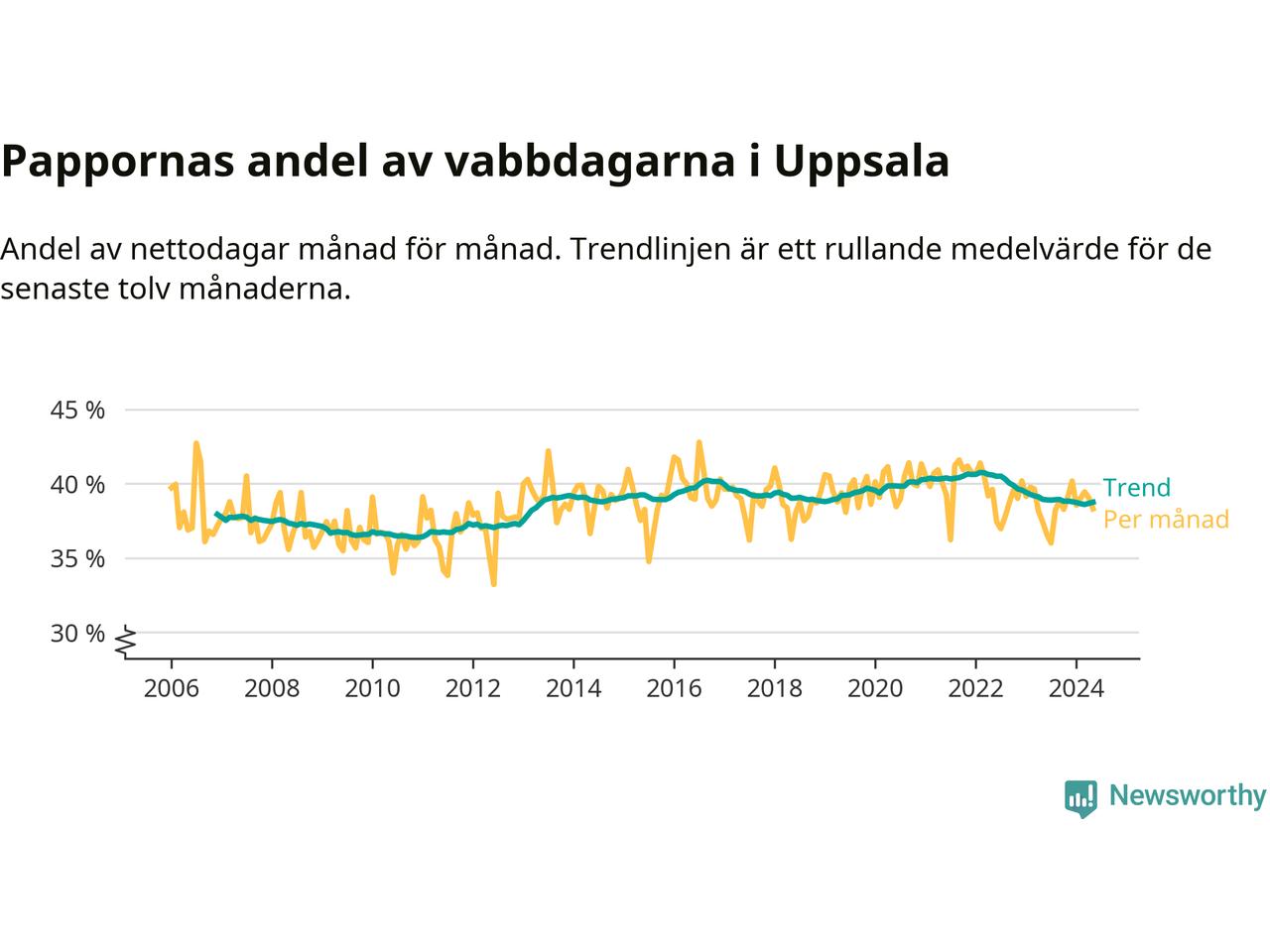 När coronapandemin drog in i mars 2020 peakade antalet vabbdagar både i Uppsala kommun och i riket som helhet. Under de senaste två åren har vabbuttaget börjat minska igen.