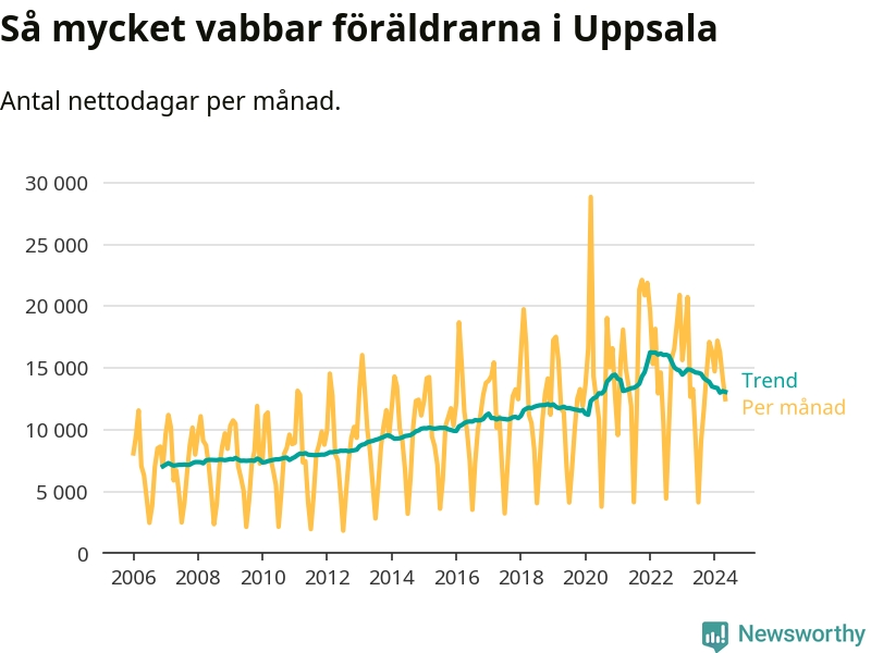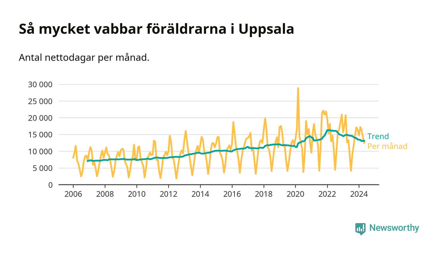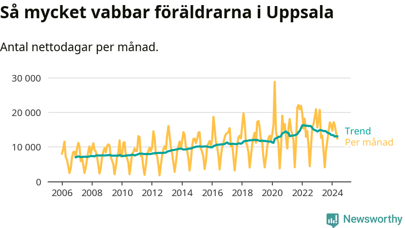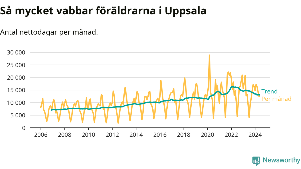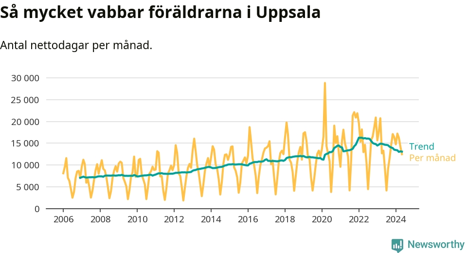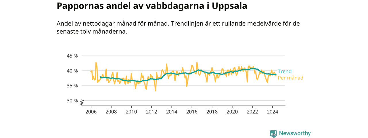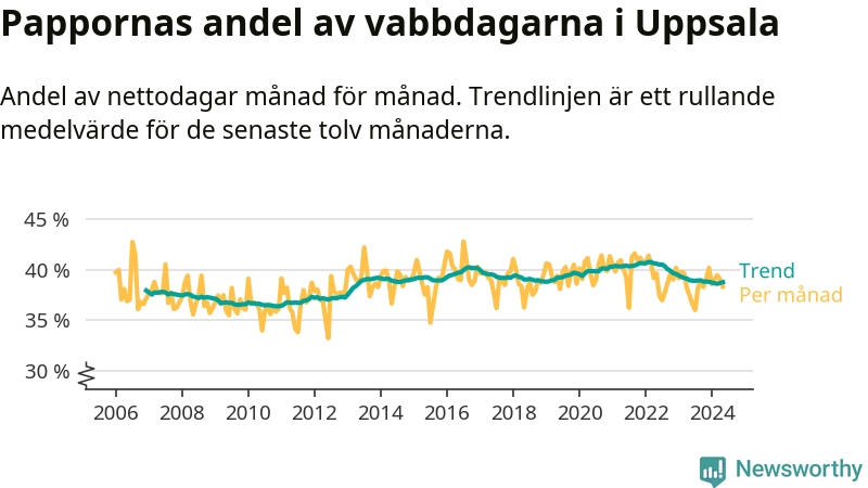 När coronapandemin drog in i mars 2020 peakade antalet vabbdagar både i Uppsala kommun och i riket som helhet. Under de senaste två åren har vabbuttaget börjat minska igen.