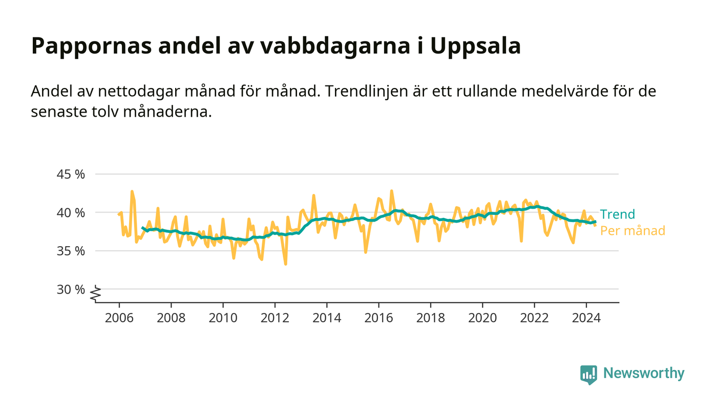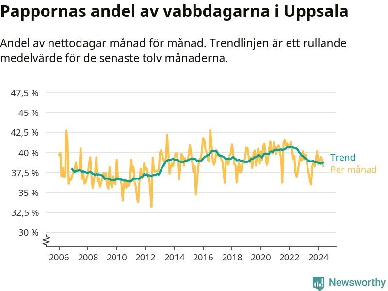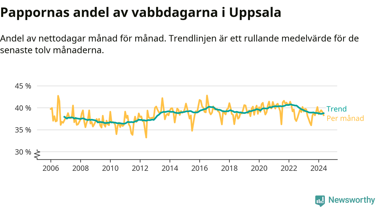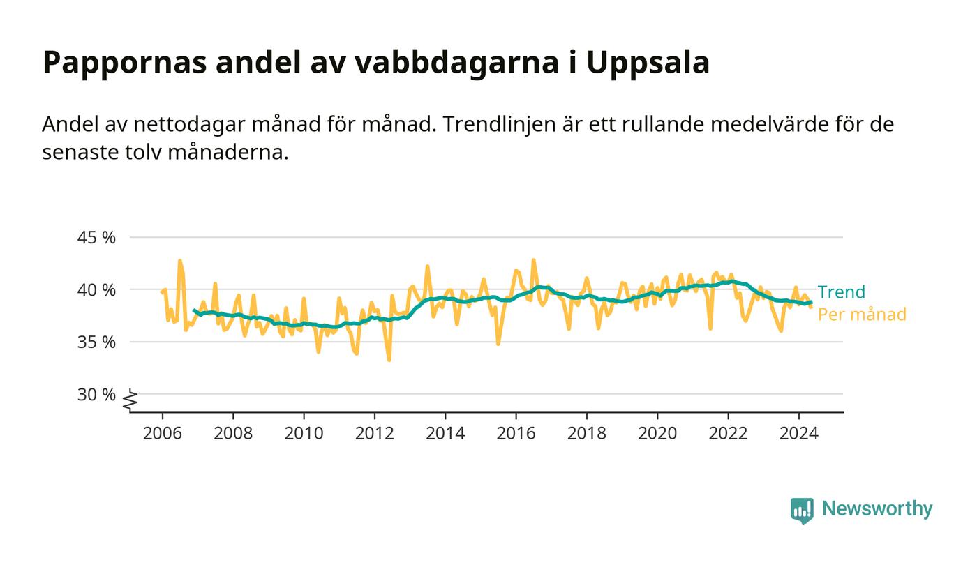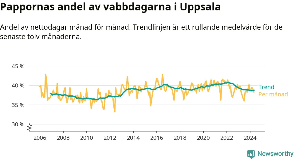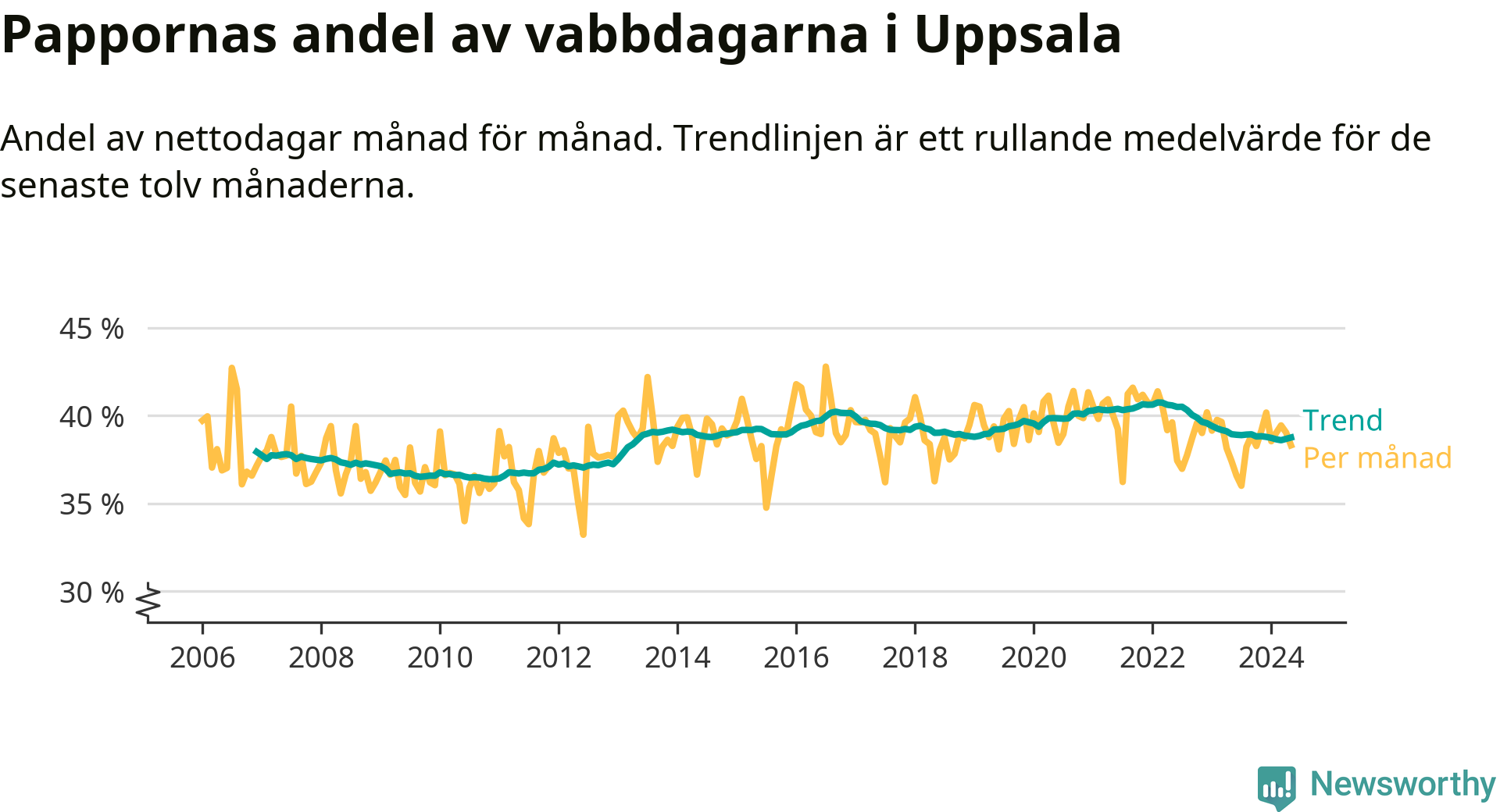 När coronapandemin drog in i mars 2020 peakade antalet vabbdagar både i Uppsala kommun och i riket som helhet. Under de senaste två åren har vabbuttaget börjat minska igen.