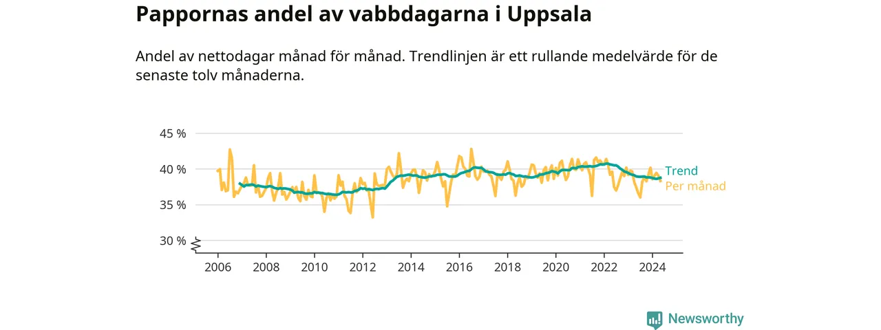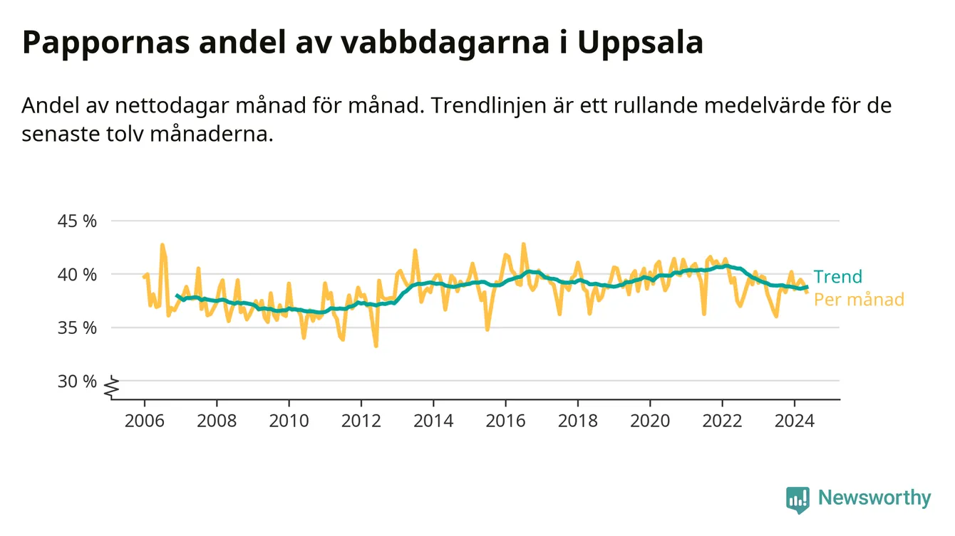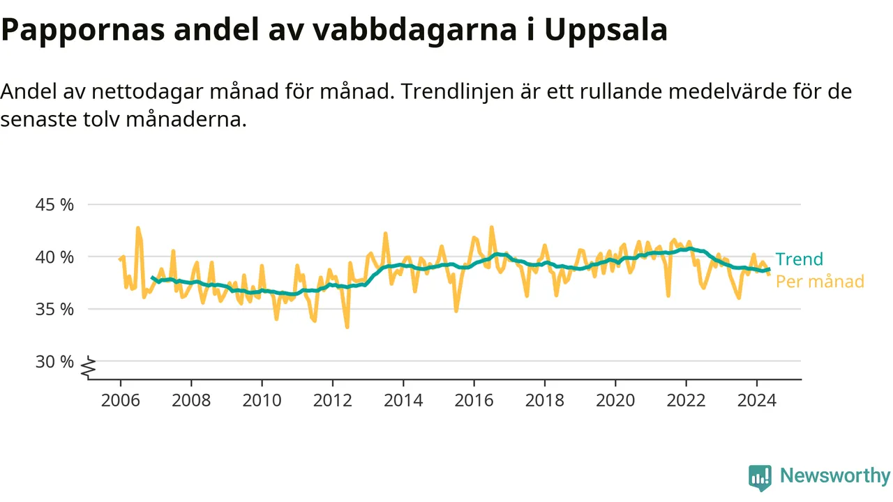 Uppsala ligger en bit från ett jämställt uttag. Under de senaste tolv månaderna har männen stått för 39 procent av all vabb i kommunen.