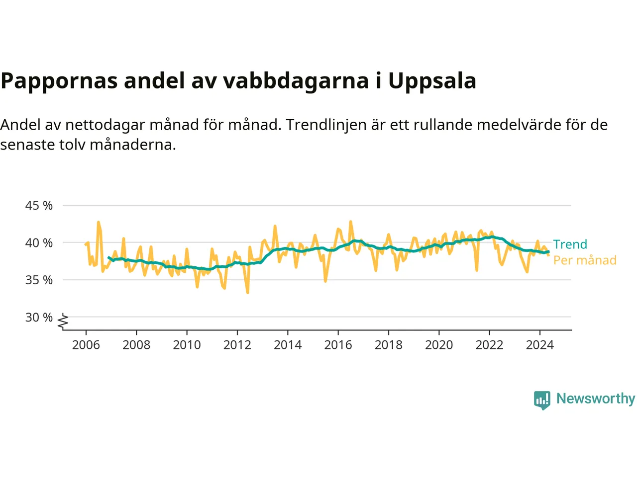 Pappor i Uppsala vabbar ungefär som rikssnittet och som andra män i Uppsala län. Skillnaderna inom landet är stora. Ingen kommun i landet når 50–50-fördelning. I Markaryd har papporna tagit ut 45 procent av alla vabbdagar under det senaste året. Det är mest i landet.