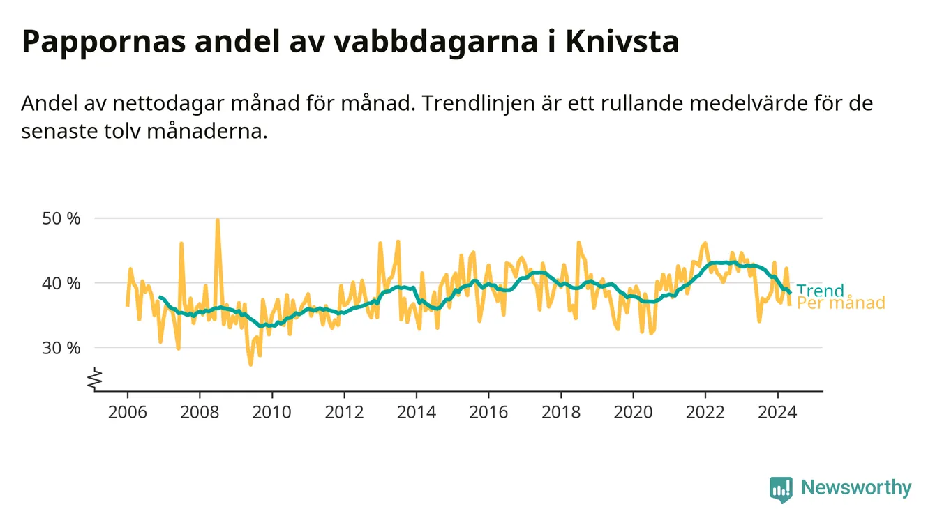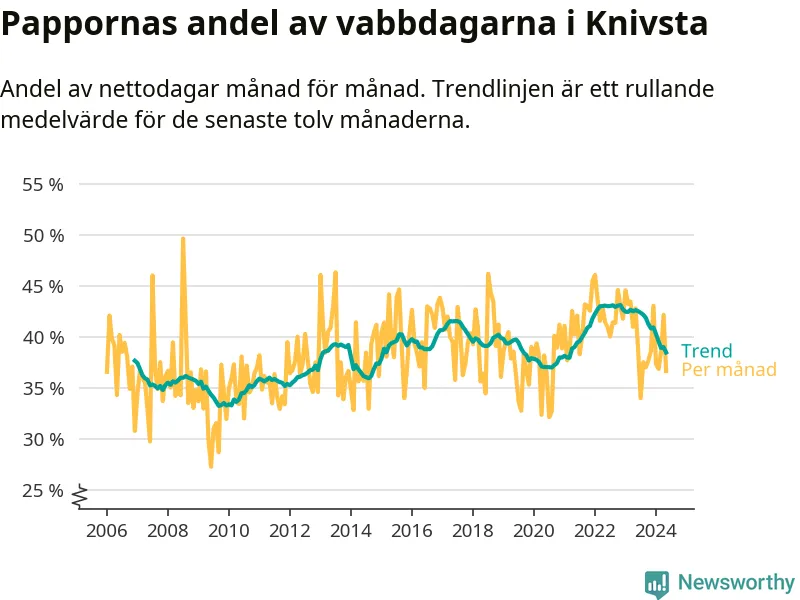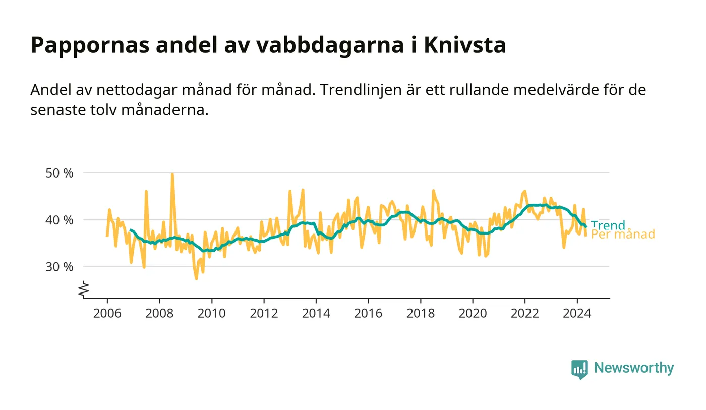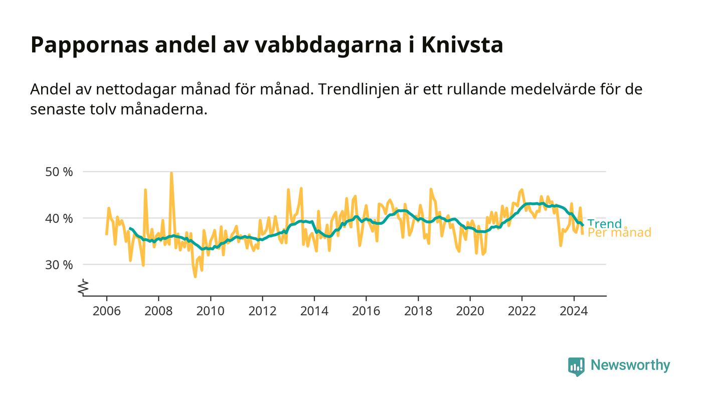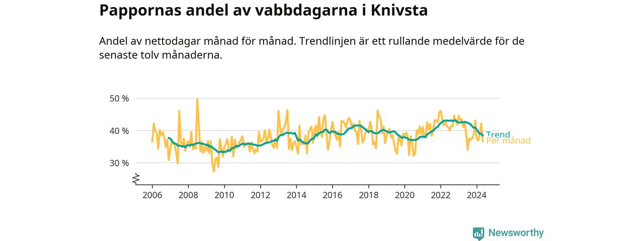 Knivsta ligger en bit från ett jämställt uttag. Under de senaste tolv månaderna har männen stått för 38 procent av all vabb i kommunen. Pappornas uttag peakade hösten 2022 då kommunens fäder var uppe i 43 procent av vabbdagarna 1.
