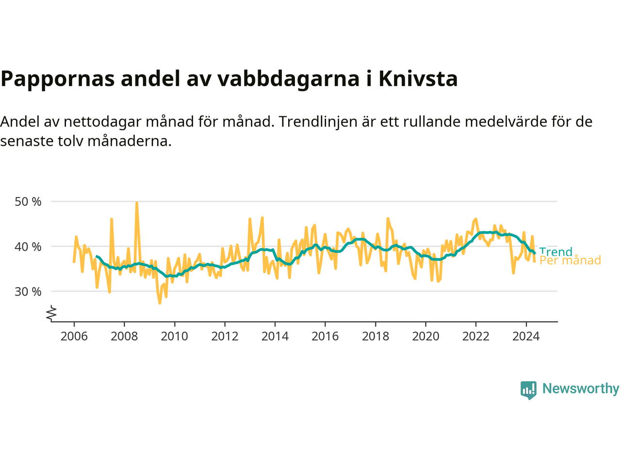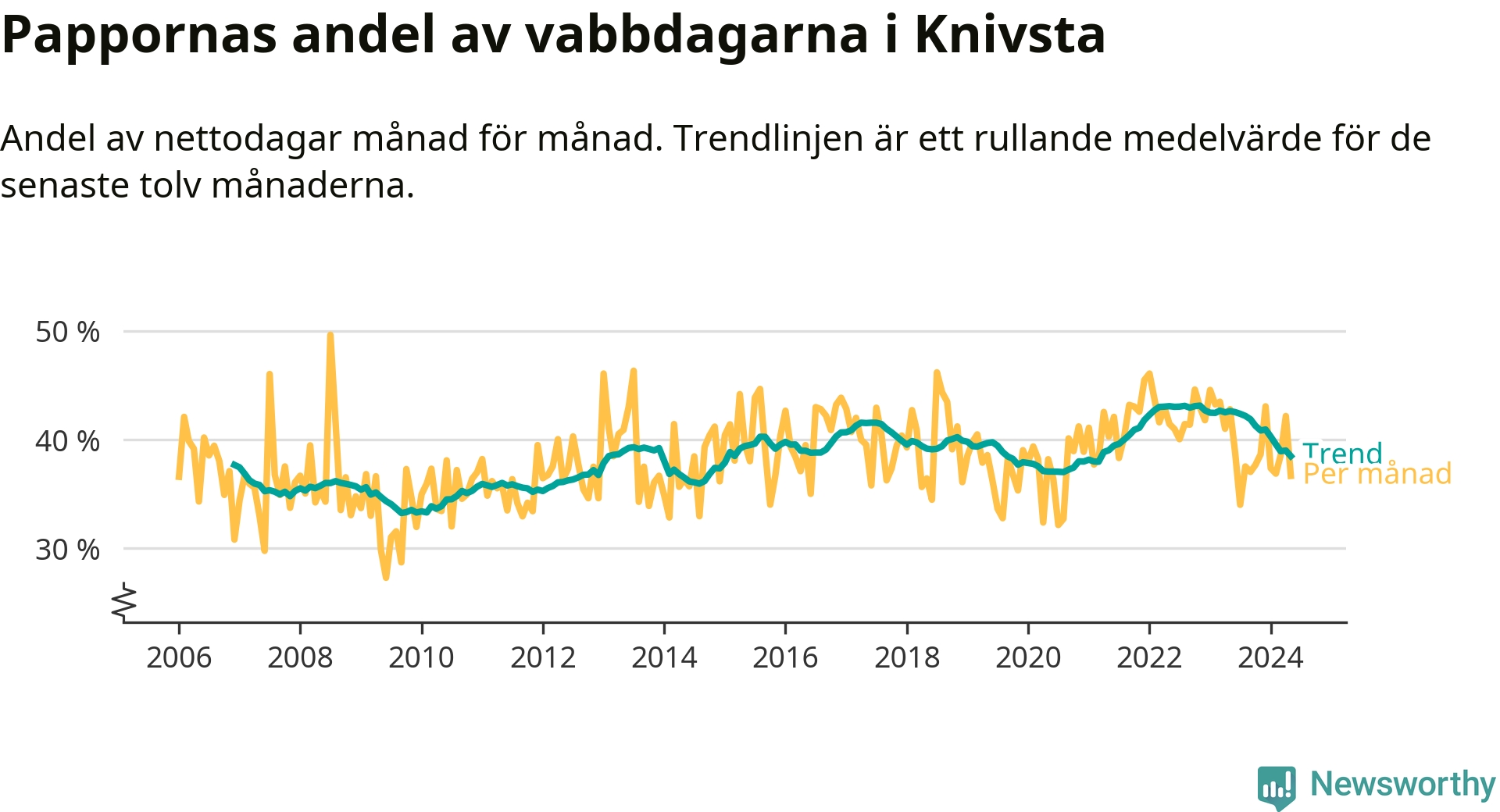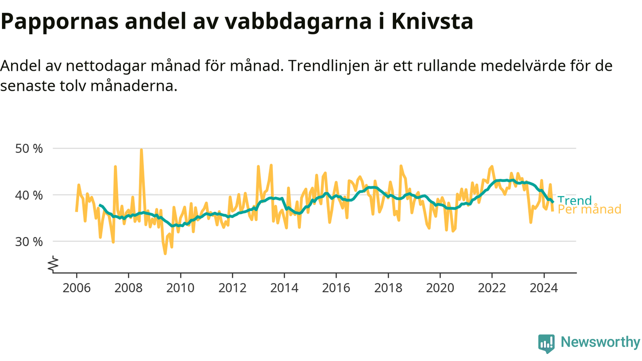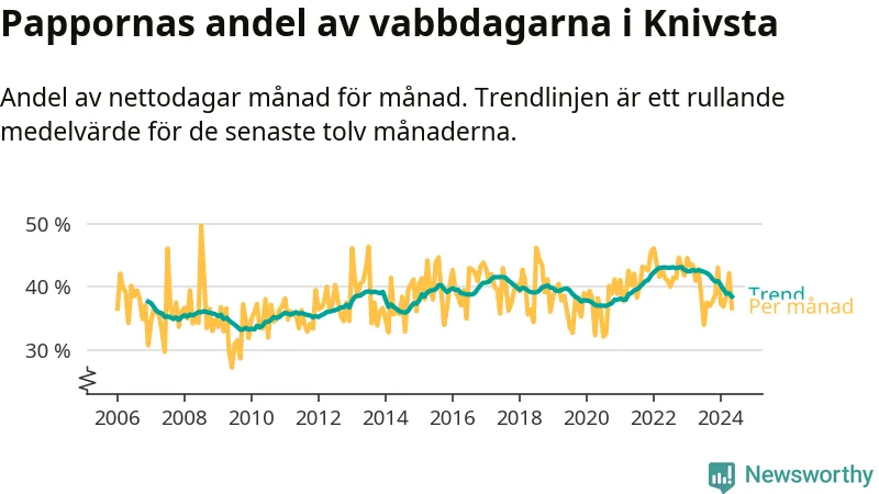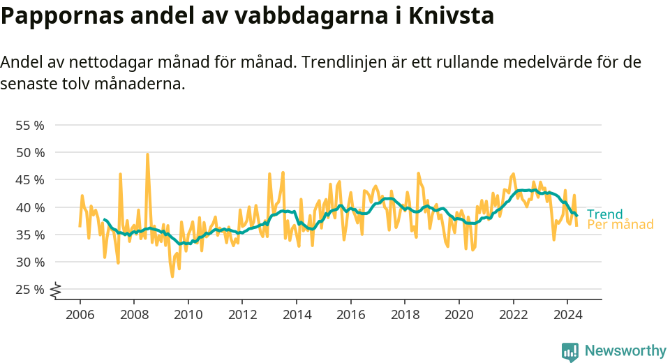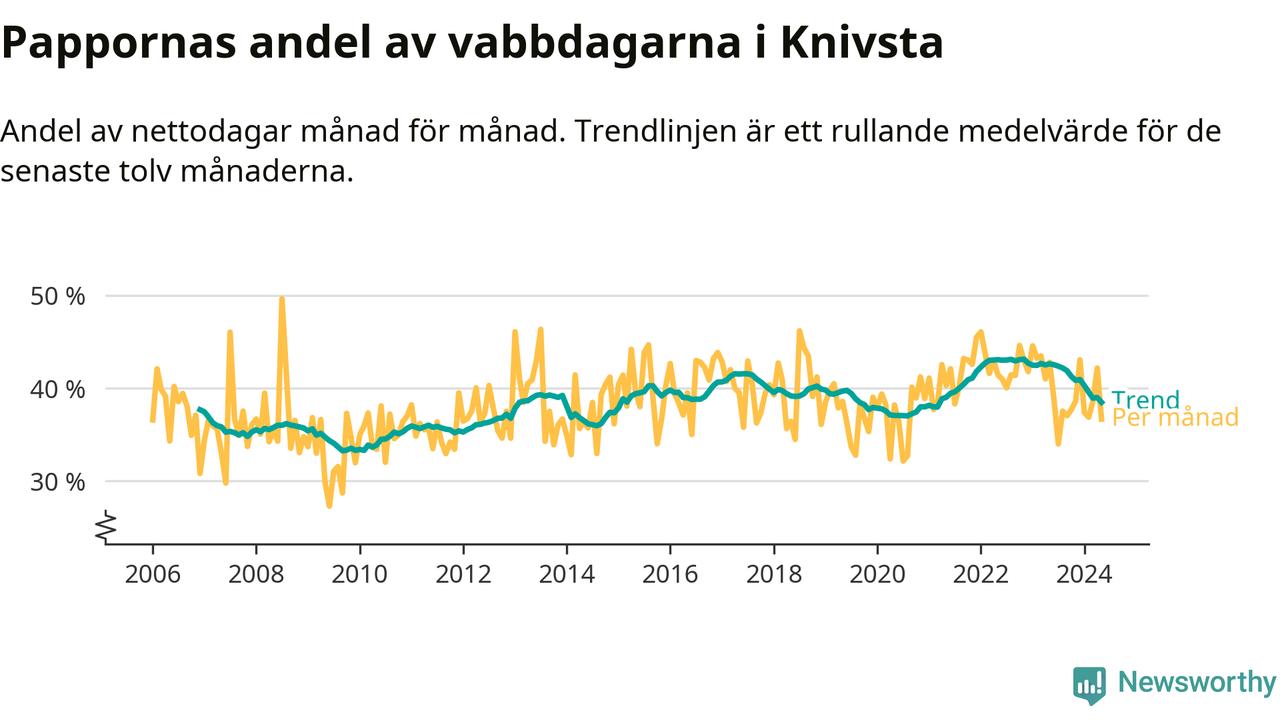 Knivsta ligger en bit från ett jämställt uttag. Under de senaste tolv månaderna har männen stått för 38 procent av all vabb i kommunen. Pappornas uttag peakade hösten 2022 då kommunens fäder var uppe i 43 procent av vabbdagarna 1.