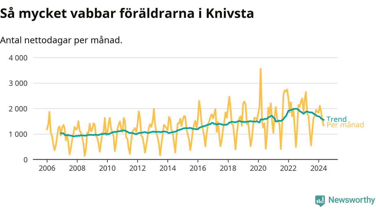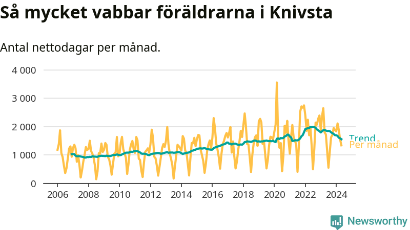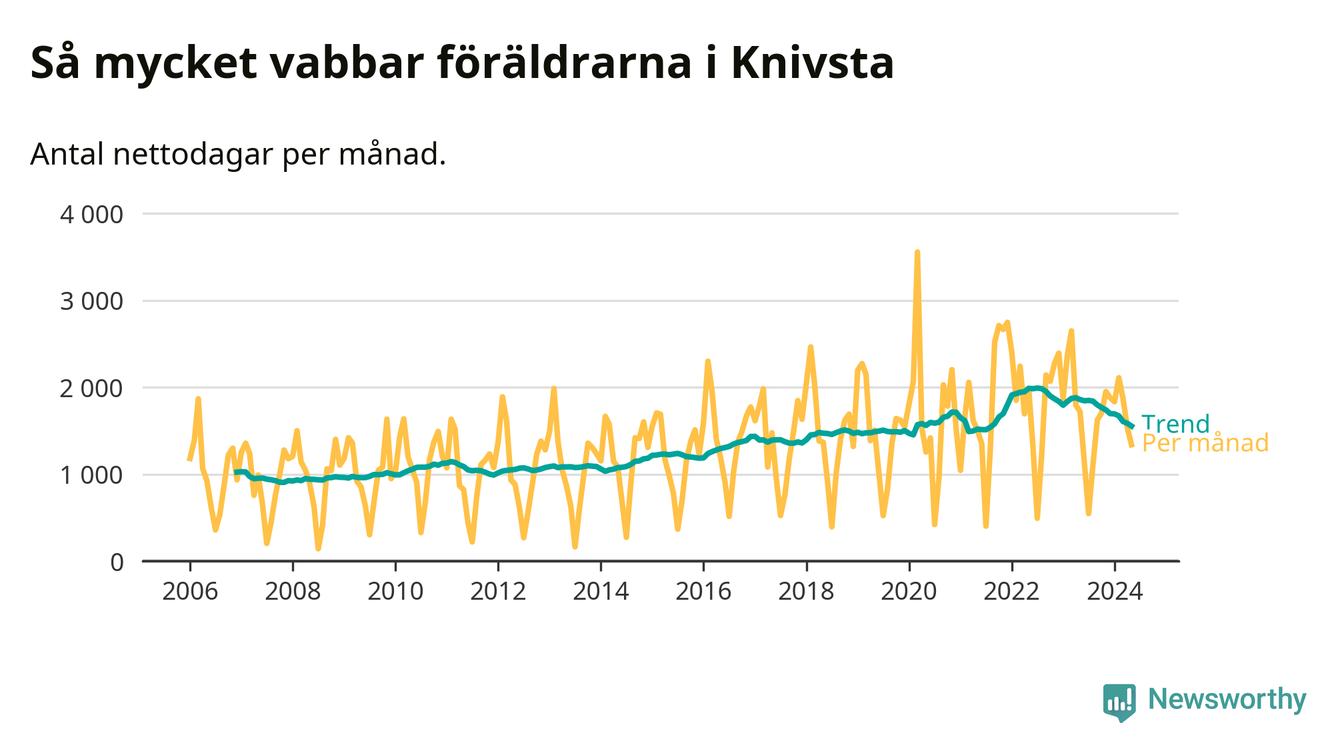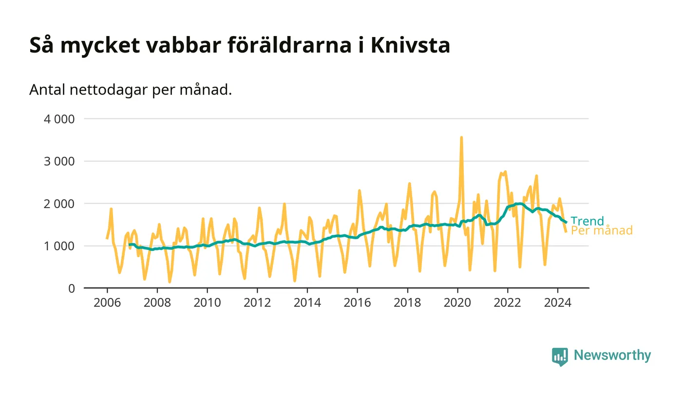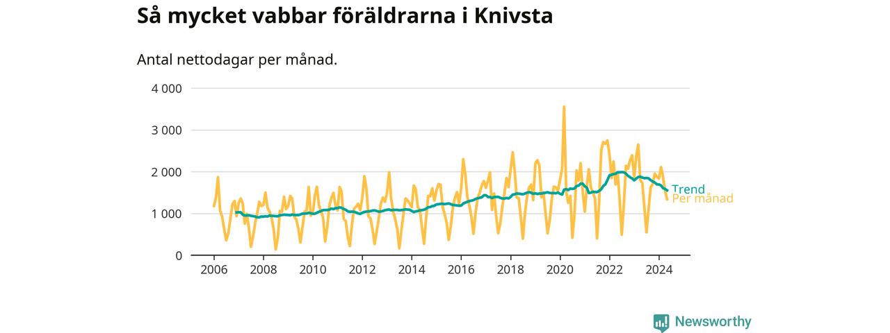 När coronapandemin drog in i mars 2020 peakade antalet vabbdagar både i Knivsta kommun och i riket som helhet. Under de senaste två åren har vabbuttaget börjat minska igen.