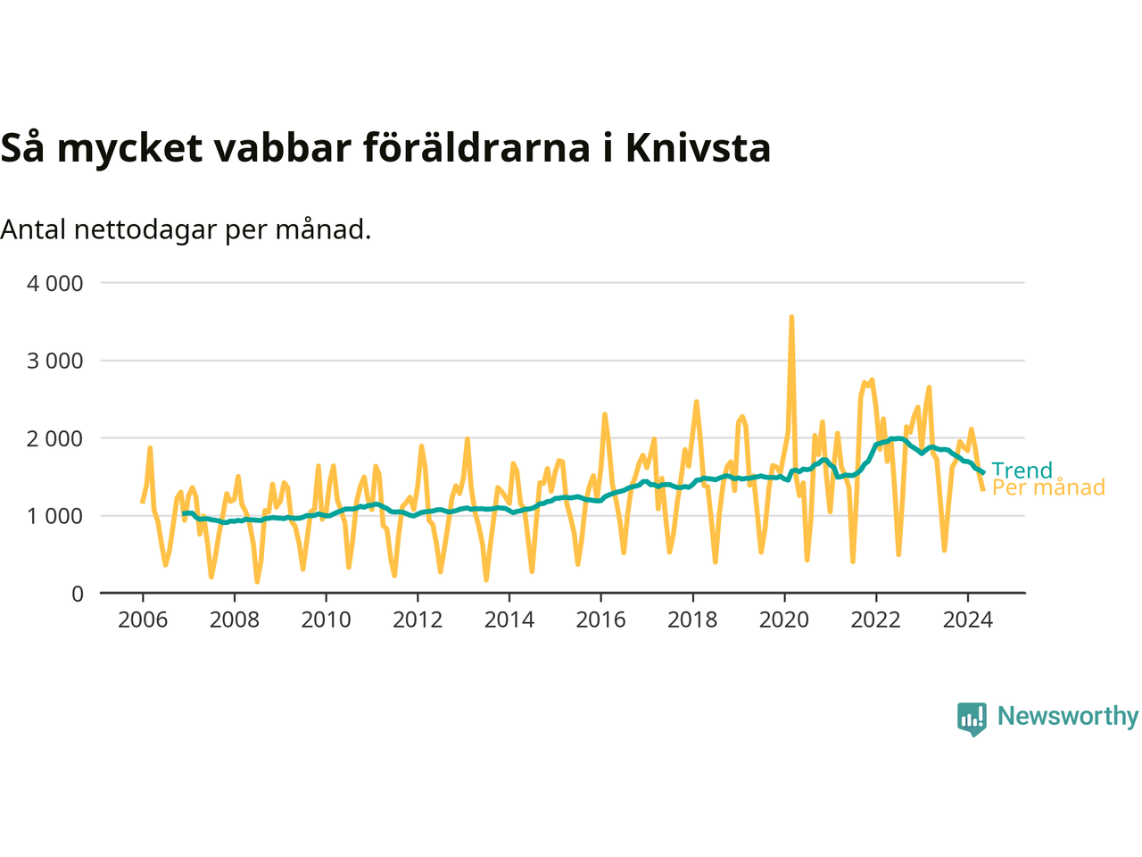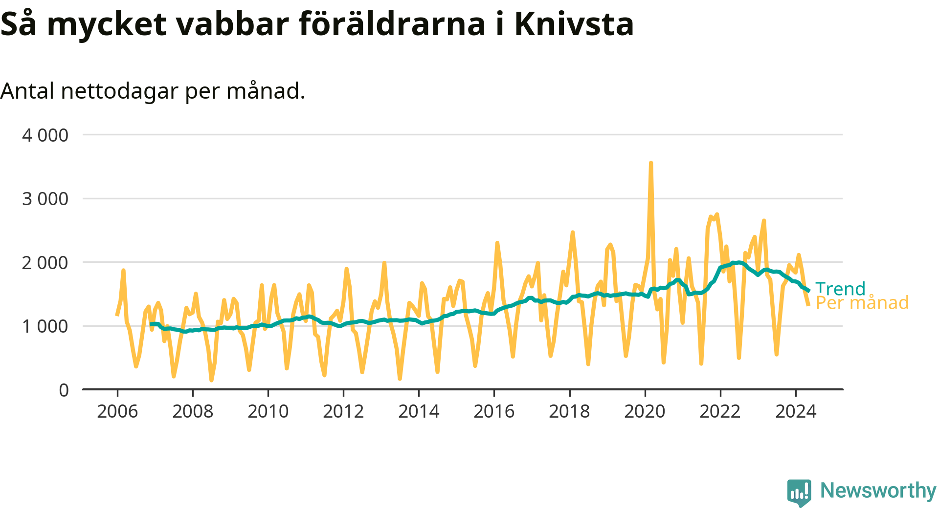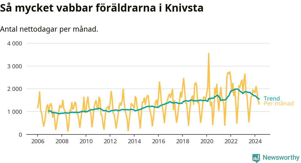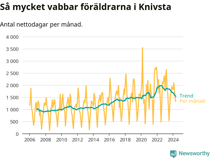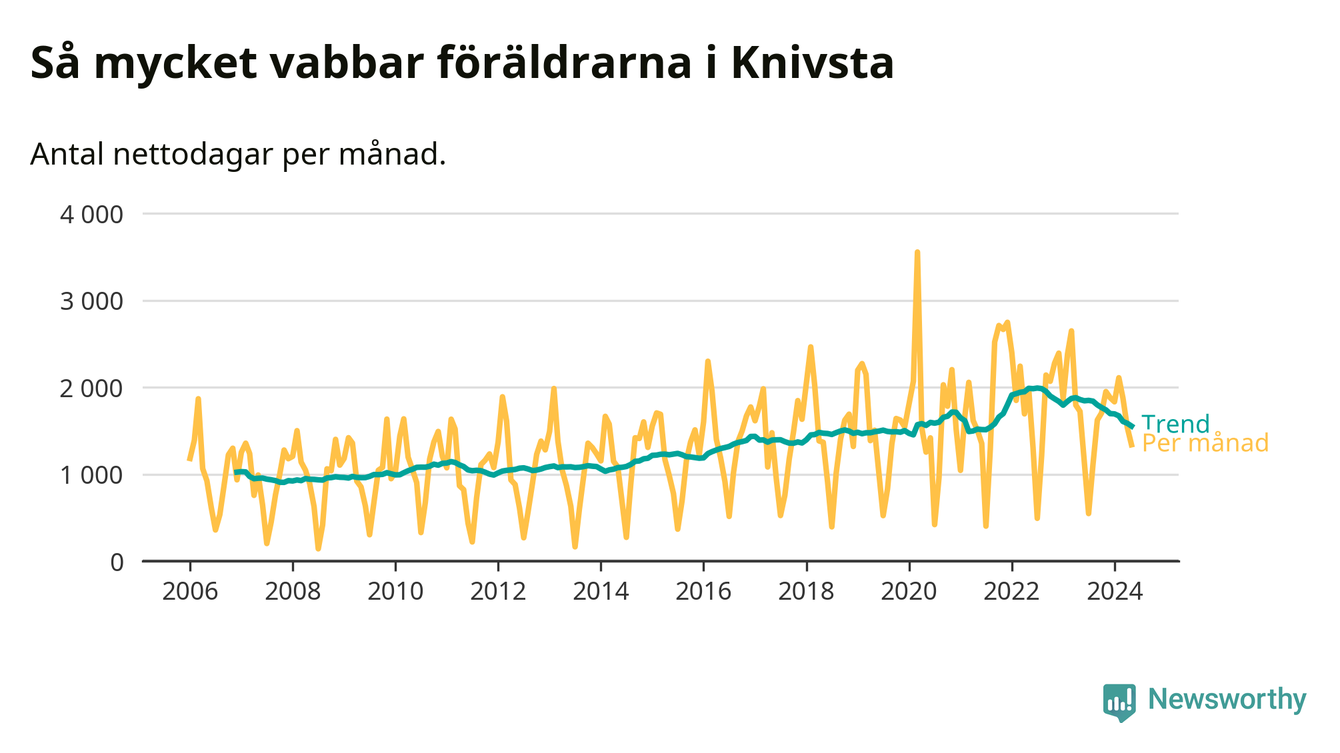 När coronapandemin drog in i mars 2020 peakade antalet vabbdagar både i Knivsta kommun och i riket som helhet. Under de senaste två åren har vabbuttaget börjat minska igen.