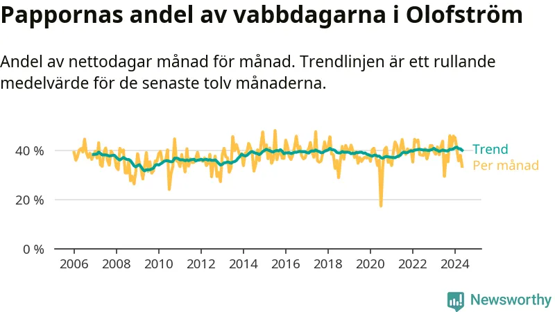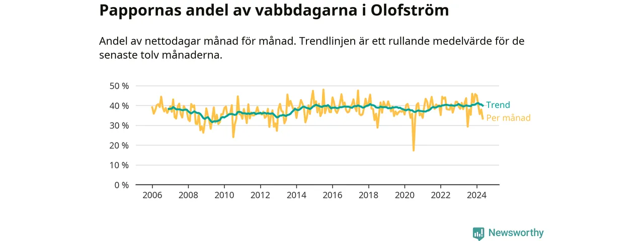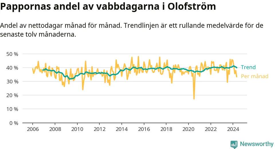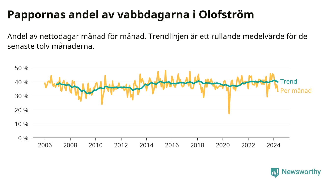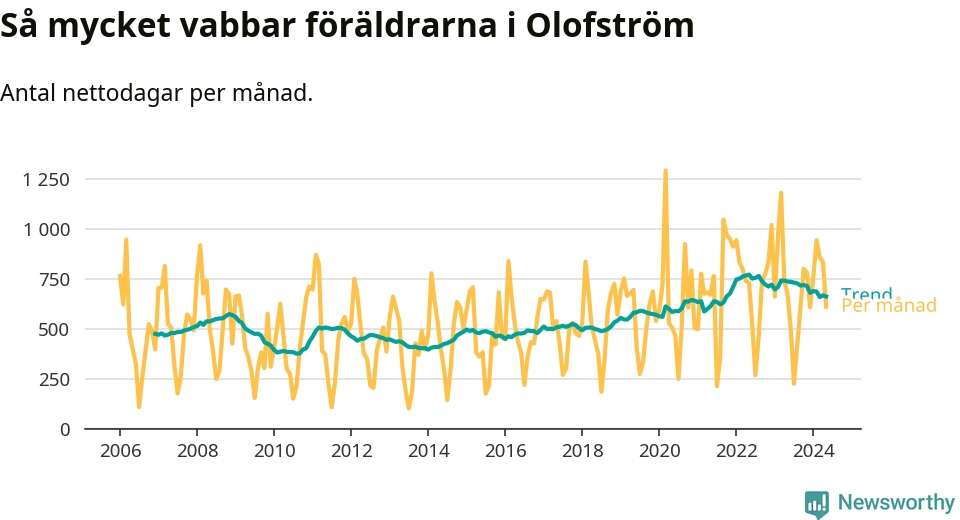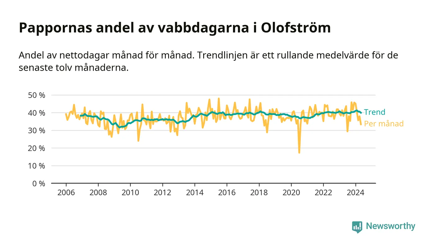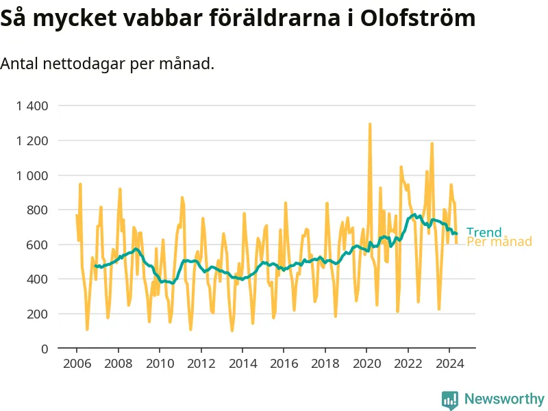 När coronapandemin drog in i mars 2020 peakade antalet vabbdagar både i Olofströms kommun och i riket som helhet. Under de senaste två åren har vabbuttaget börjat minska igen.