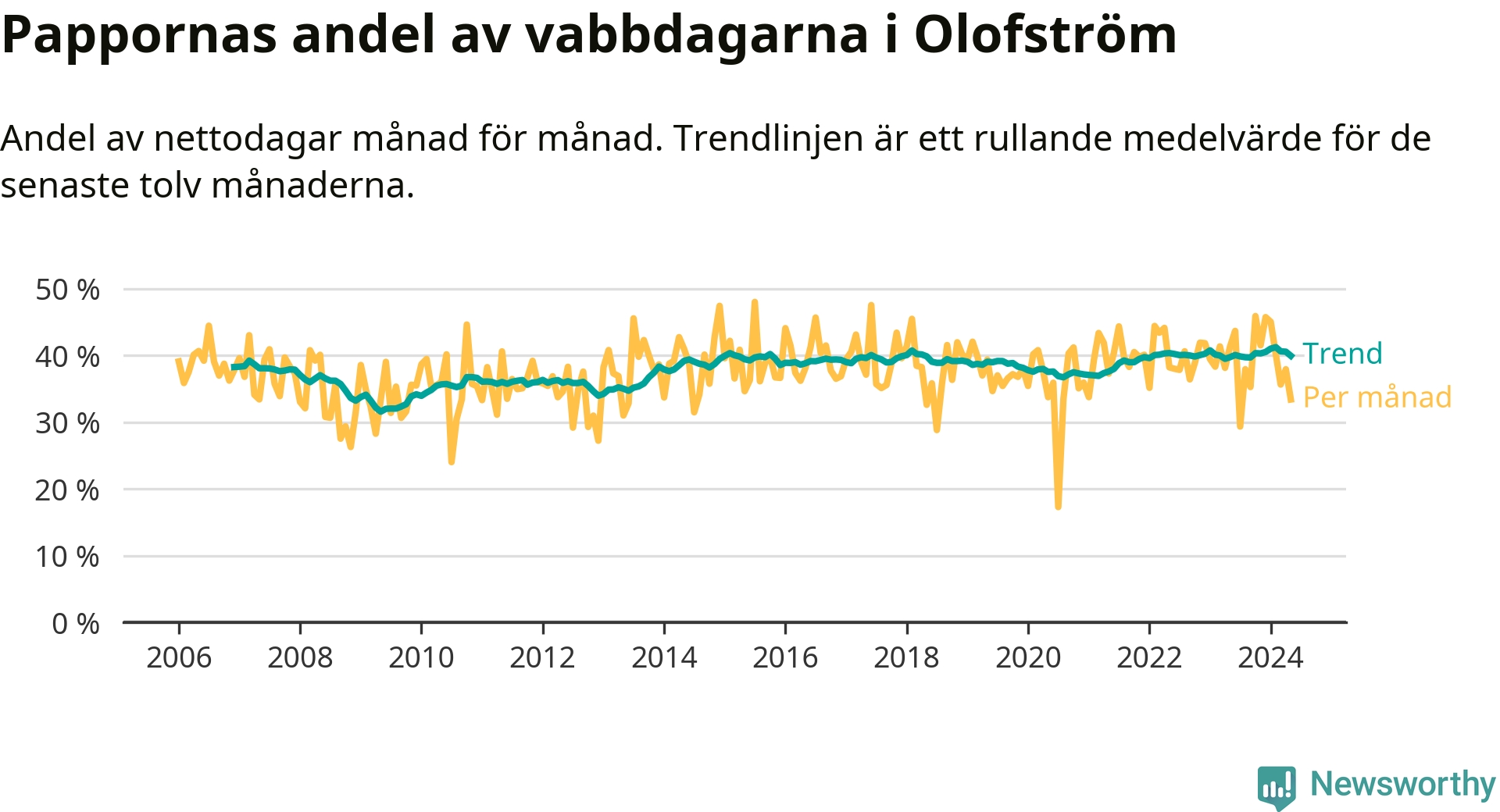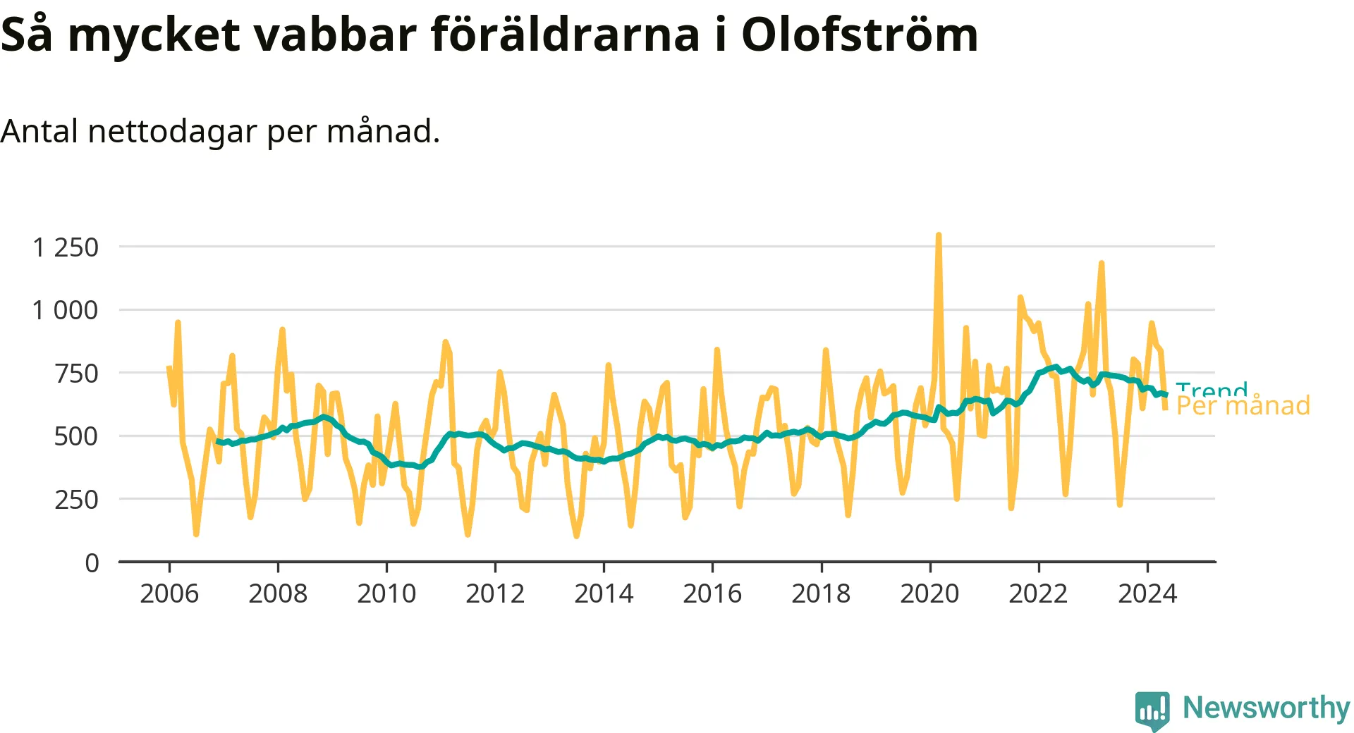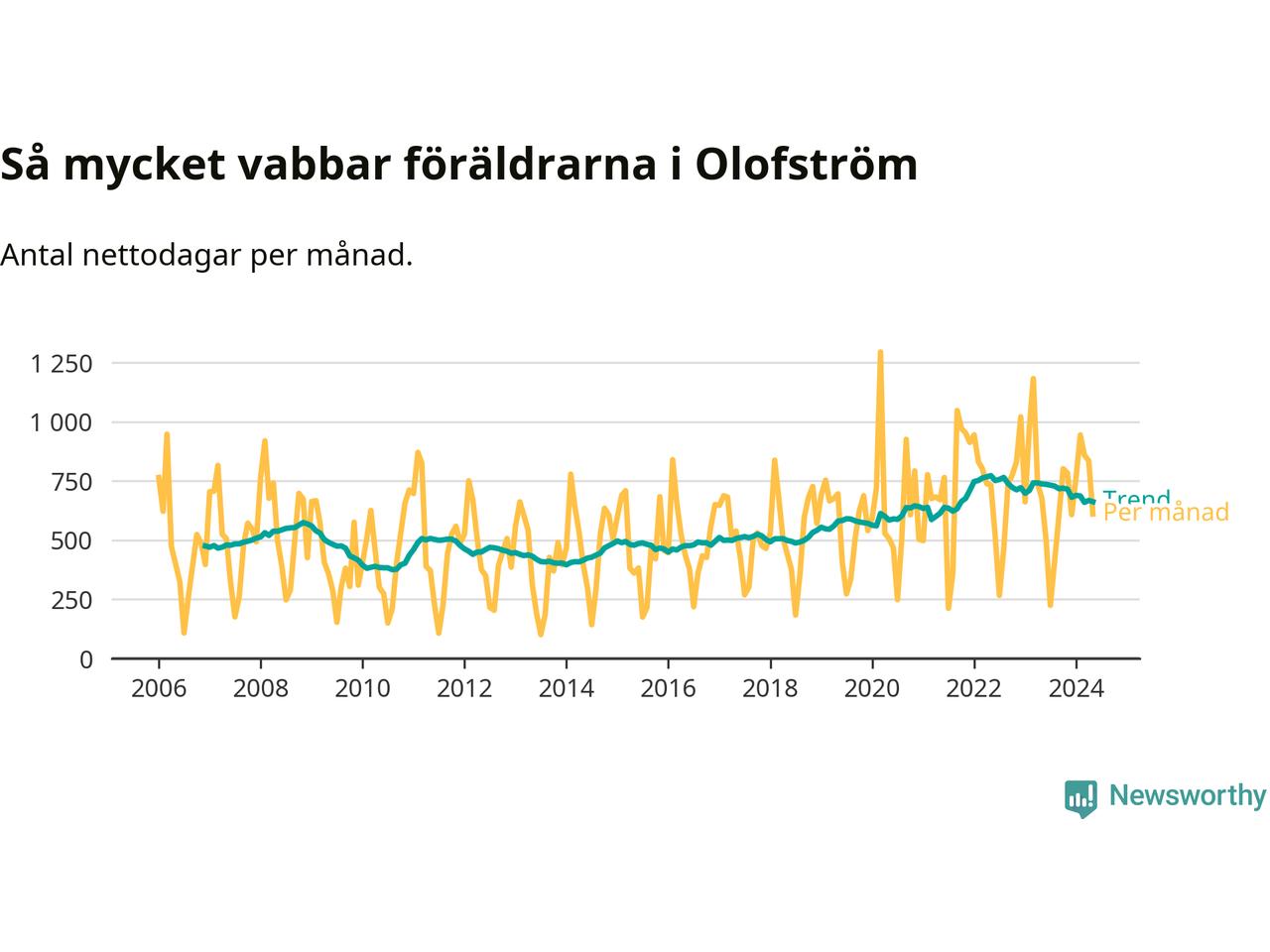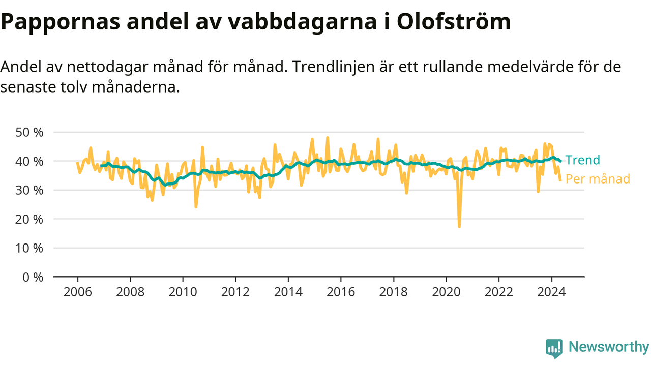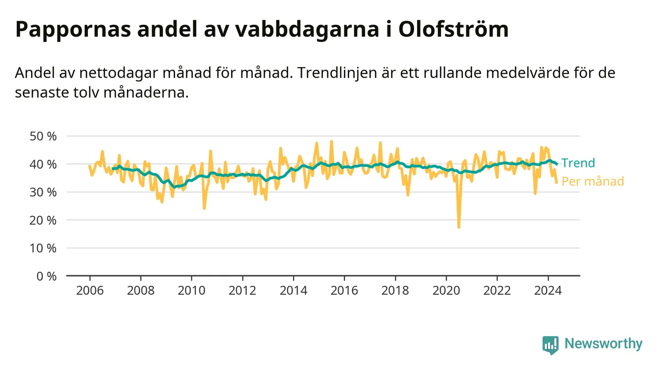 När coronapandemin drog in i mars 2020 peakade antalet vabbdagar både i Olofströms kommun och i riket som helhet. Under de senaste två åren har vabbuttaget börjat minska igen.