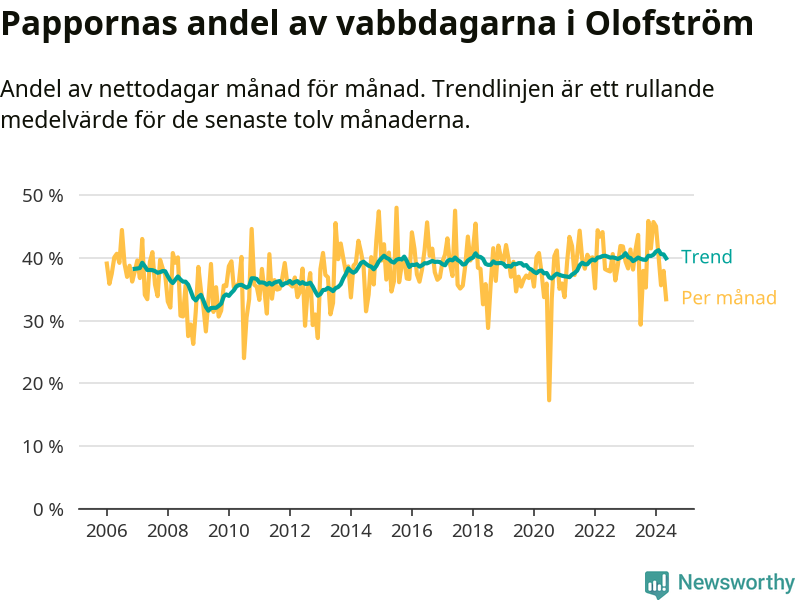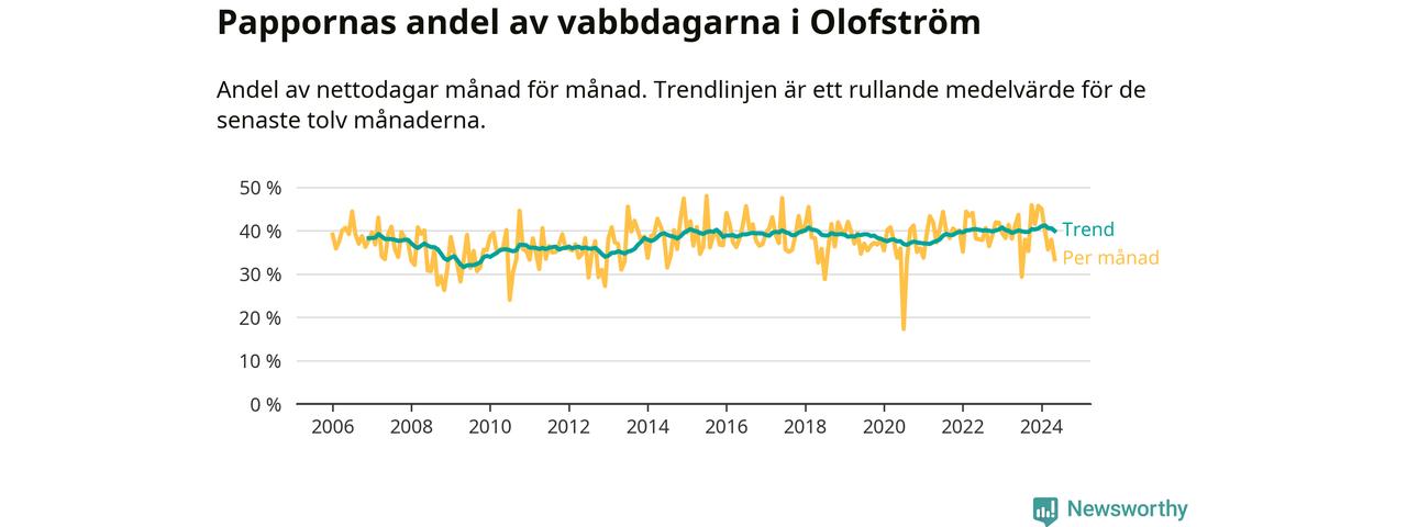 Olofström ligger en bit från ett jämställt uttag. Under de senaste tolv månaderna har männen stått för 40 procent av all vabb i kommunen.