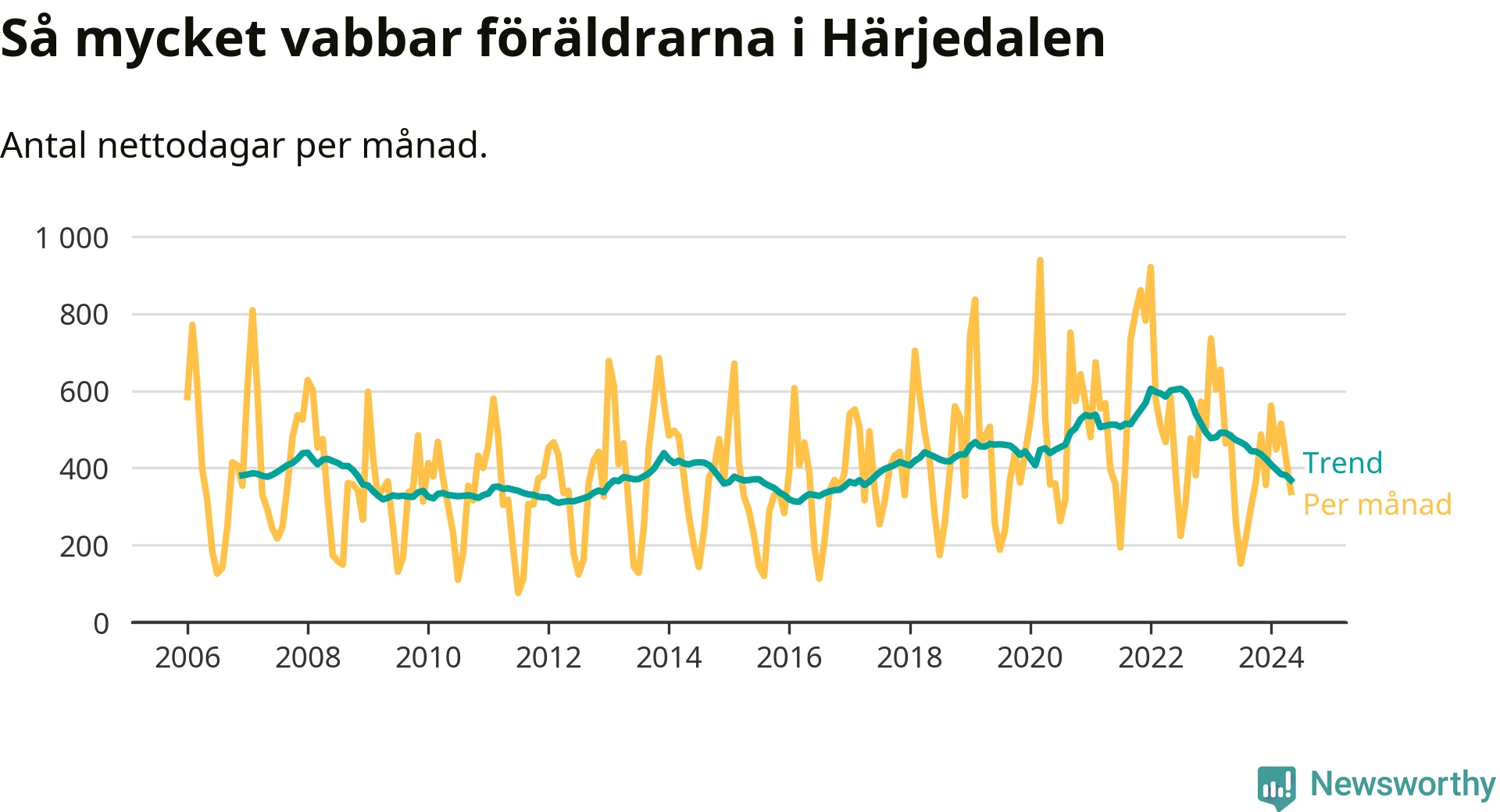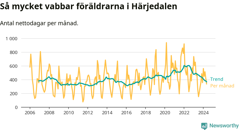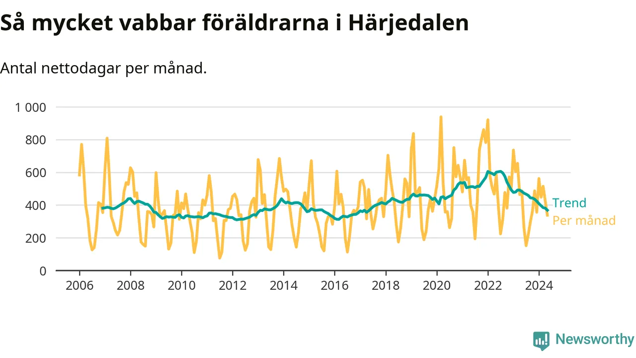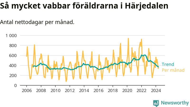 När coronapandemin drog in i mars 2020 peakade antalet vabbdagar både i Härjedalens kommun och i riket som helhet. Under de senaste två åren har vabbuttaget börjat minska igen.