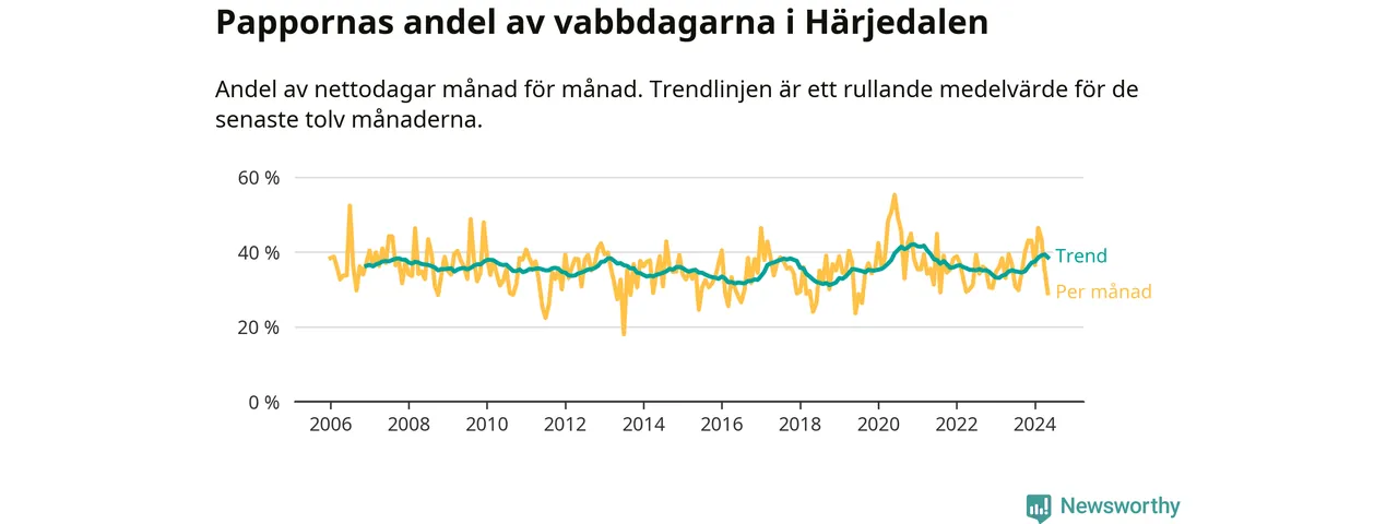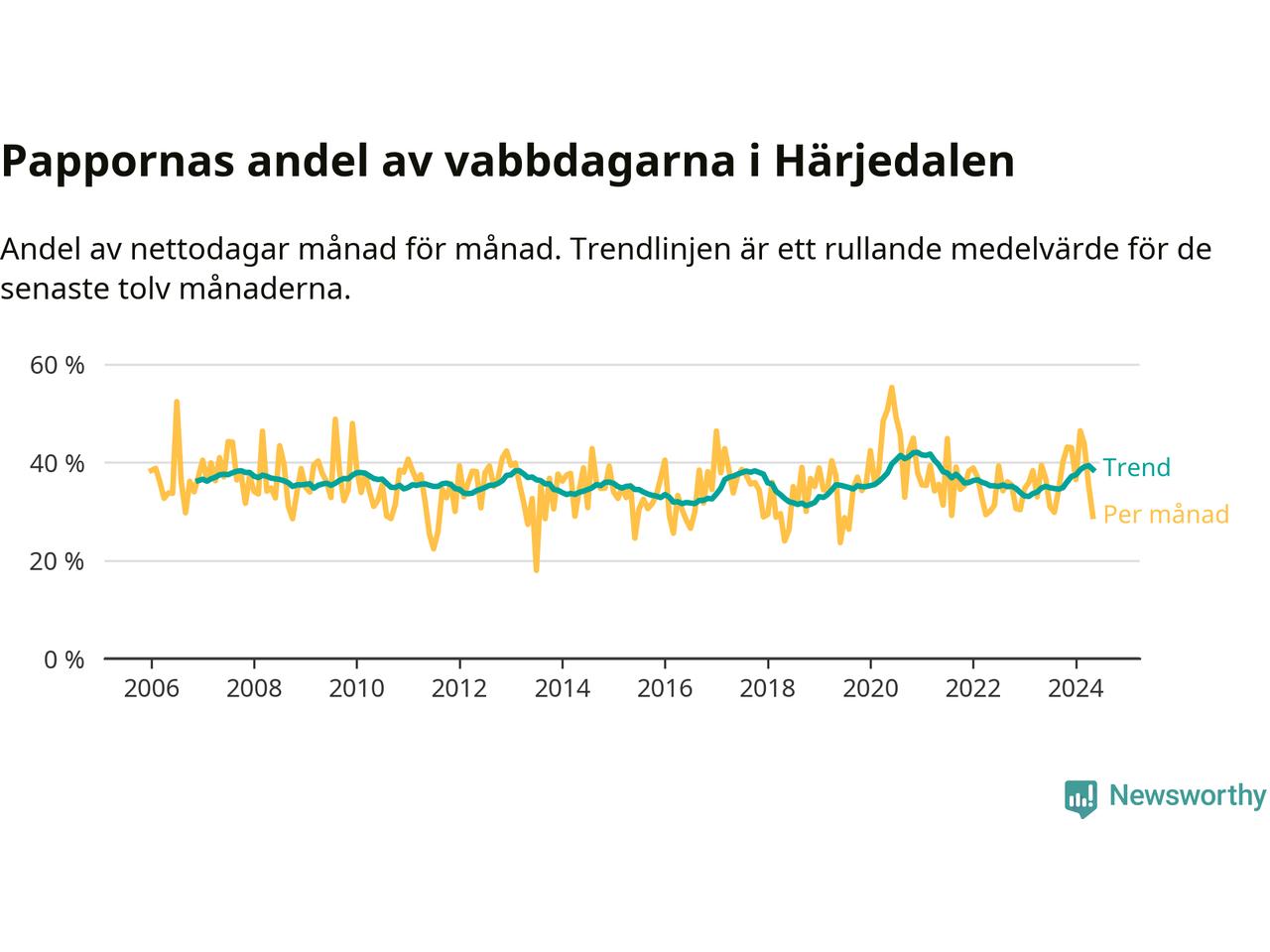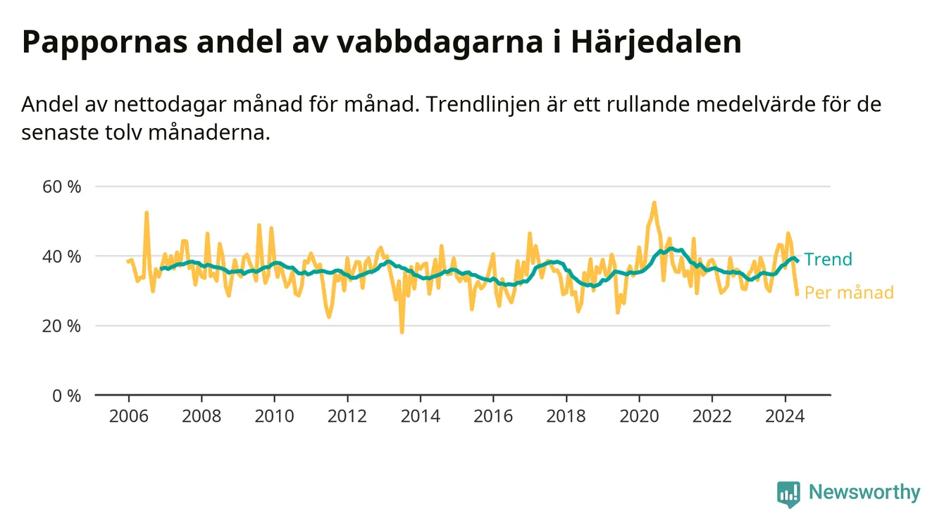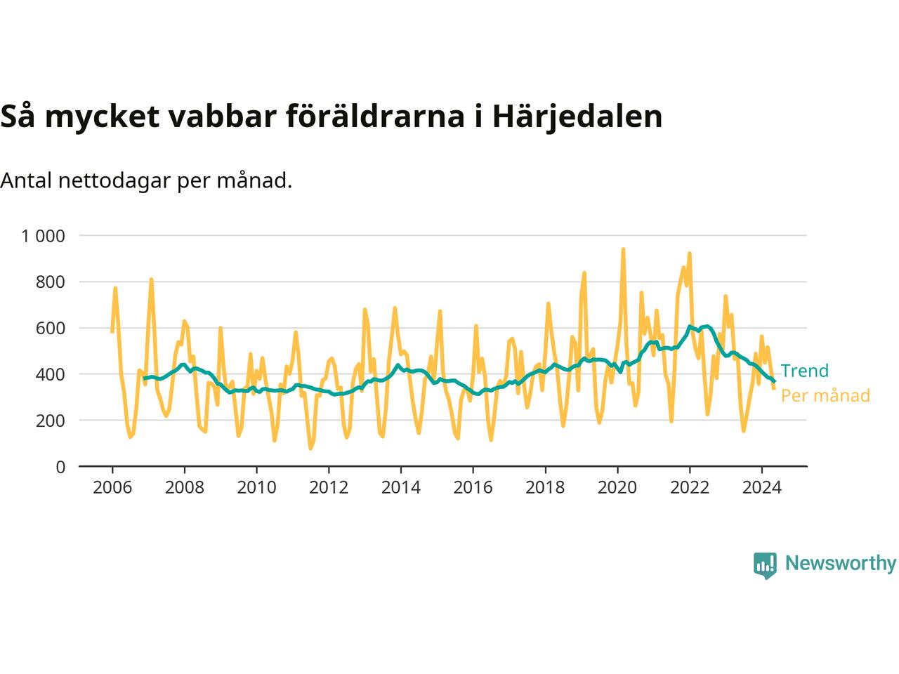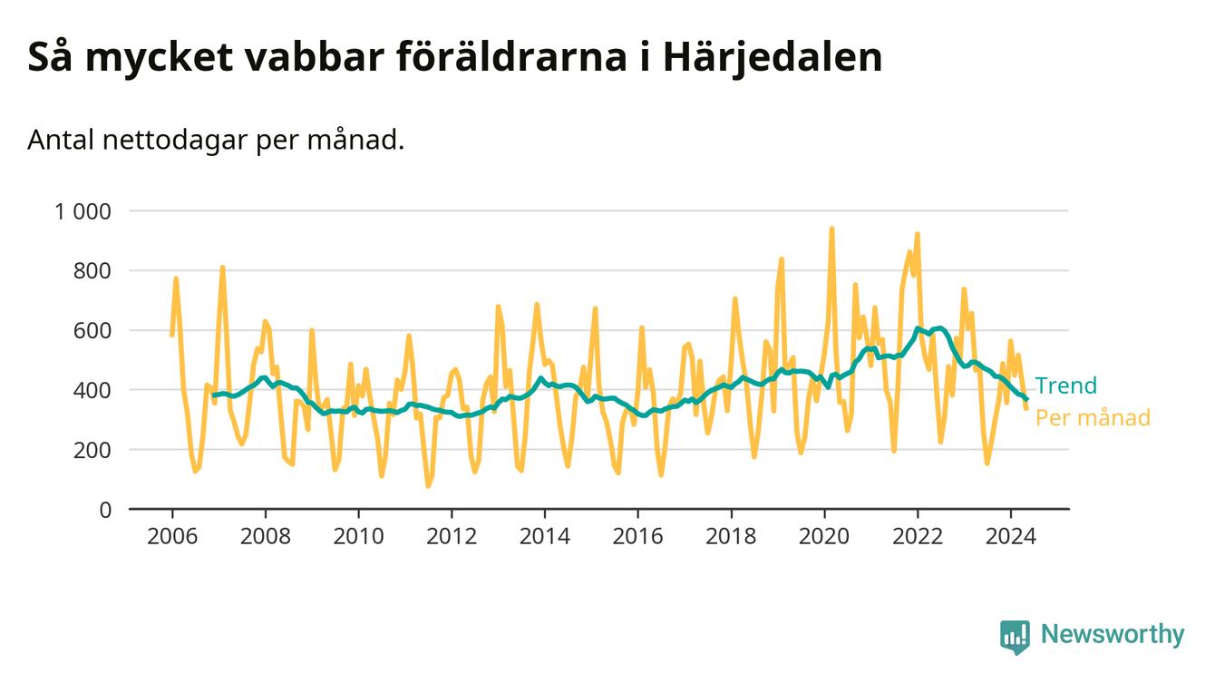 Härjedalen ligger en bit från ett jämställt uttag. Under de senaste tolv månaderna har männen stått för 39 procent av all vabb i kommunen. Pappornas uttag peakade vintern 2020 då kommunens fäder var uppe i 42 procent av vabbdagarna 1.