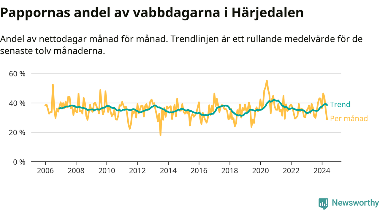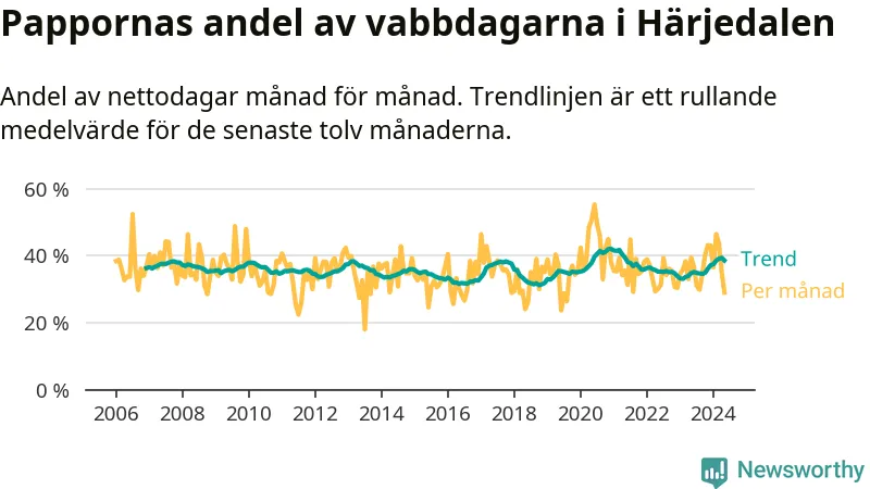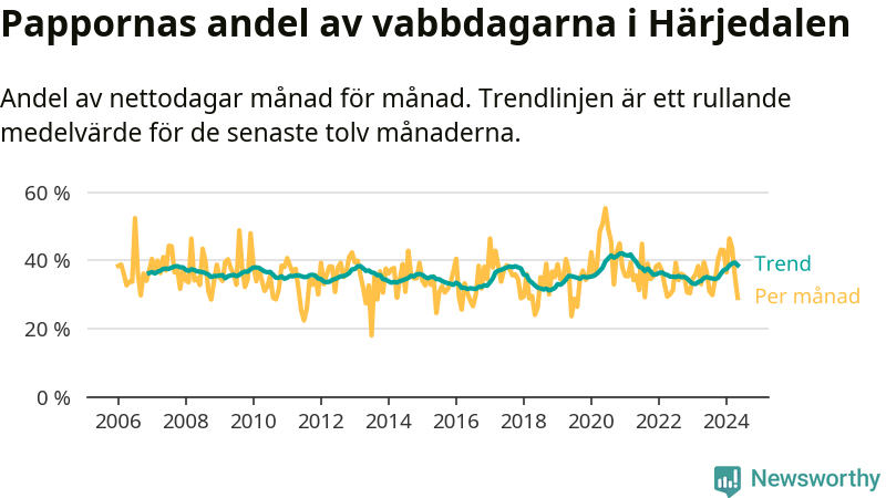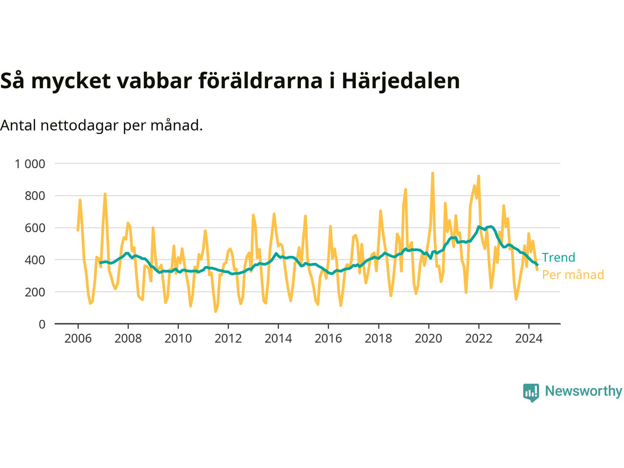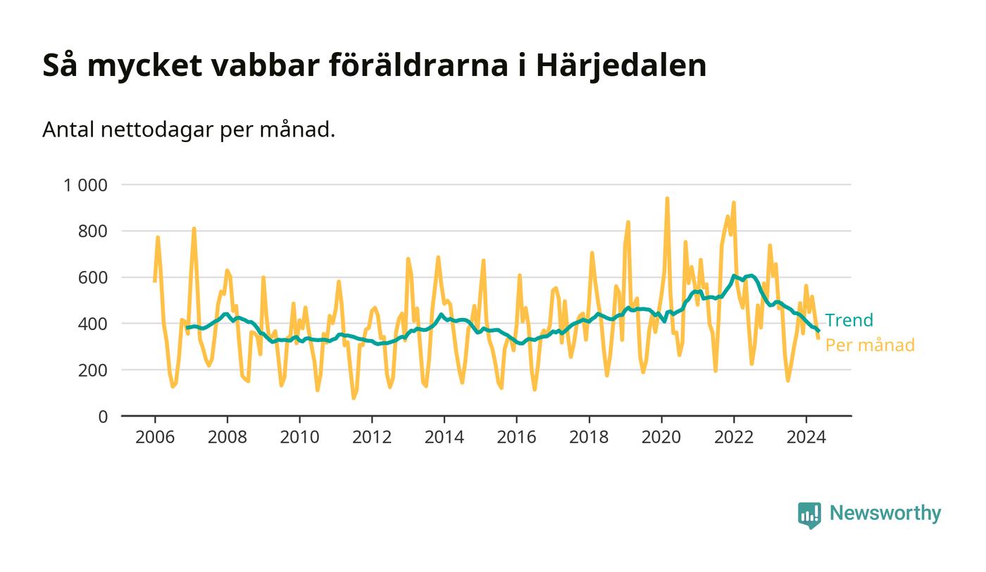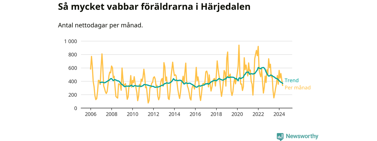 Härjedalen ligger en bit från ett jämställt uttag. Under de senaste tolv månaderna har männen stått för 39 procent av all vabb i kommunen. Pappornas uttag peakade vintern 2020 då kommunens fäder var uppe i 42 procent av vabbdagarna 1.