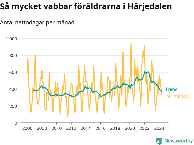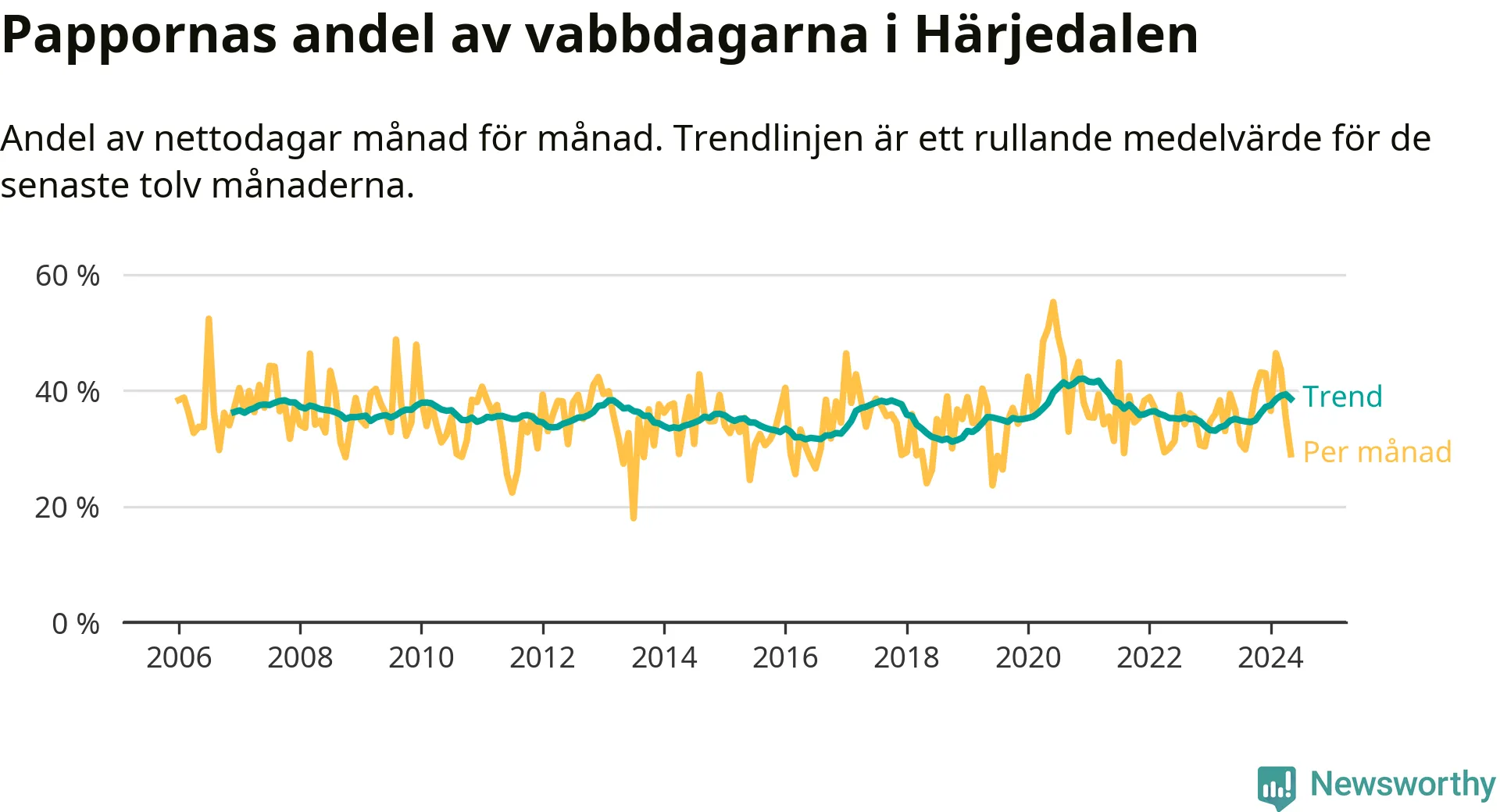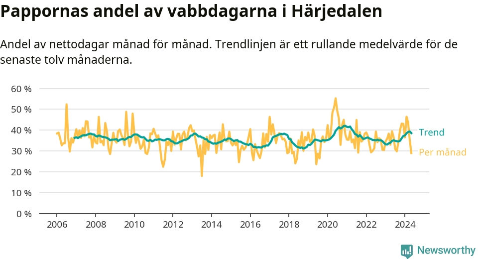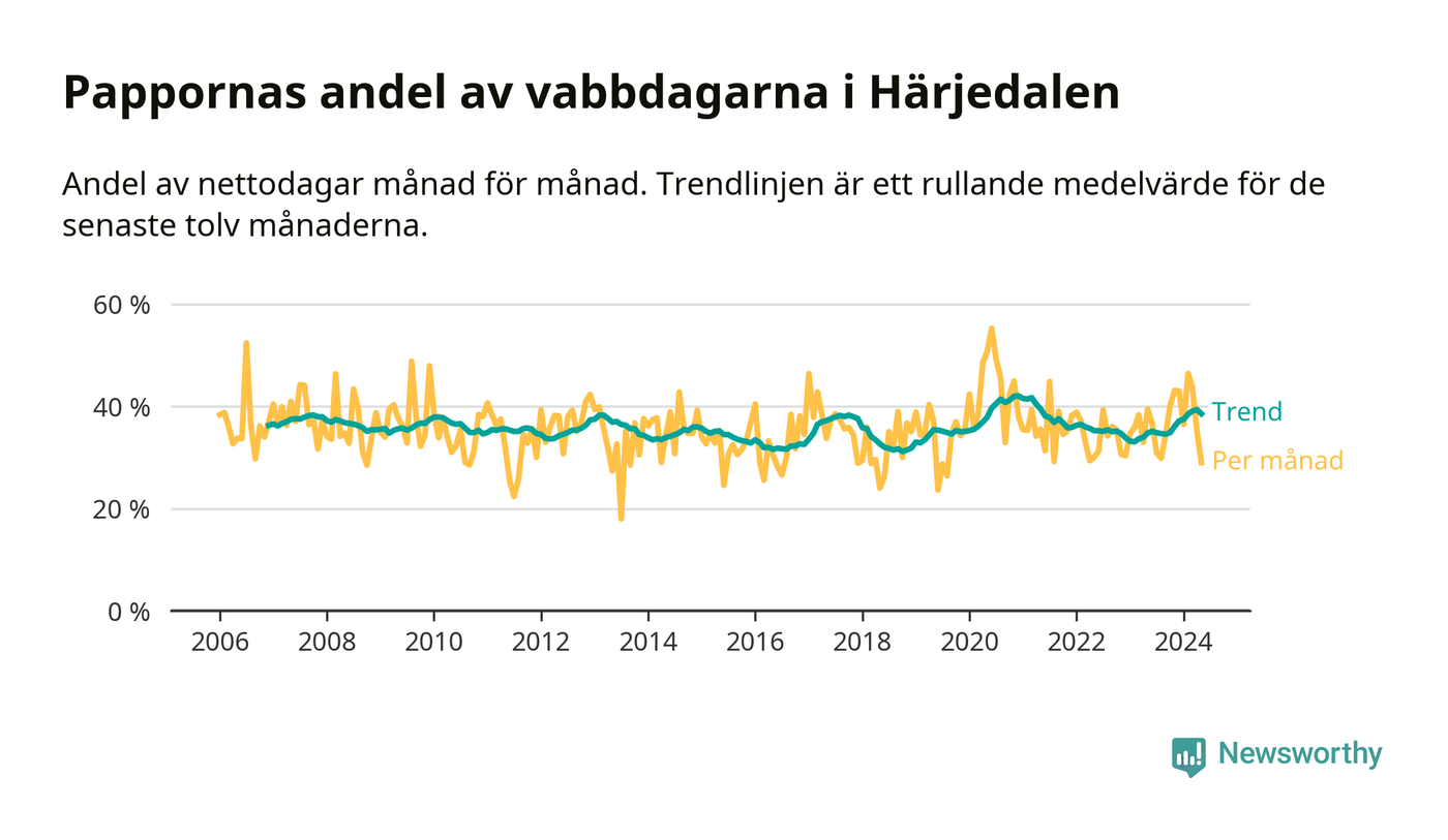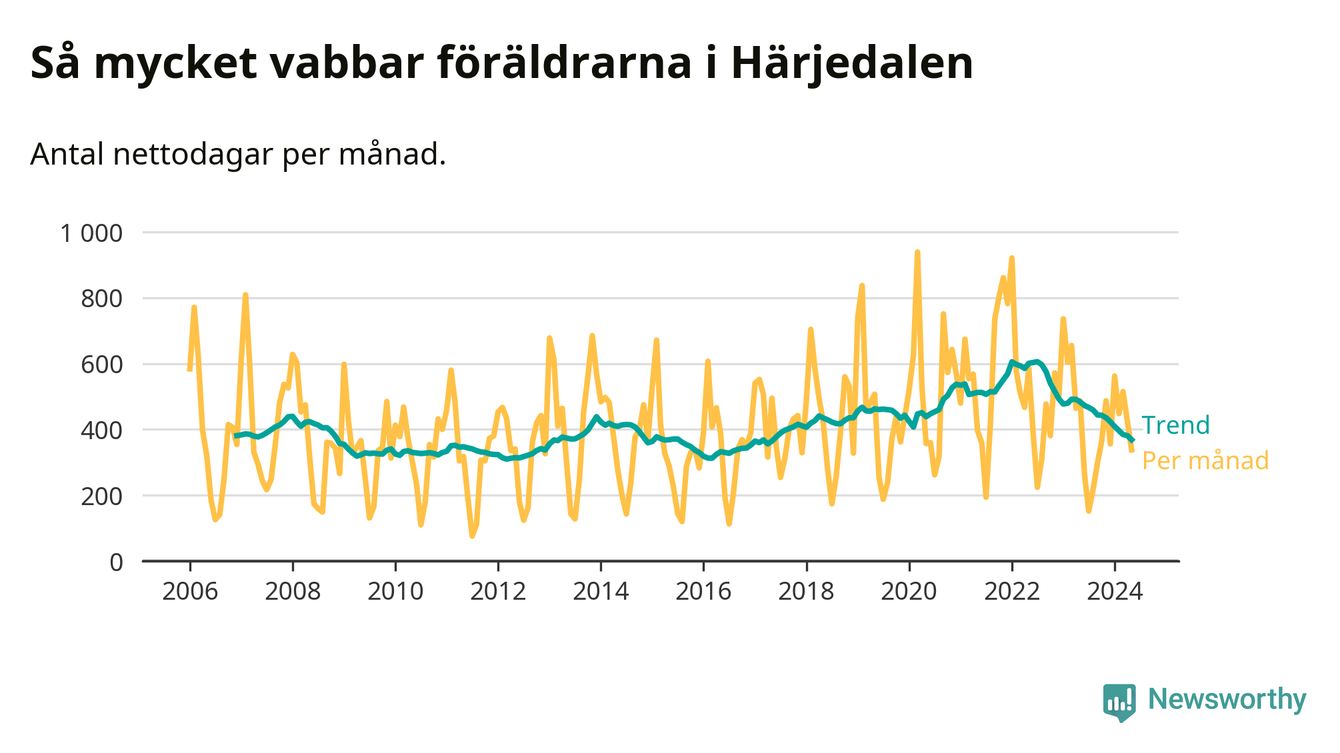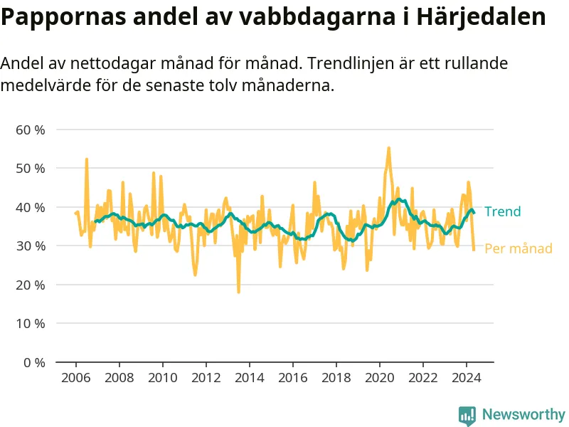 Härjedalen ligger en bit från ett jämställt uttag. Under de senaste tolv månaderna har männen stått för 39 procent av all vabb i kommunen. Pappornas uttag peakade vintern 2020 då kommunens fäder var uppe i 42 procent av vabbdagarna 1.