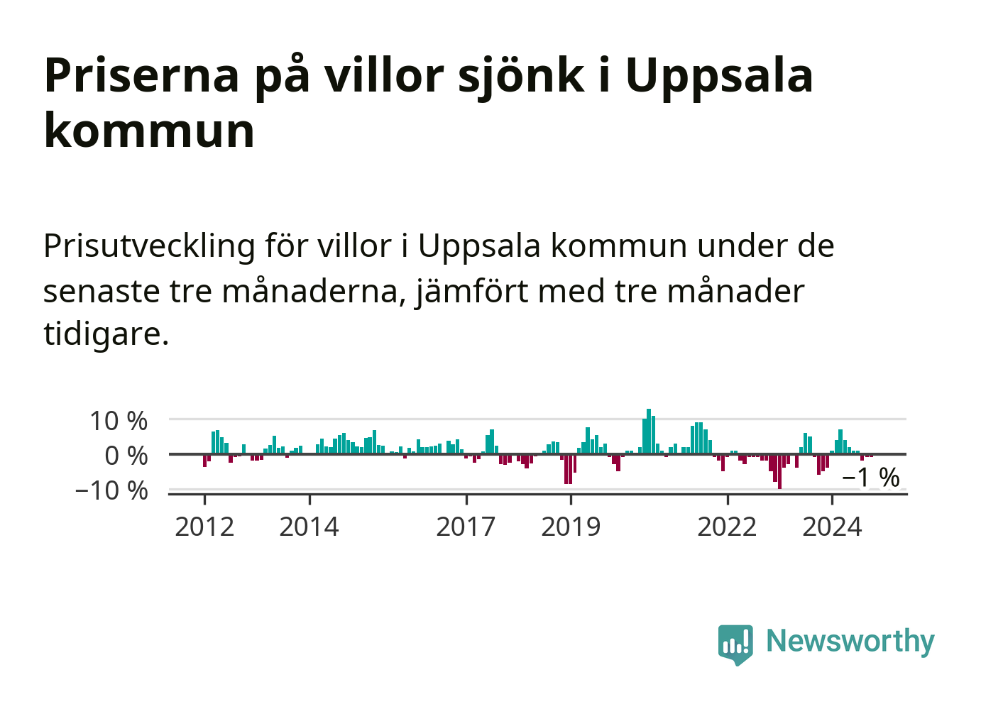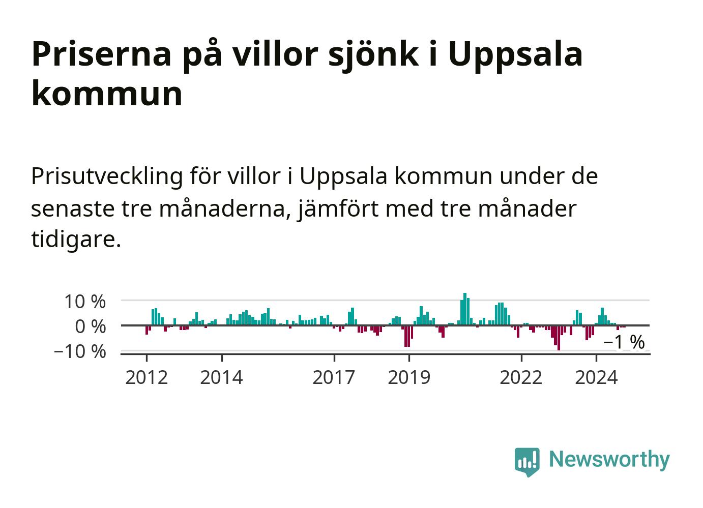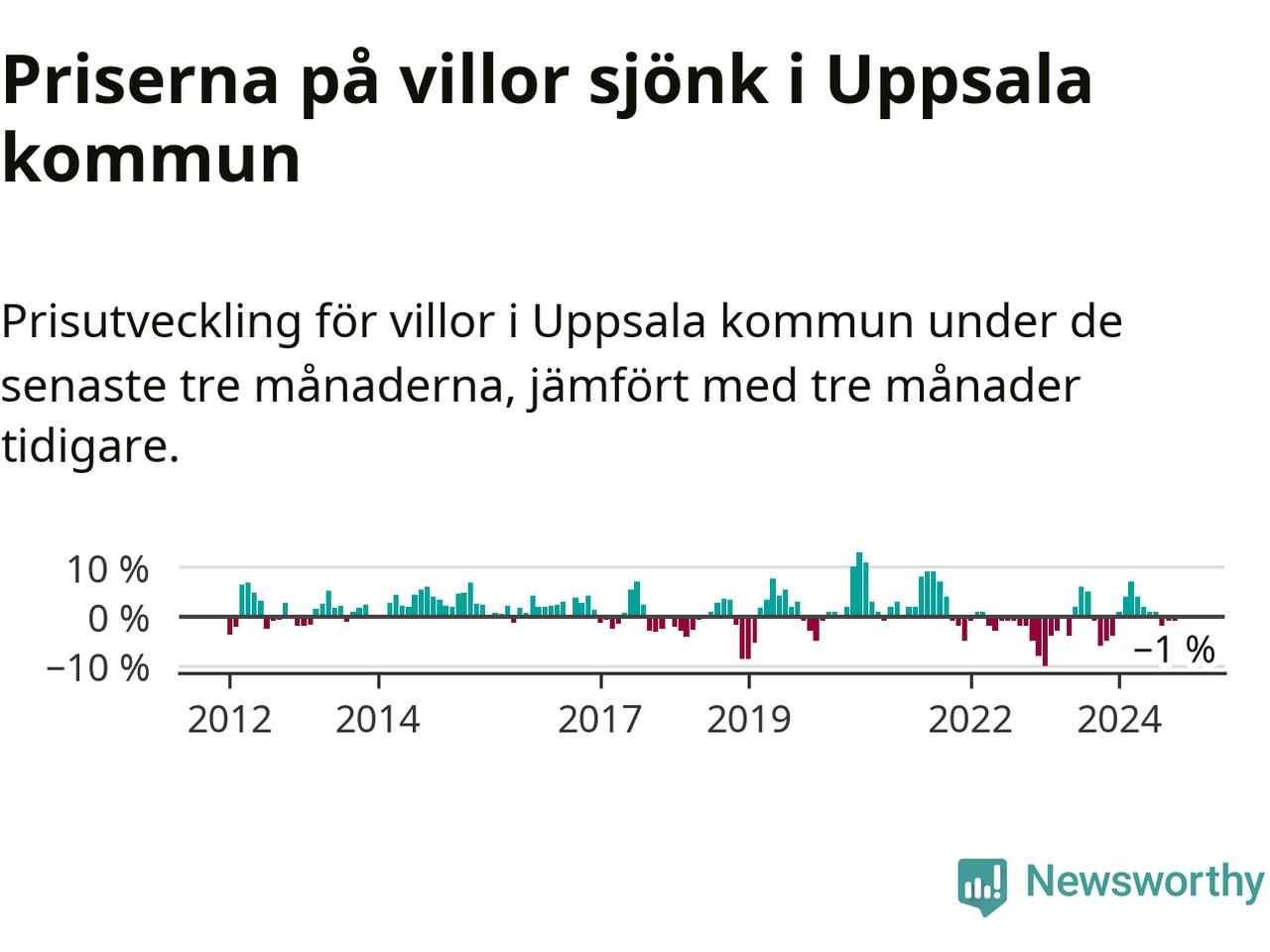 Statistiken visar även på en prisnedgång i Uppsala kommun. Medelpriset på försäljningarna av villor i kommunen var 1 procent lägre än för tre månader sedan. I hela Uppsala däremot ligger villapriserna stilla.