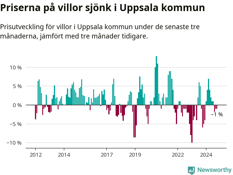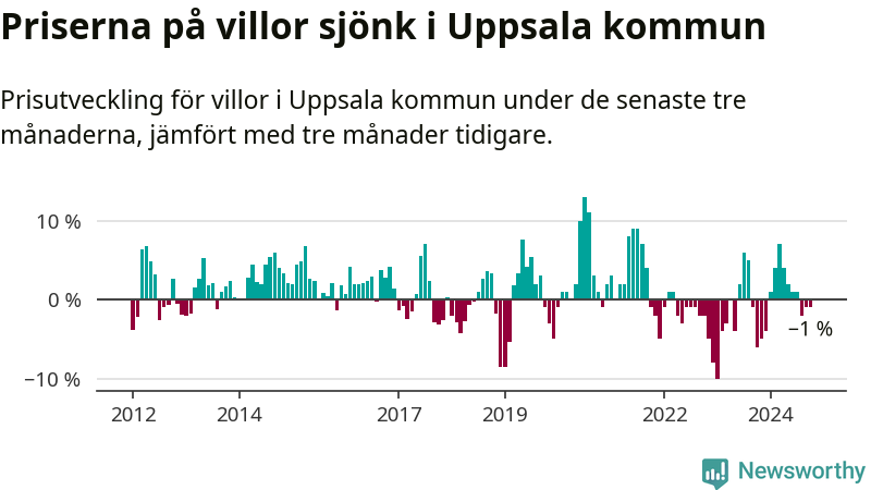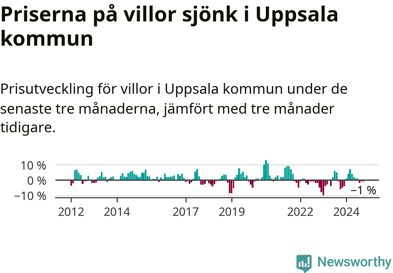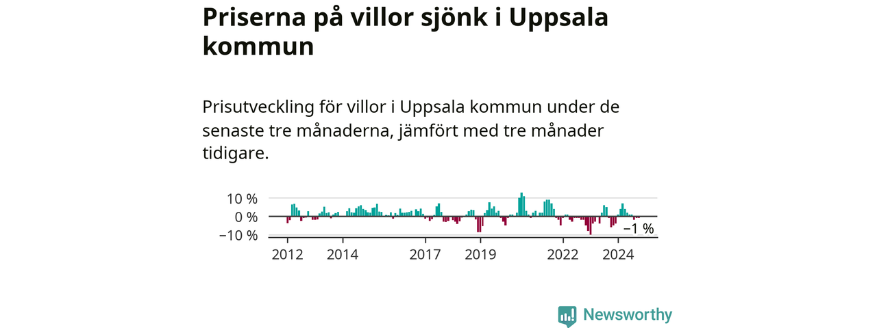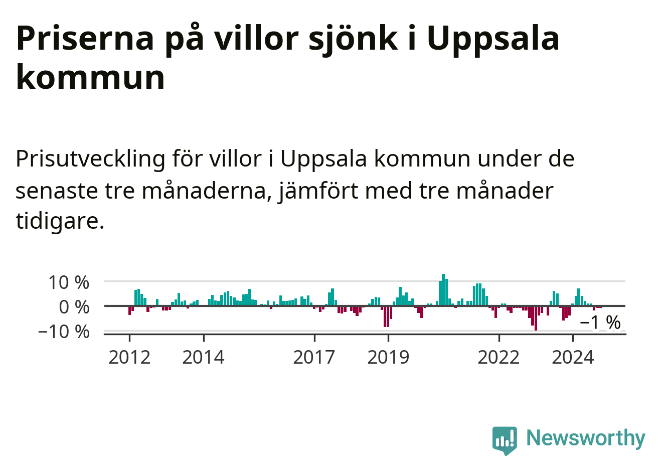 Statistiken visar även på en prisnedgång i Uppsala kommun. Medelpriset på försäljningarna av villor i kommunen var 1 procent lägre än för tre månader sedan. I hela Uppsala däremot ligger villapriserna stilla.