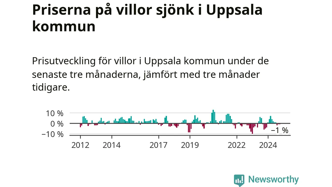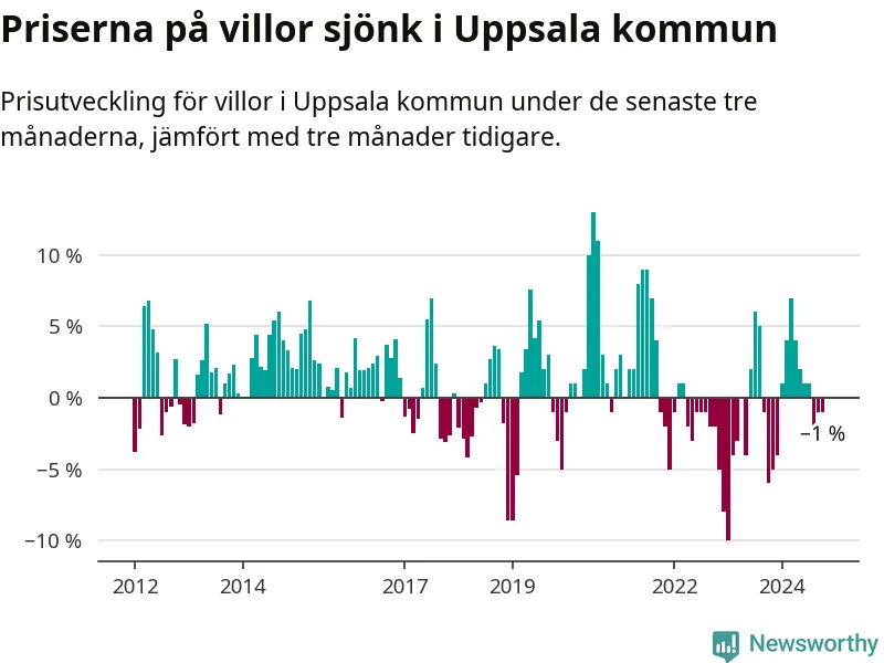Bland kommunerna i Uppsala län sjunker priserna på villor i fyra av åtta kommuner (där det redovisats uppgifter om prisutveckling). Störst var minskningen i Heby där priserna sjönk med 13 procent. I Östhammar däremot steg priserna med 9 procent.
