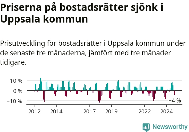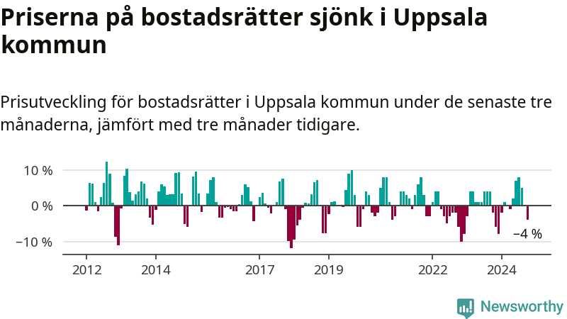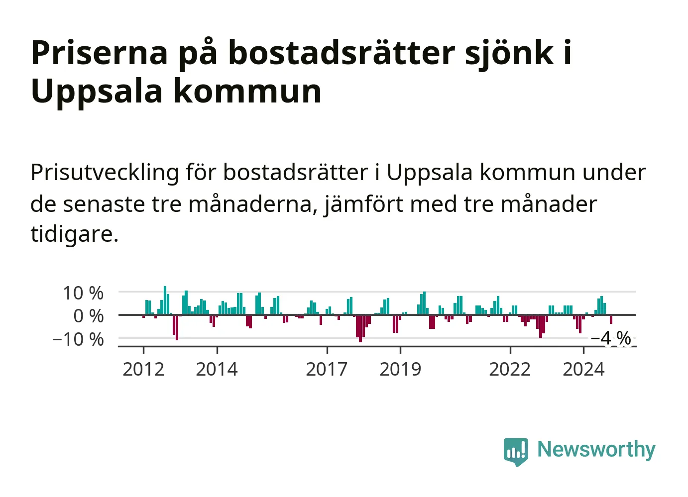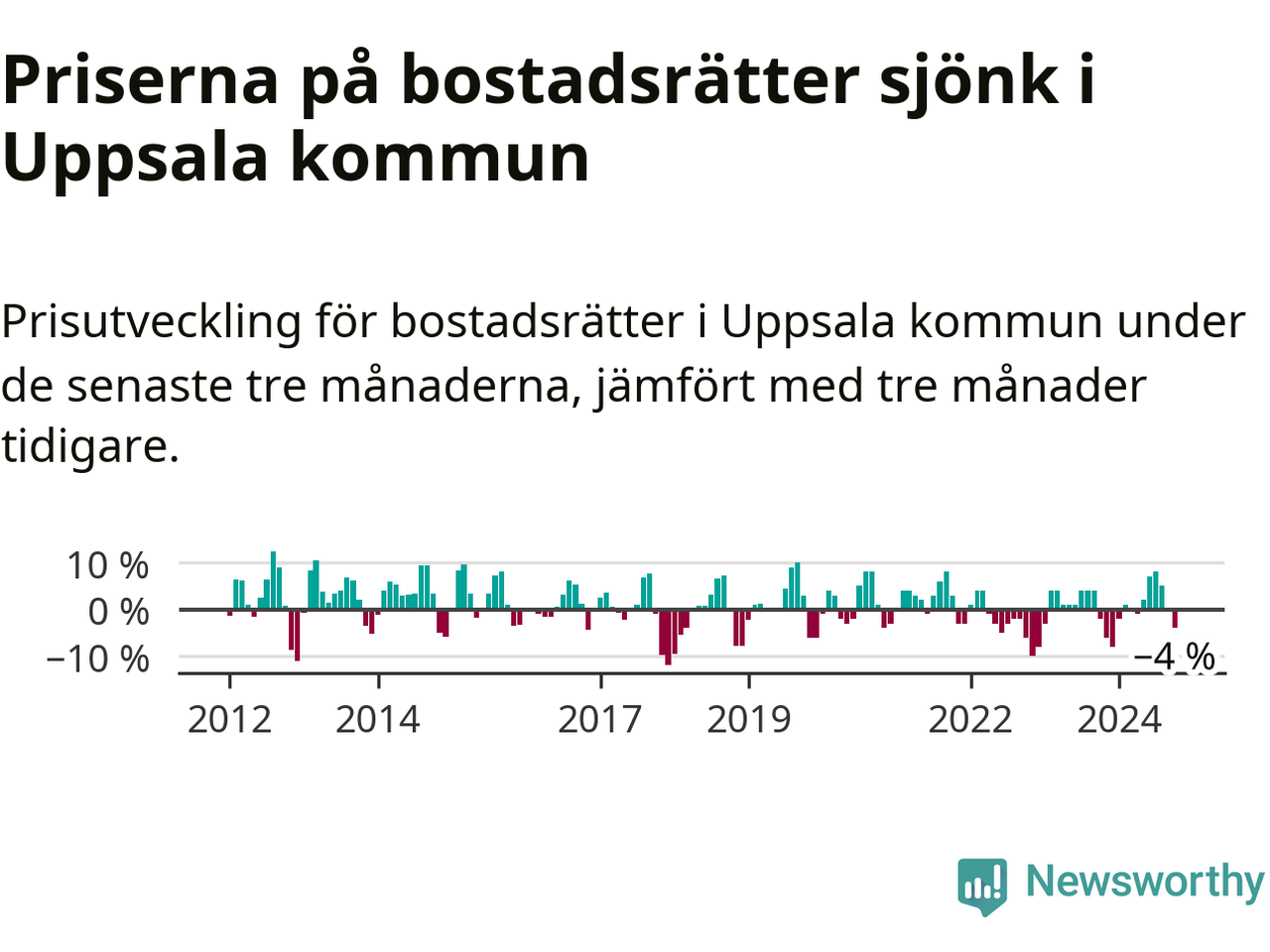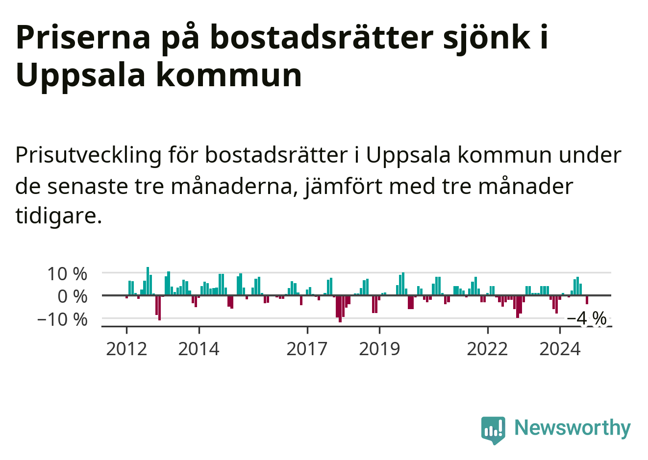 Priserna på bostadsrätter har gått ner i Uppsala kommun. Medelpriset på försäljningarna under de senaste tre månaderna visar på en nedgång med 4 procent.