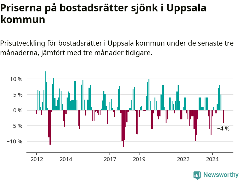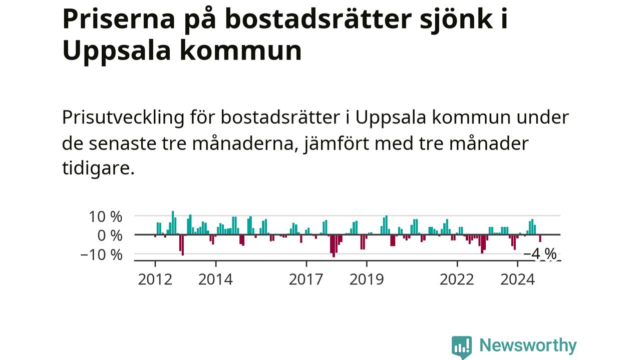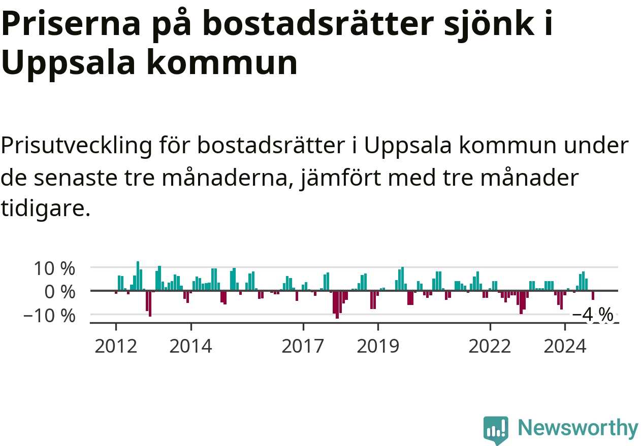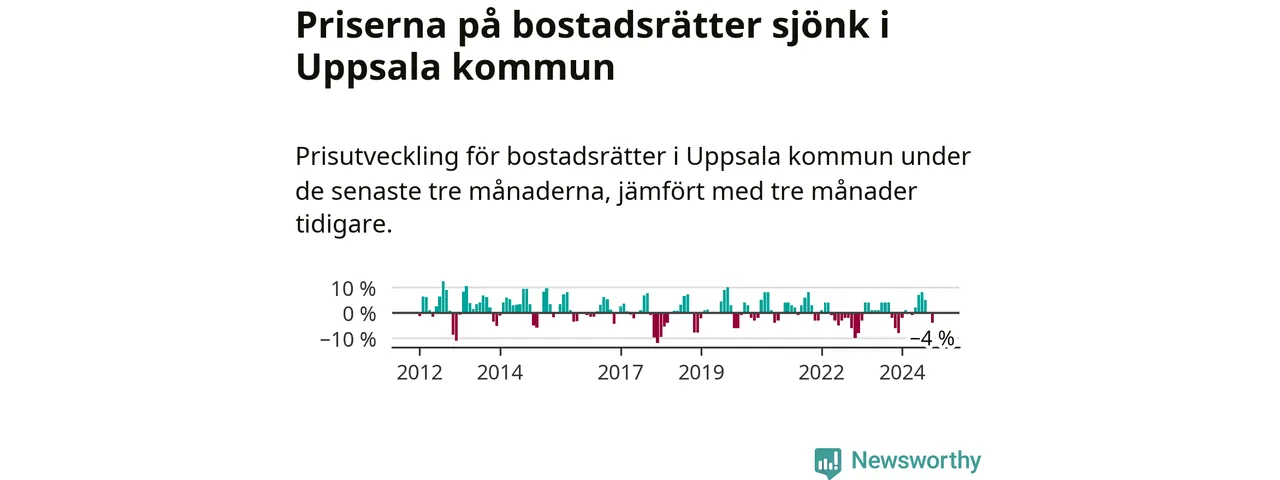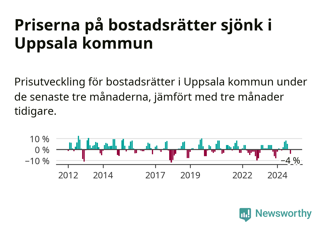 Priserna på bostadsrätter har gått ner i Uppsala kommun. Medelpriset på försäljningarna under de senaste tre månaderna visar på en nedgång med 4 procent.