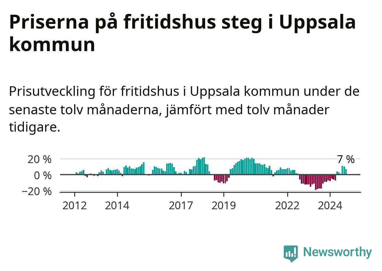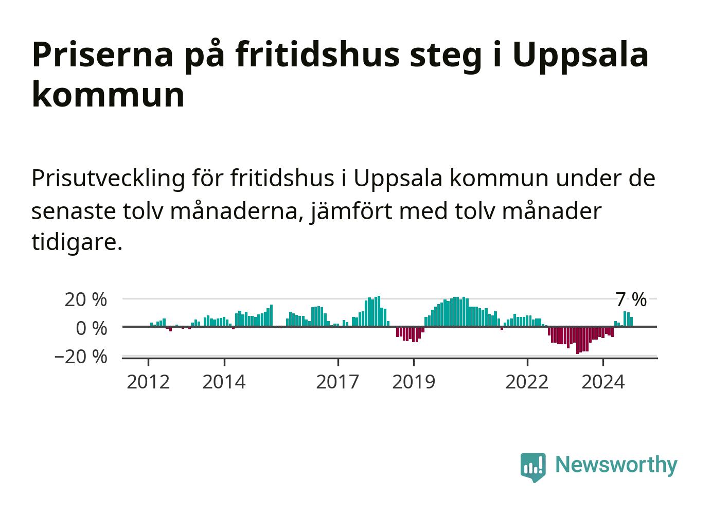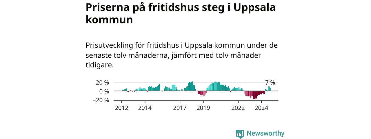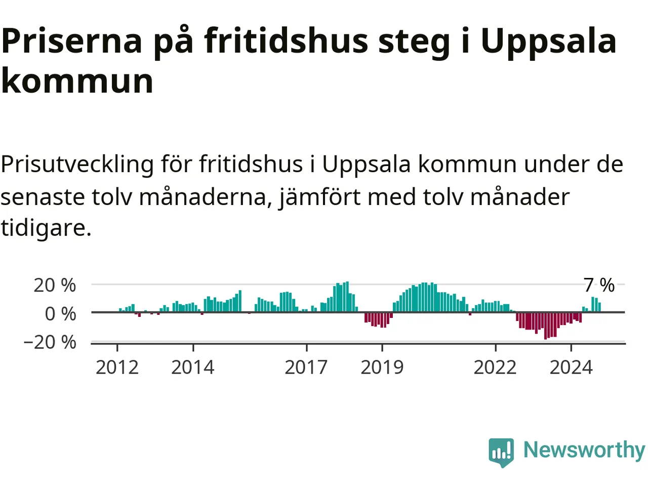 Priserna på fritidshus har gått upp i Uppsala kommun. Medelpriset på försäljningarna under de senaste tolv månaderna visar på en uppgång med 7 procent.