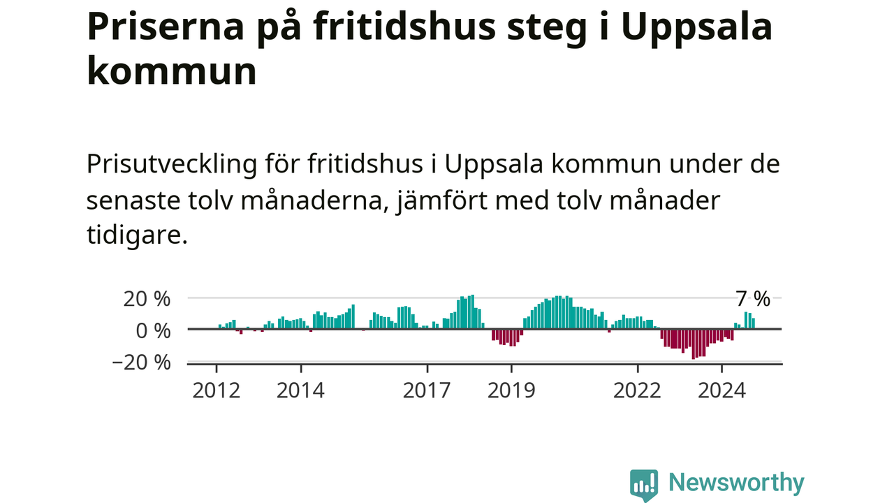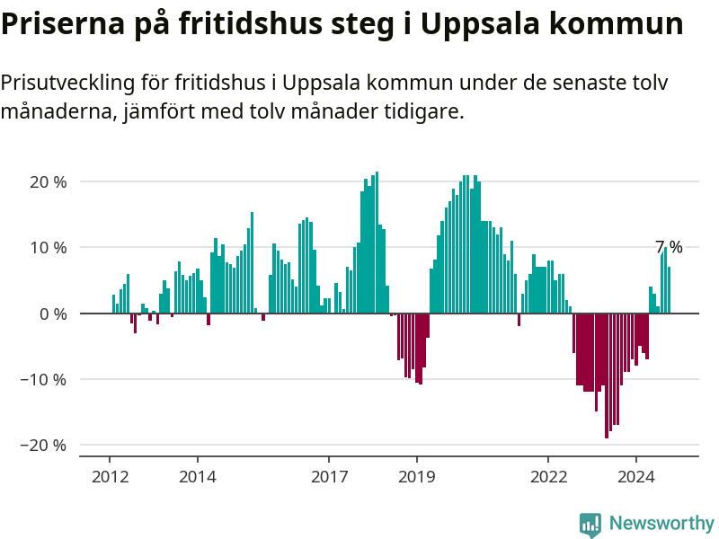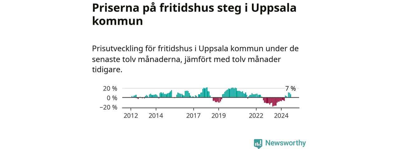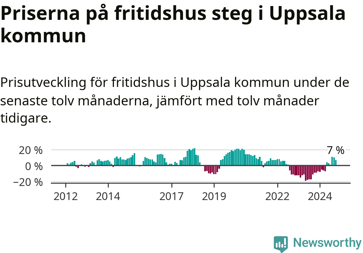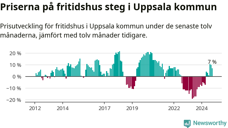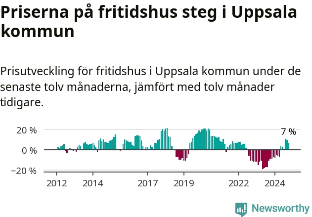 Priserna på fritidshus har gått upp i Uppsala kommun. Medelpriset på försäljningarna under de senaste tolv månaderna visar på en uppgång med 7 procent.