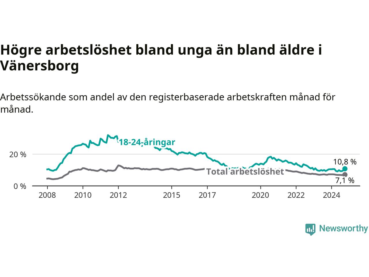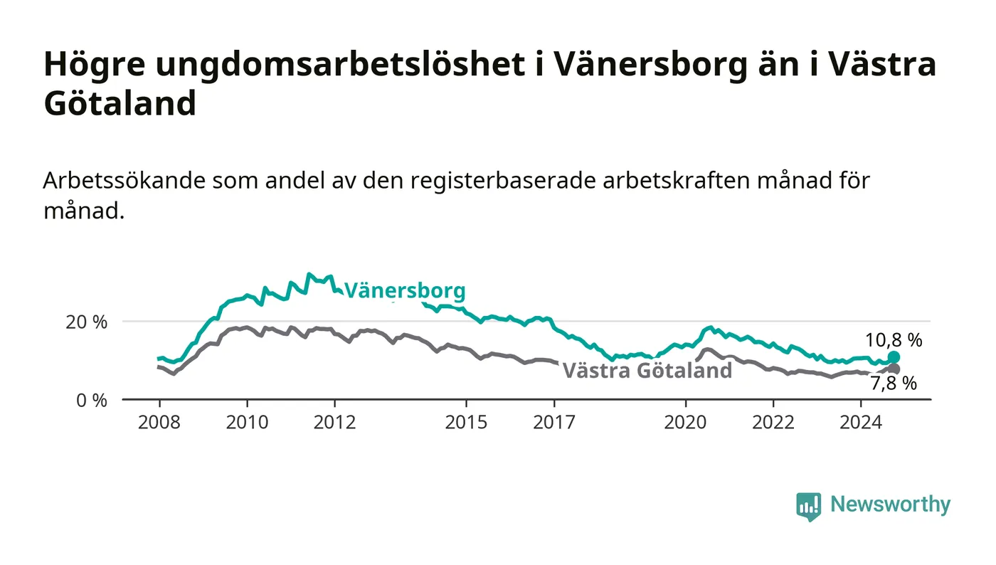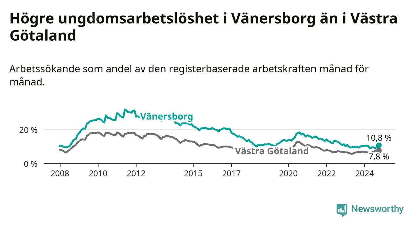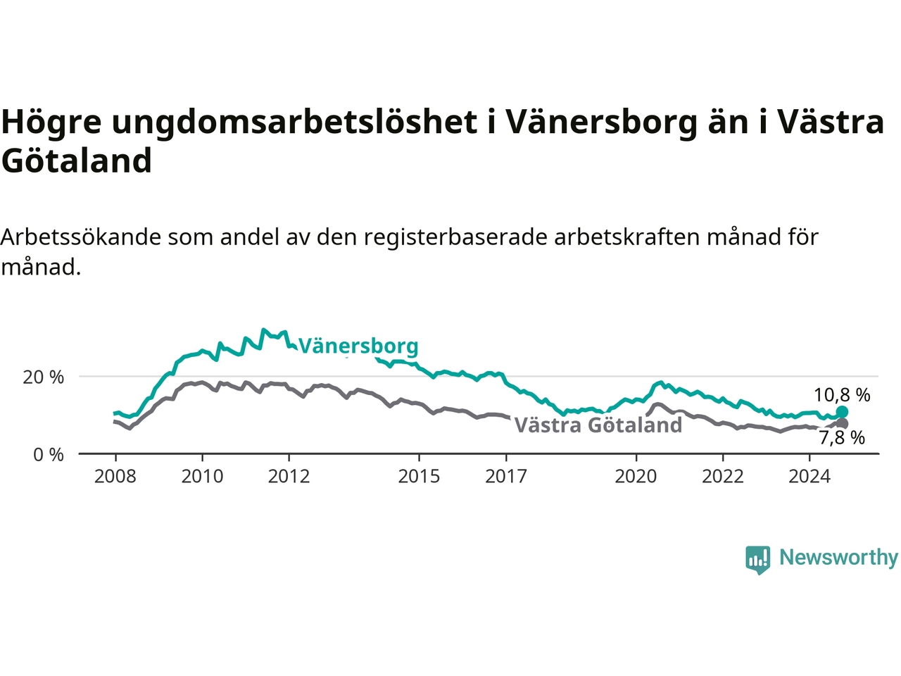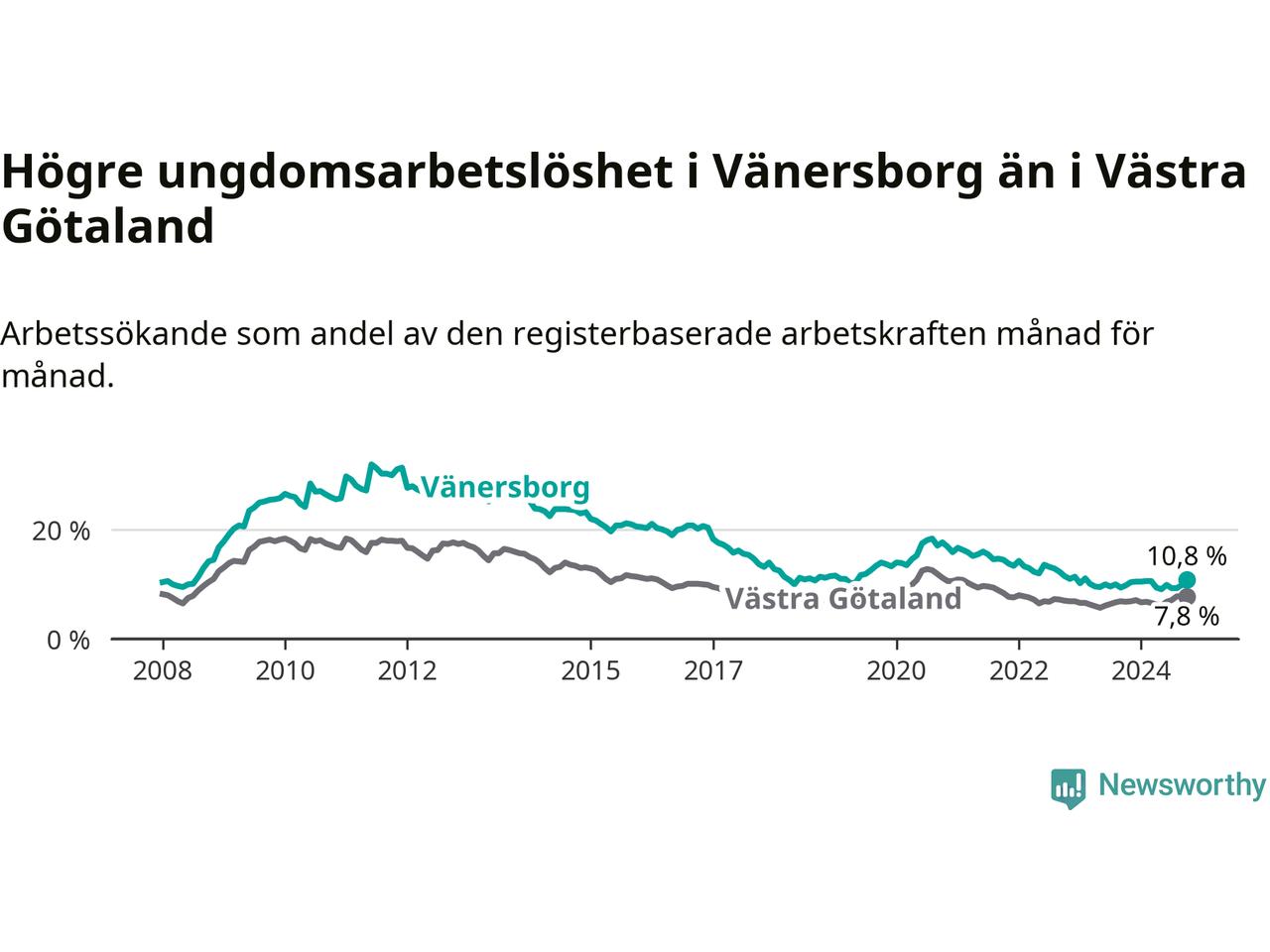 Precis som den totala arbetslösheten ligger ungdomsarbetslösheten i Vänersborg högre än i Västra Götaland som helhet. Skillnaden mellan kommunen och länet är 3,0 procentenheter.