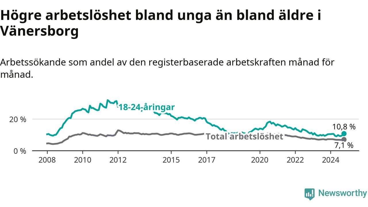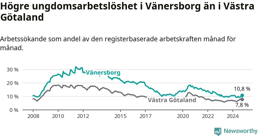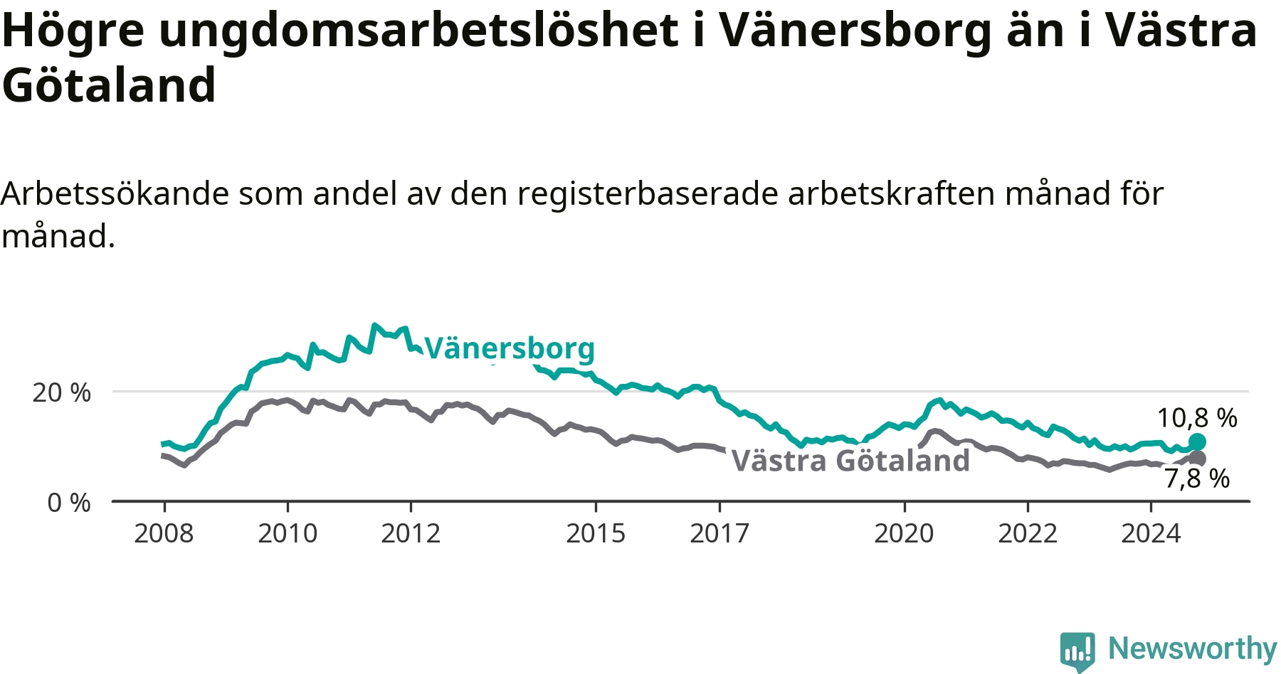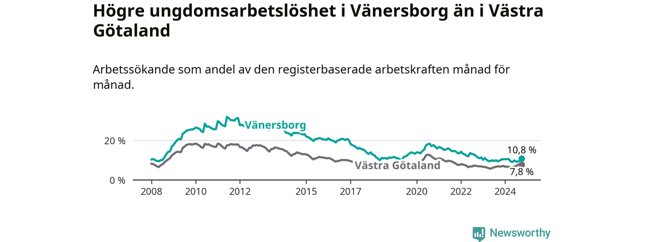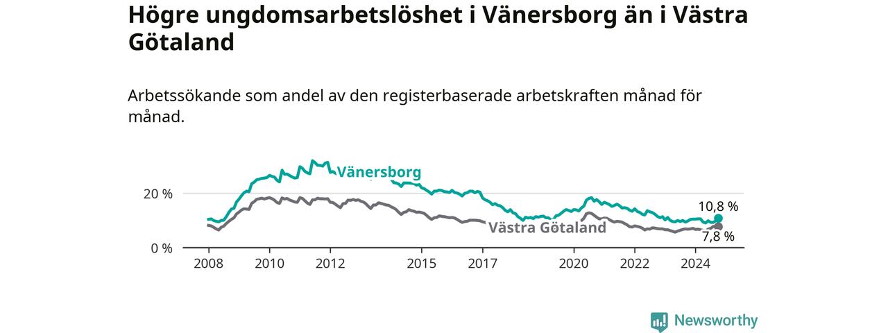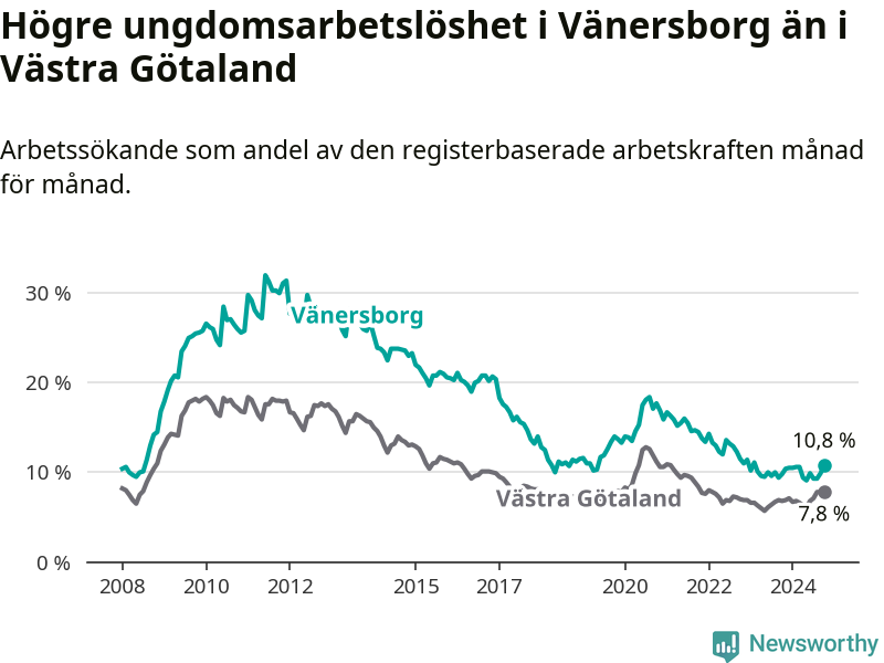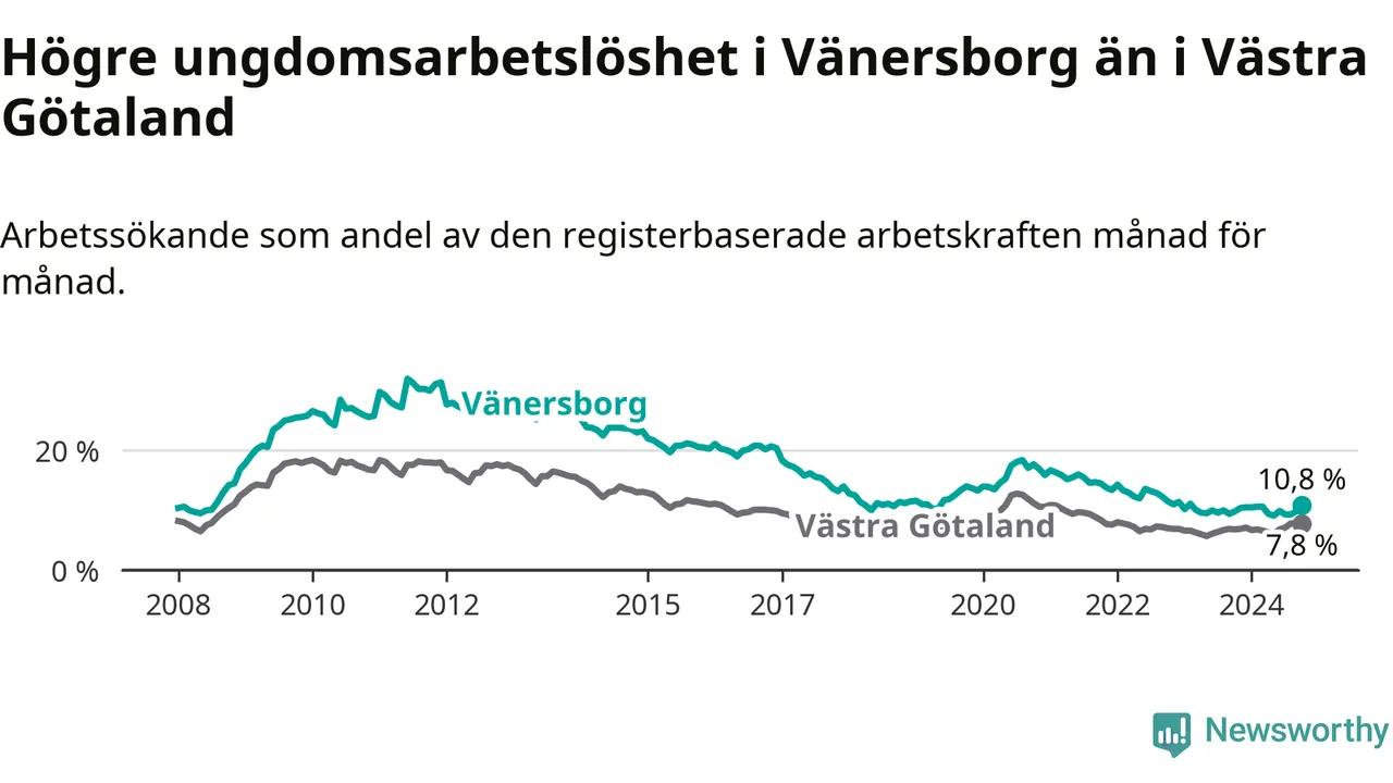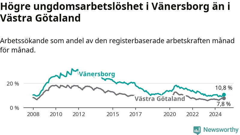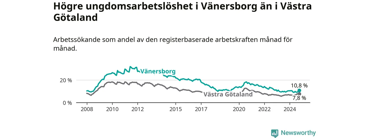Precis som den totala arbetslösheten ligger ungdomsarbetslösheten i Vänersborg högre än i Västra Götaland som helhet. Skillnaden mellan kommunen och länet är 3,0 procentenheter.