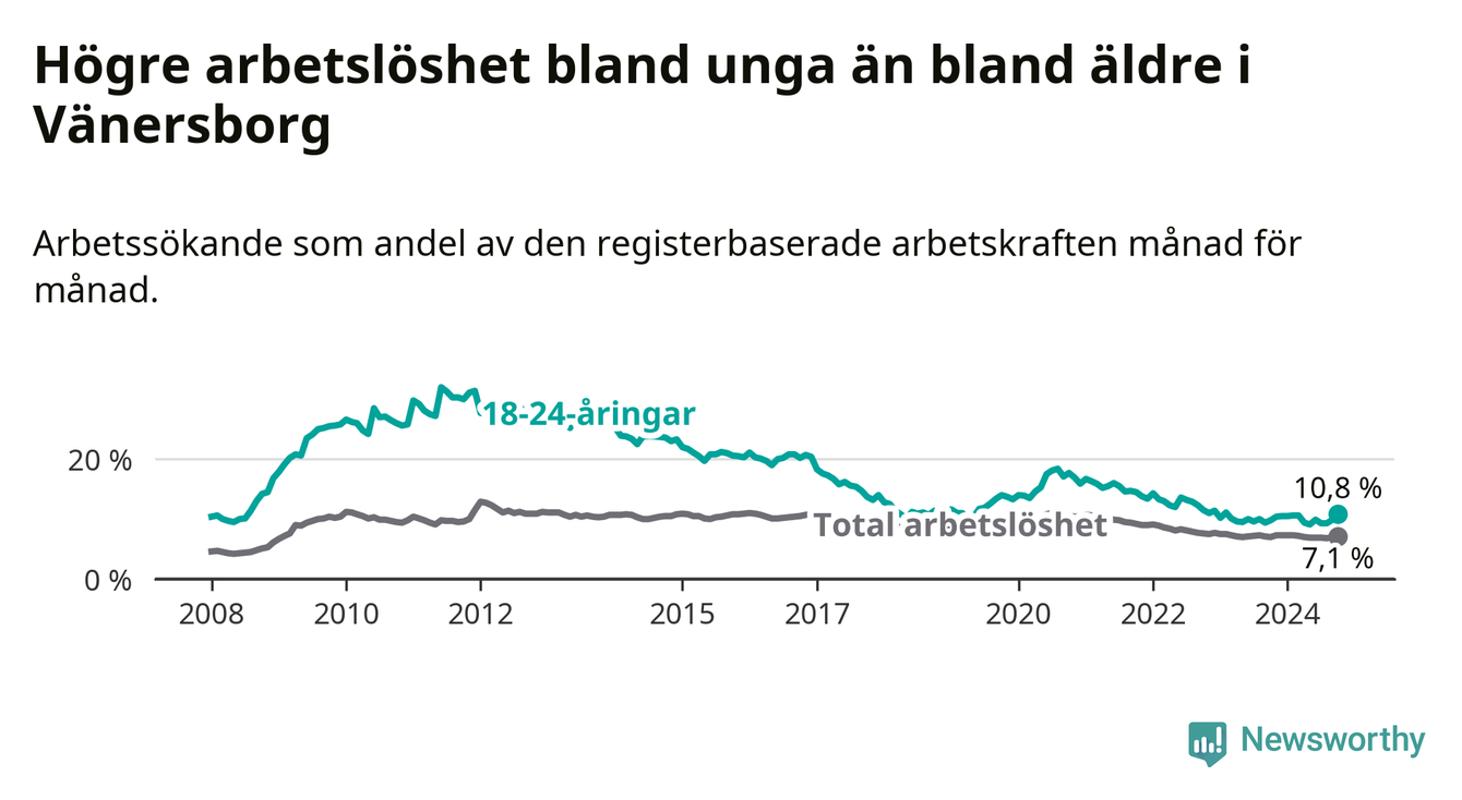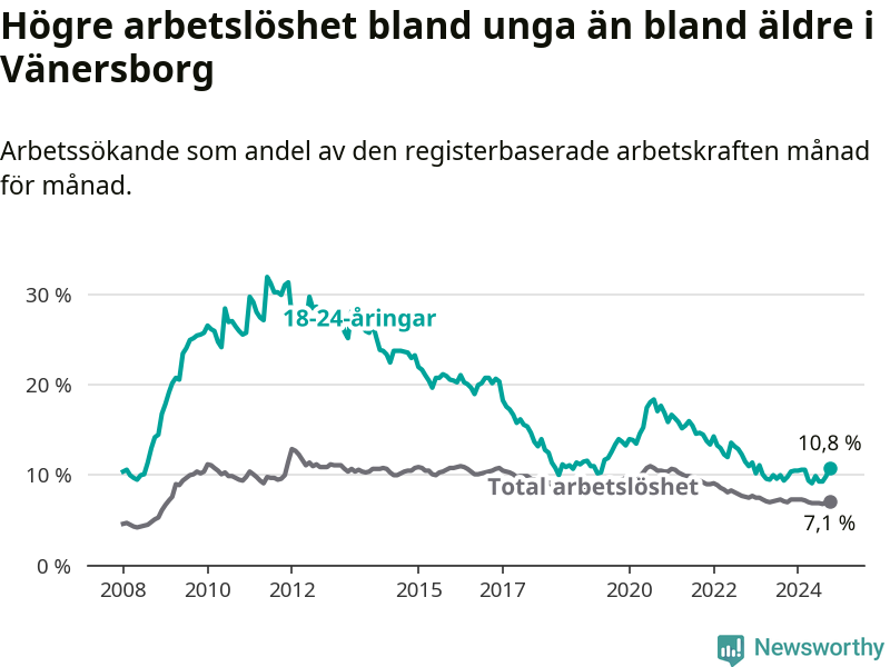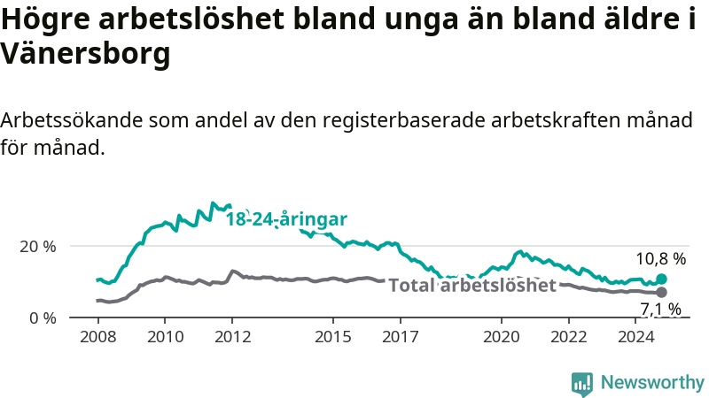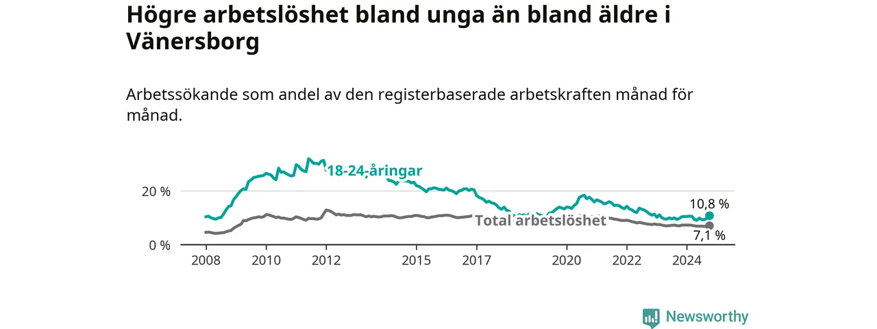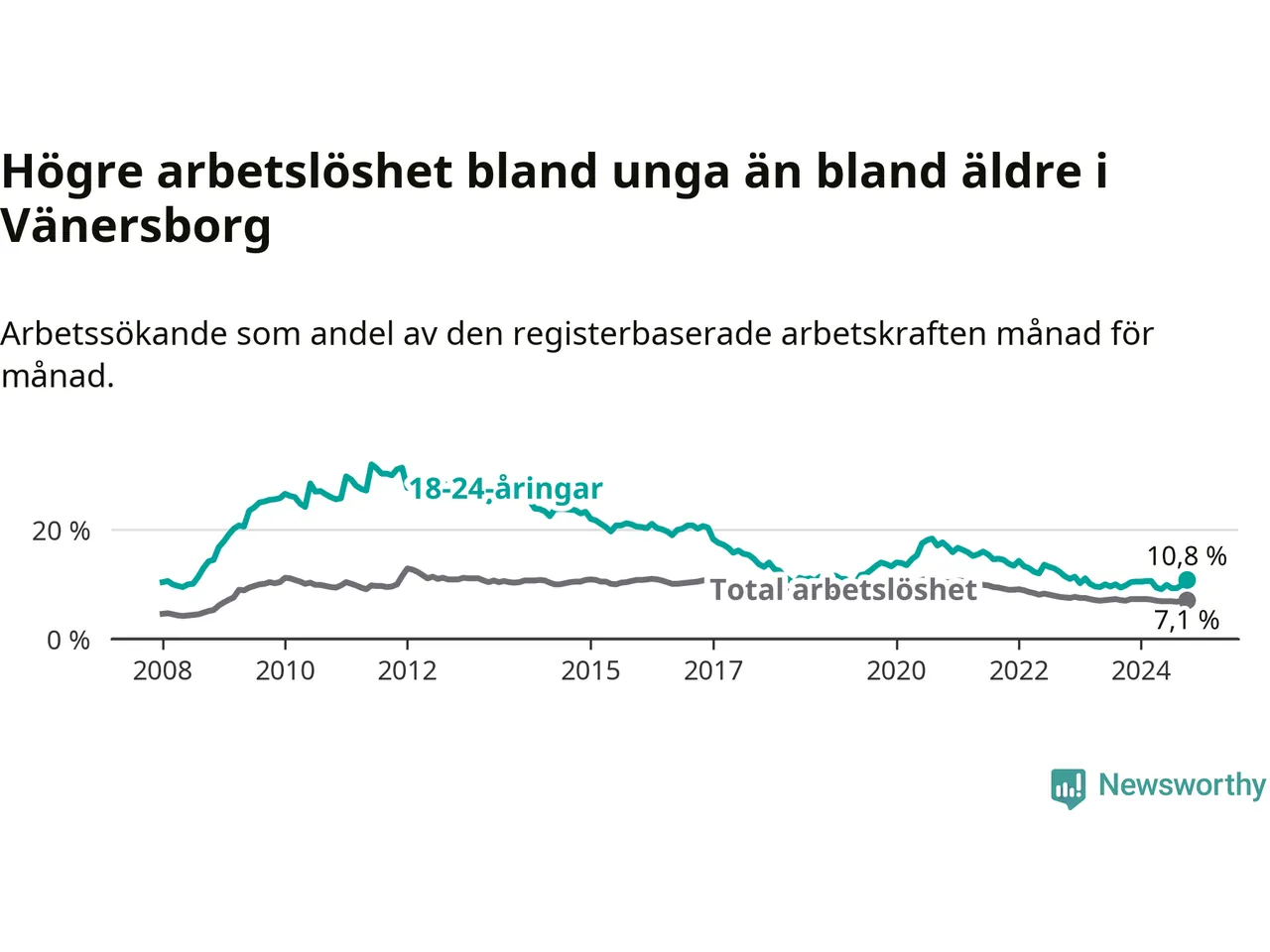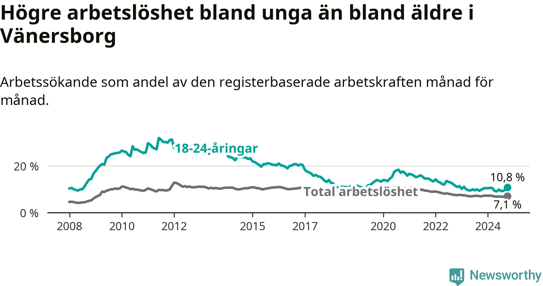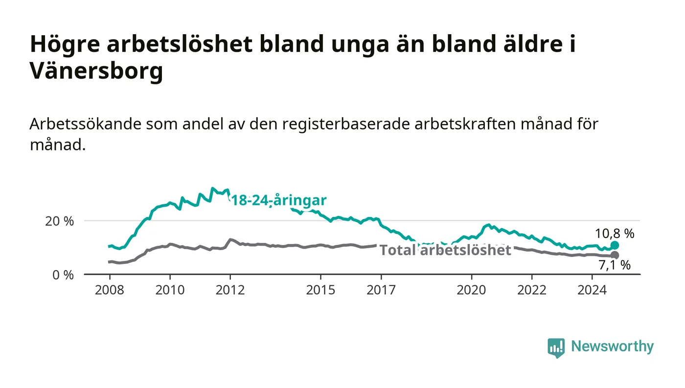Precis som den totala arbetslösheten ligger ungdomsarbetslösheten i Vänersborg högre än i Västra Götaland som helhet. Skillnaden mellan kommunen och länet är 3,0 procentenheter.