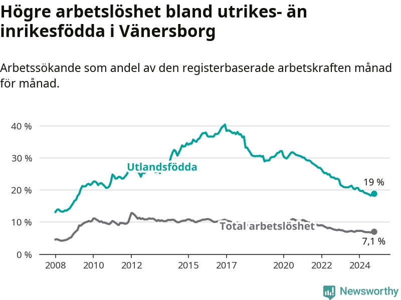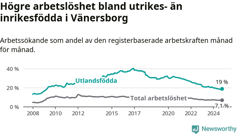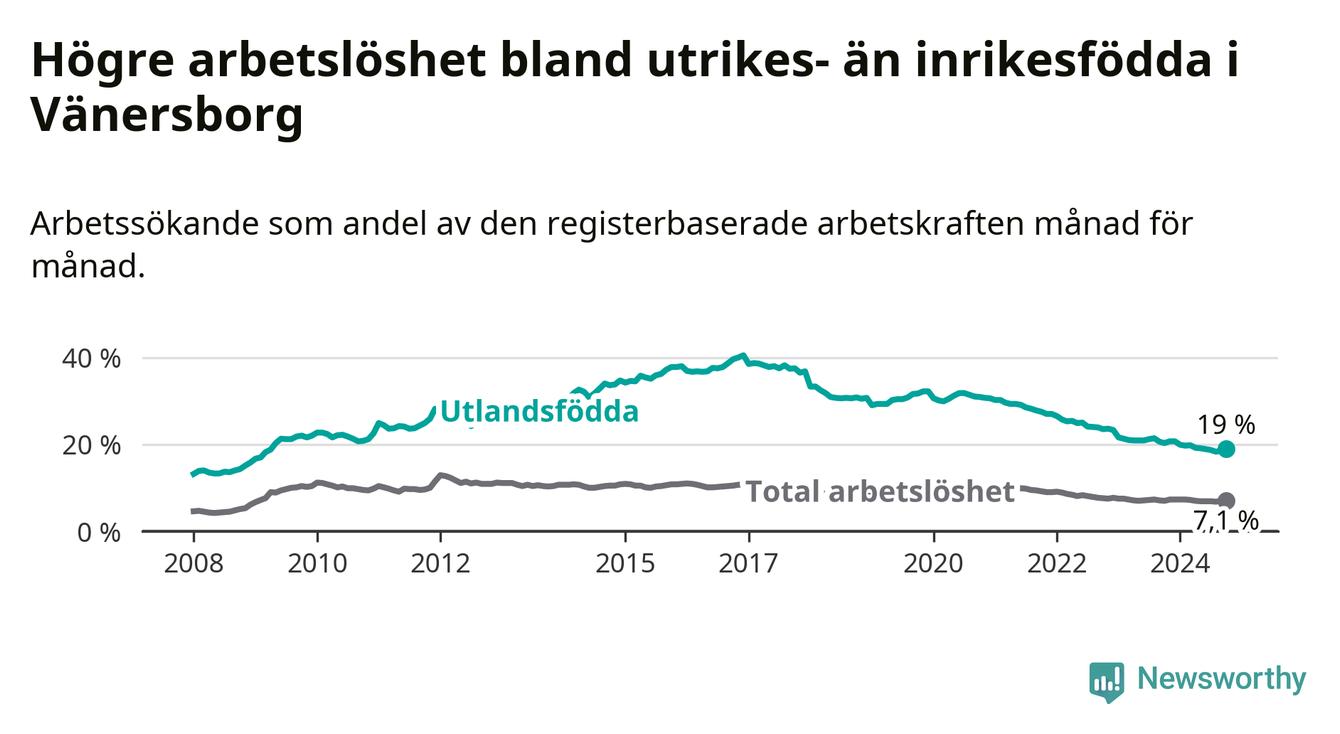 Arbetslösheten bland utlandsfödda var 19,0 procent i Vänersborg under oktober månad, motsvarande 698 av 3 674 personer. Det är 1,3 procentenheter färre än vid samma tidpunkt i fjol (−22 om man räknar personer). Därmed har de utlandsföddas arbetslöshet varit lägre än vid samma tidpunkt i fjol i över tre år i sträck. Sedan februari 2021 har arbetslösheten bland utlandsfödda minskat från 30,2 till 19,0 procent.