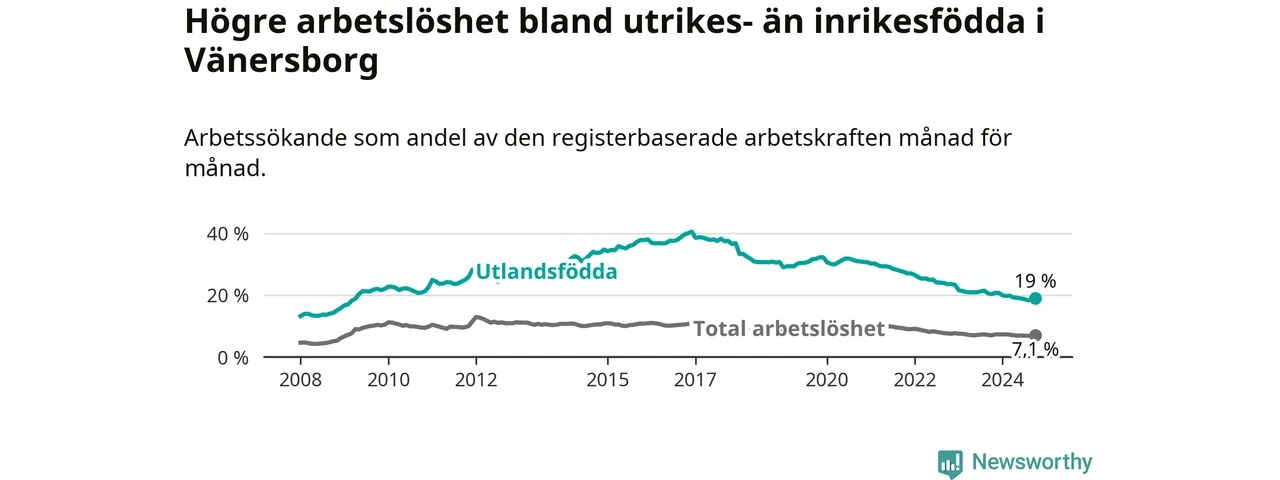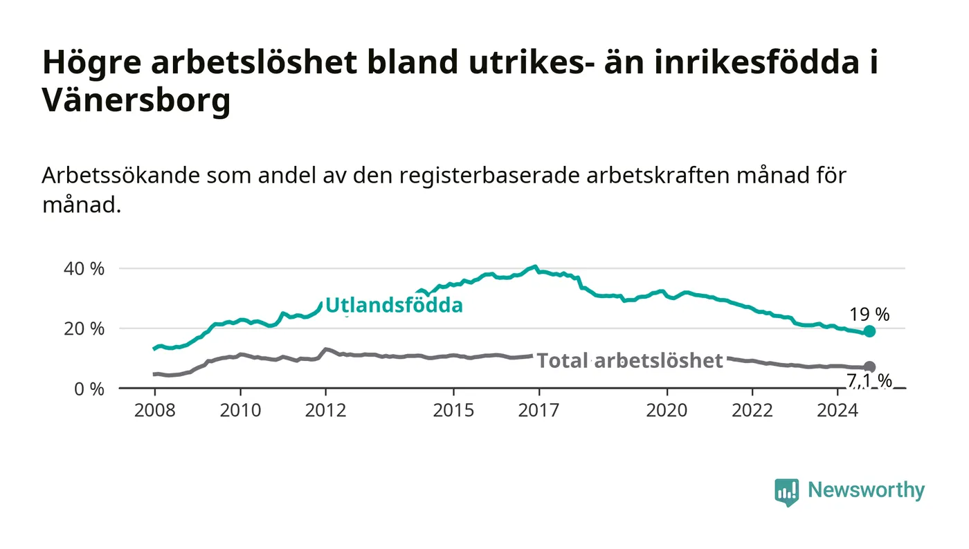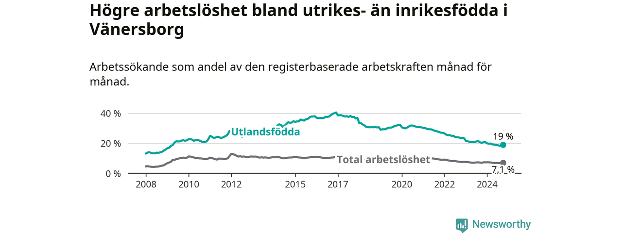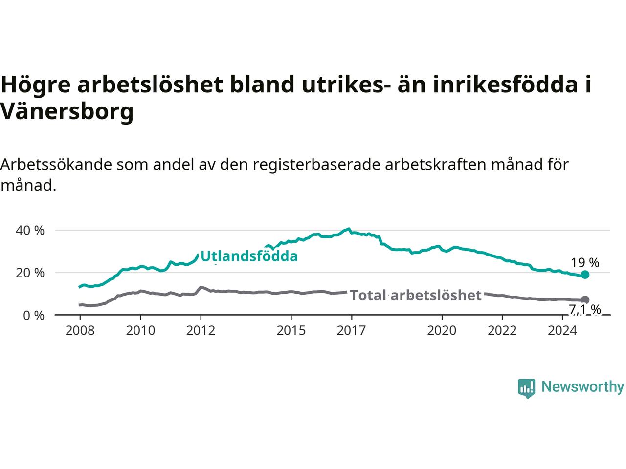 Skillnaden i arbetslöshet mellan utrikesfödda och hela befolkningen är 11,9 procentenheter i Vänersborg. Det är en mindre skillnad än för ett år sedan (−1,4 procentenheter).