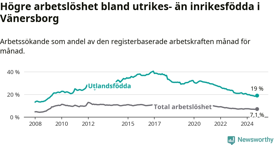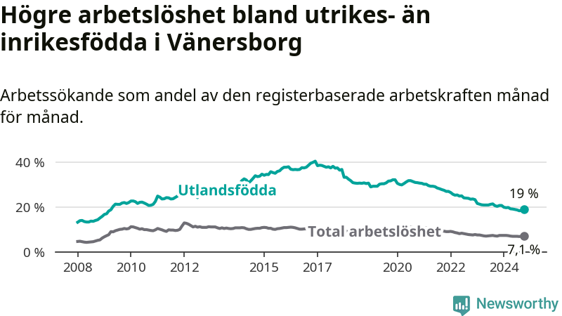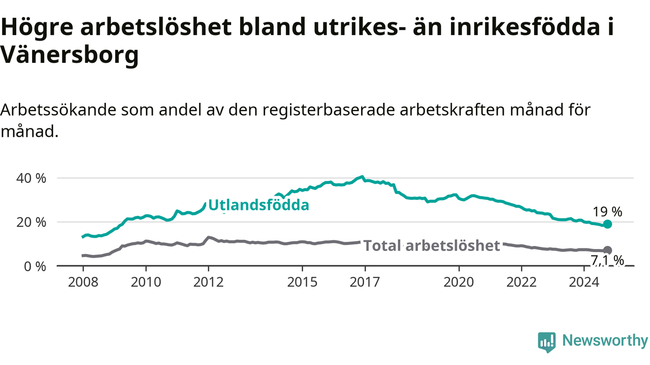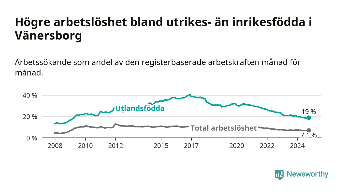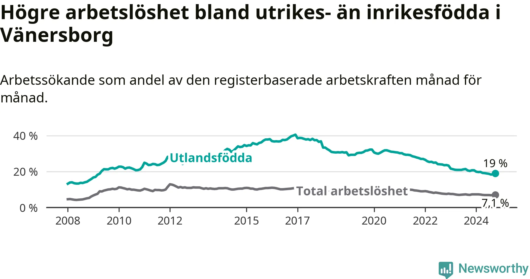 Skillnaden i arbetslöshet mellan utrikesfödda och hela befolkningen är 11,9 procentenheter i Vänersborg. Det är en mindre skillnad än för ett år sedan (−1,4 procentenheter).