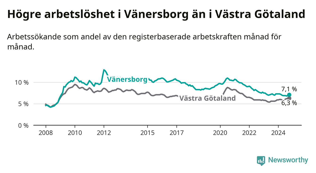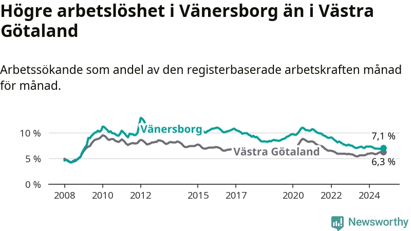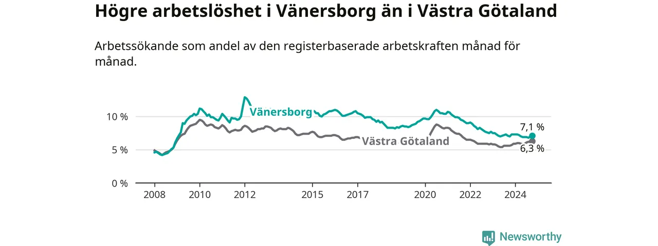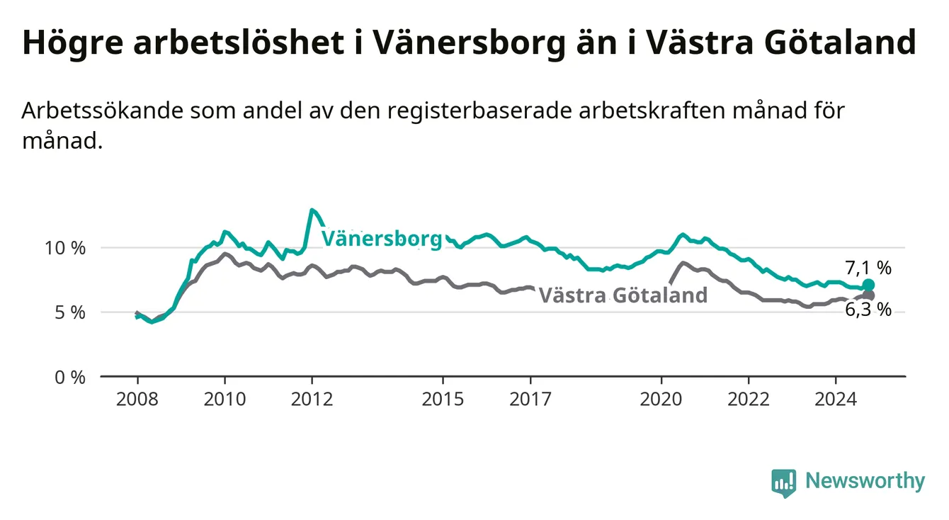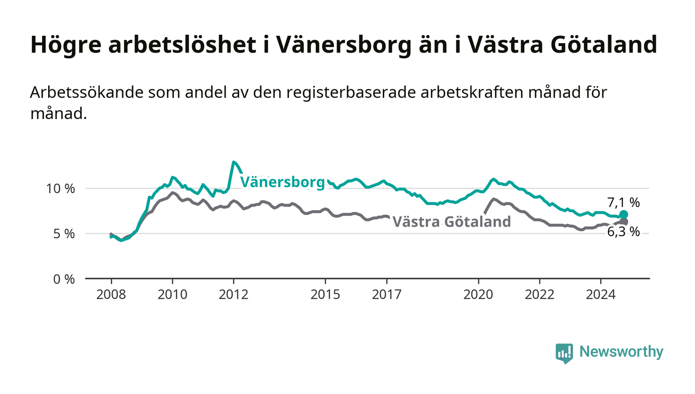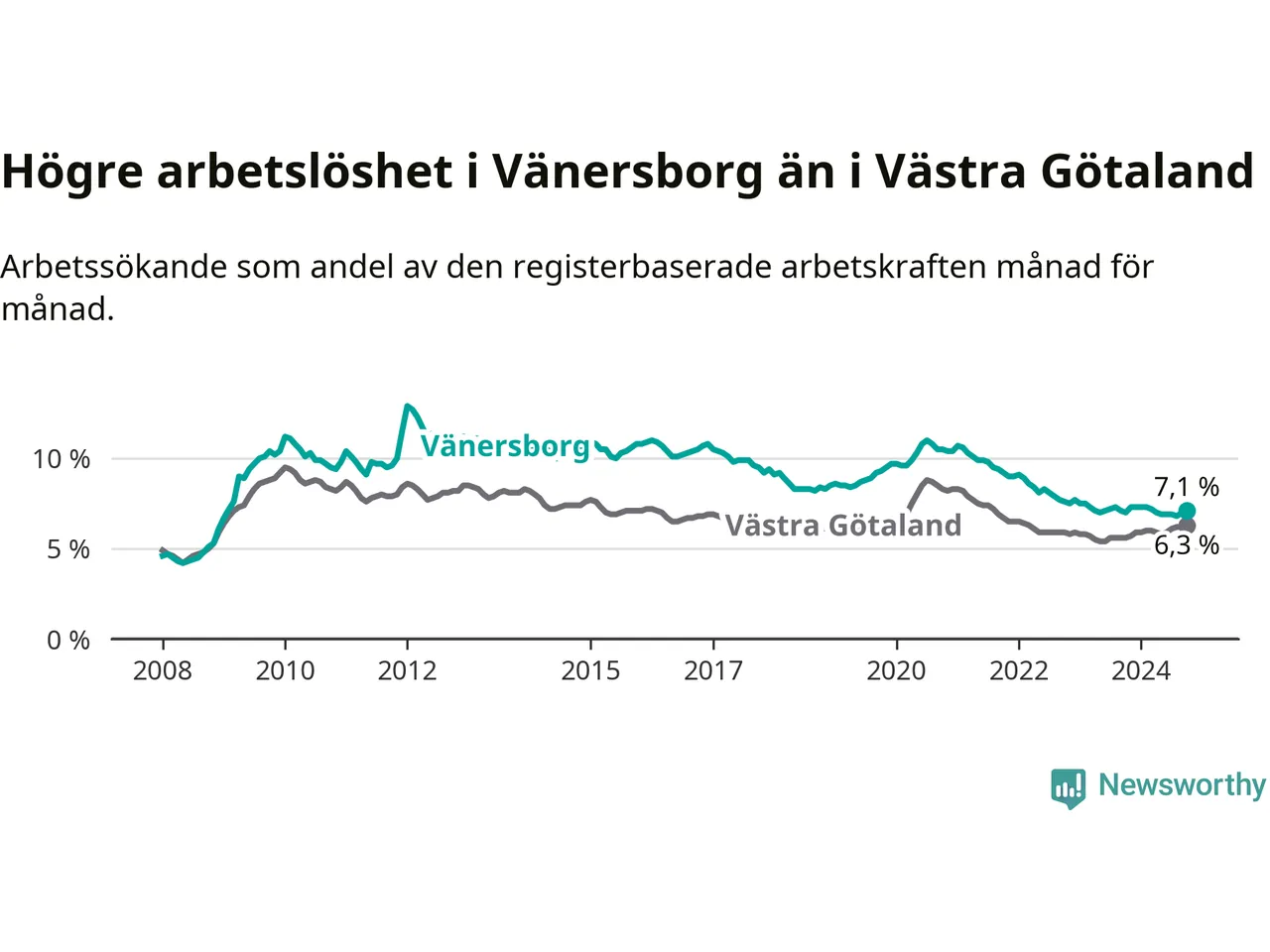 Vänersborg hade redan tidigare högre arbetslöshet än snittet i hela Västra Götalands län och nu växer klyftan (7,1 procent i kommunen, jämfört med 6,3 procent i hela länet). Öckerö har den lägsta arbetslösheten i länet (2,9 procent), medan Gullspång har den högsta (8,8 procent). För att Vänersborg skulle komma ner i samma arbetslöshetsnivå som Öckerö skulle 802 personer behöva sysselsättas.