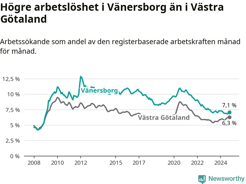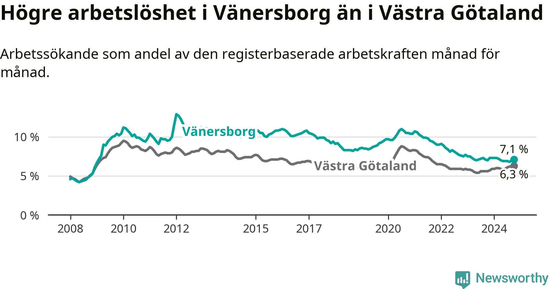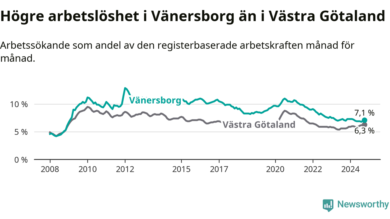 Under oktober månad rapporterade Vänersborgs kommun en total arbetslöshet på 7,1 procent. Det är en ökning jämfört med samma tidpunkt i fjol (+0,1 procentenheter). Även i Västra Götalands län stiger arbetslösheten .