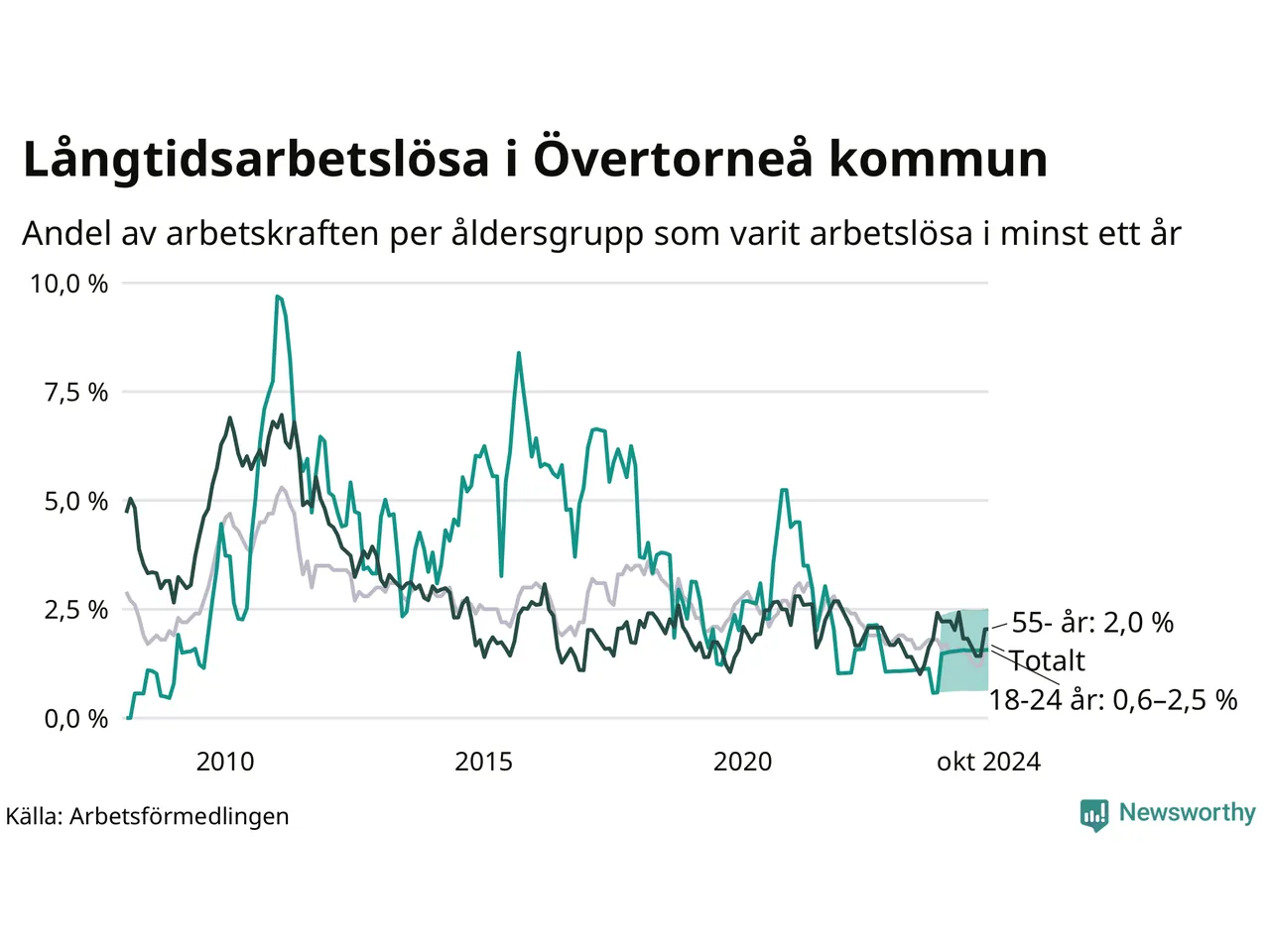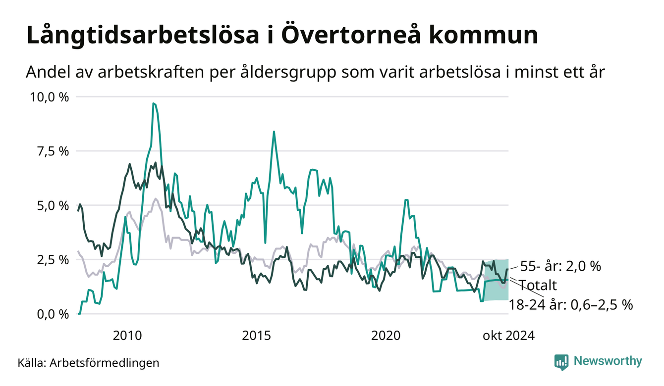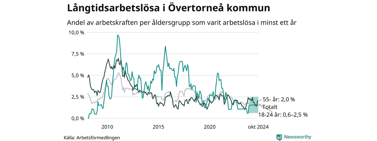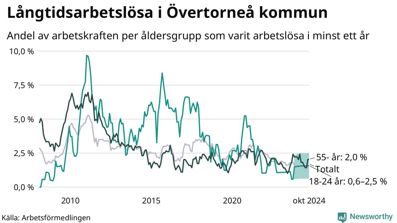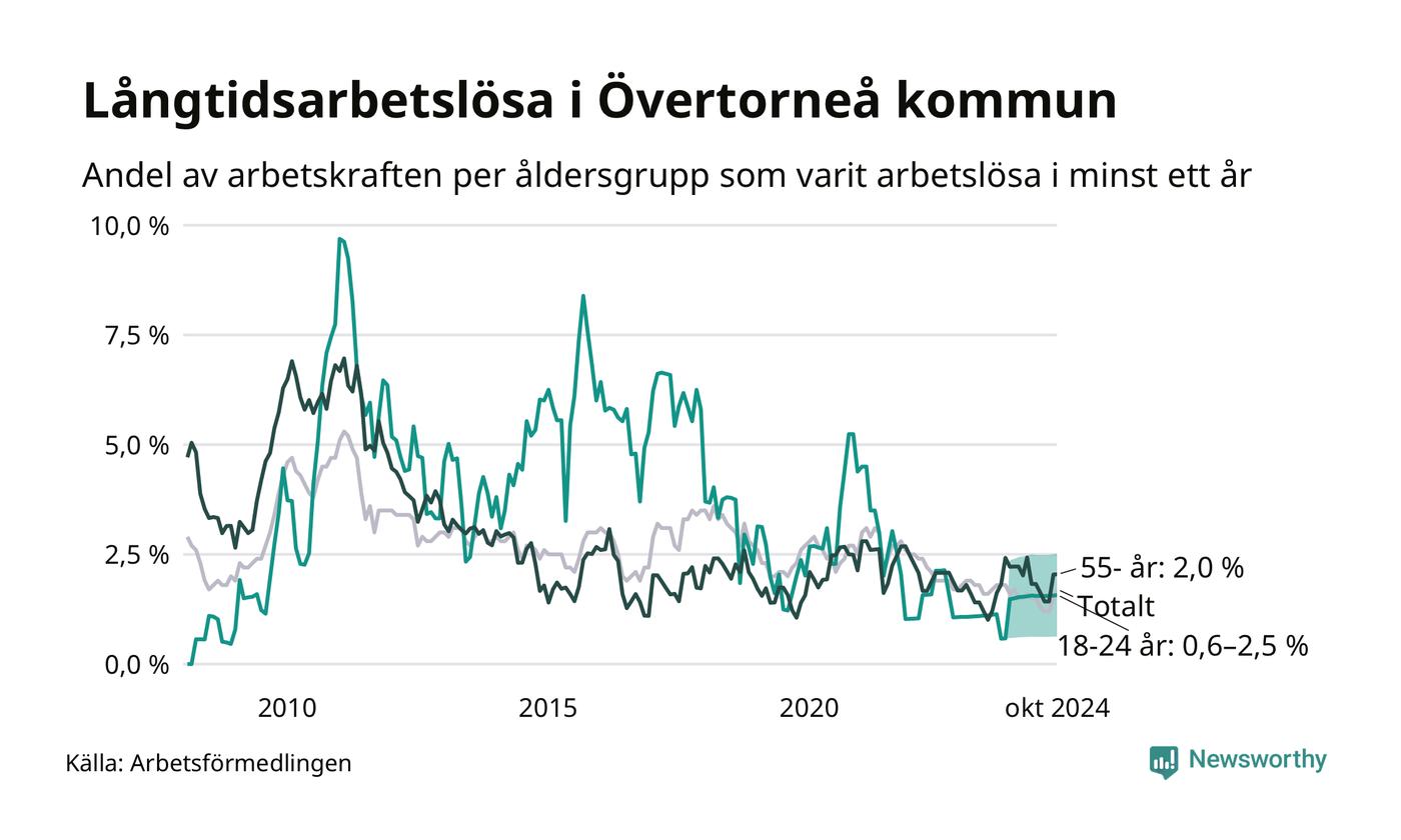 Av de 27 personerna som varit arbetslösa i mer än ett år i Övertorneå kommun är tio personer mellan 55 och 651 år och mellan en och fyra är mellan 18 och 24 år. För den äldre gruppen är andelen arbetslösa 2,0 procent medan den i den yngre gruppen är mellan 0,6 och 2,5 procent. Även i riket som helhet är långtidsarbetslösheten högre i gruppen äldre.