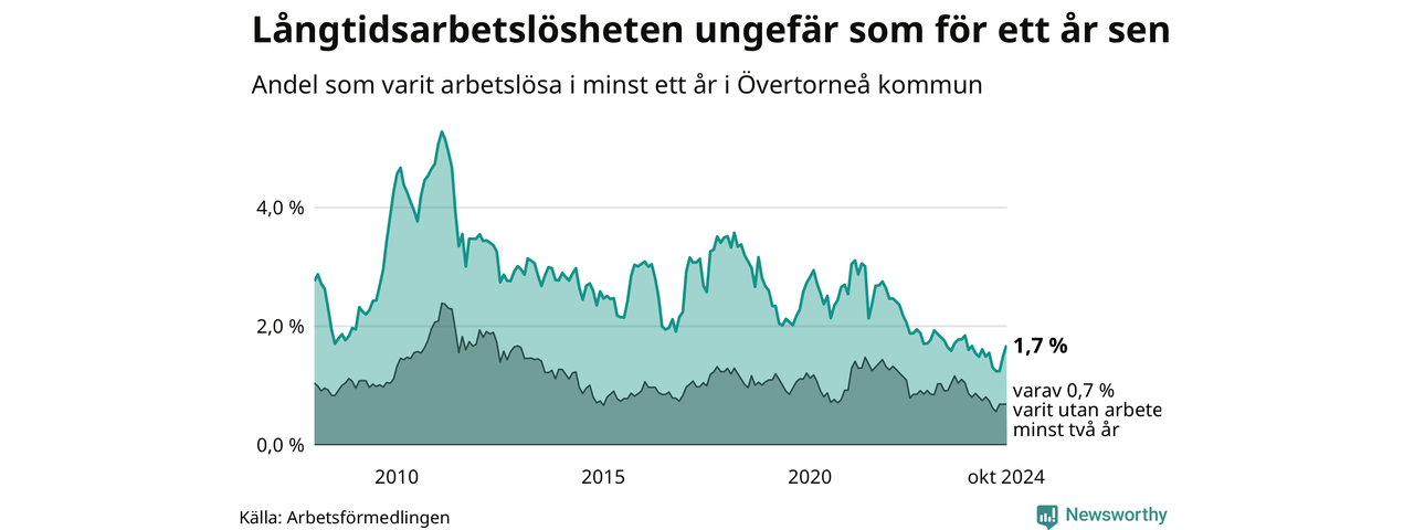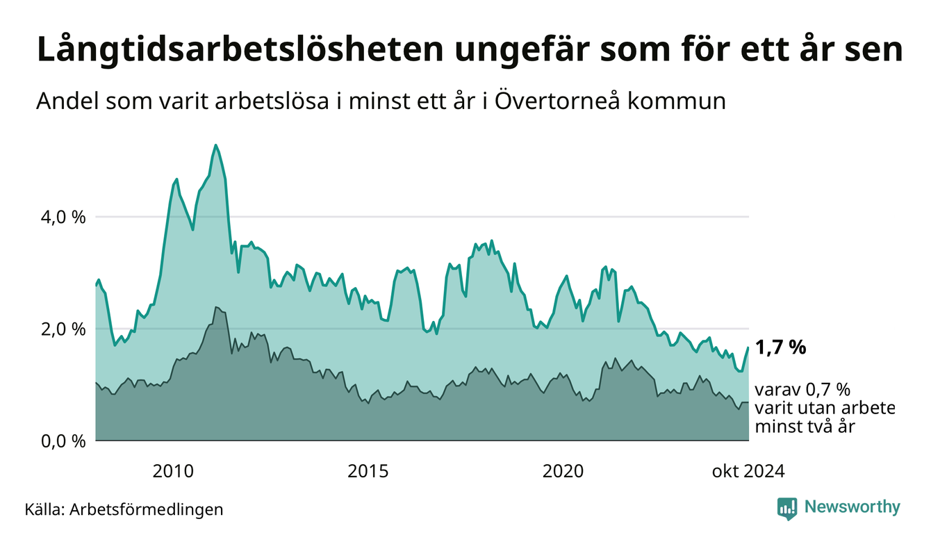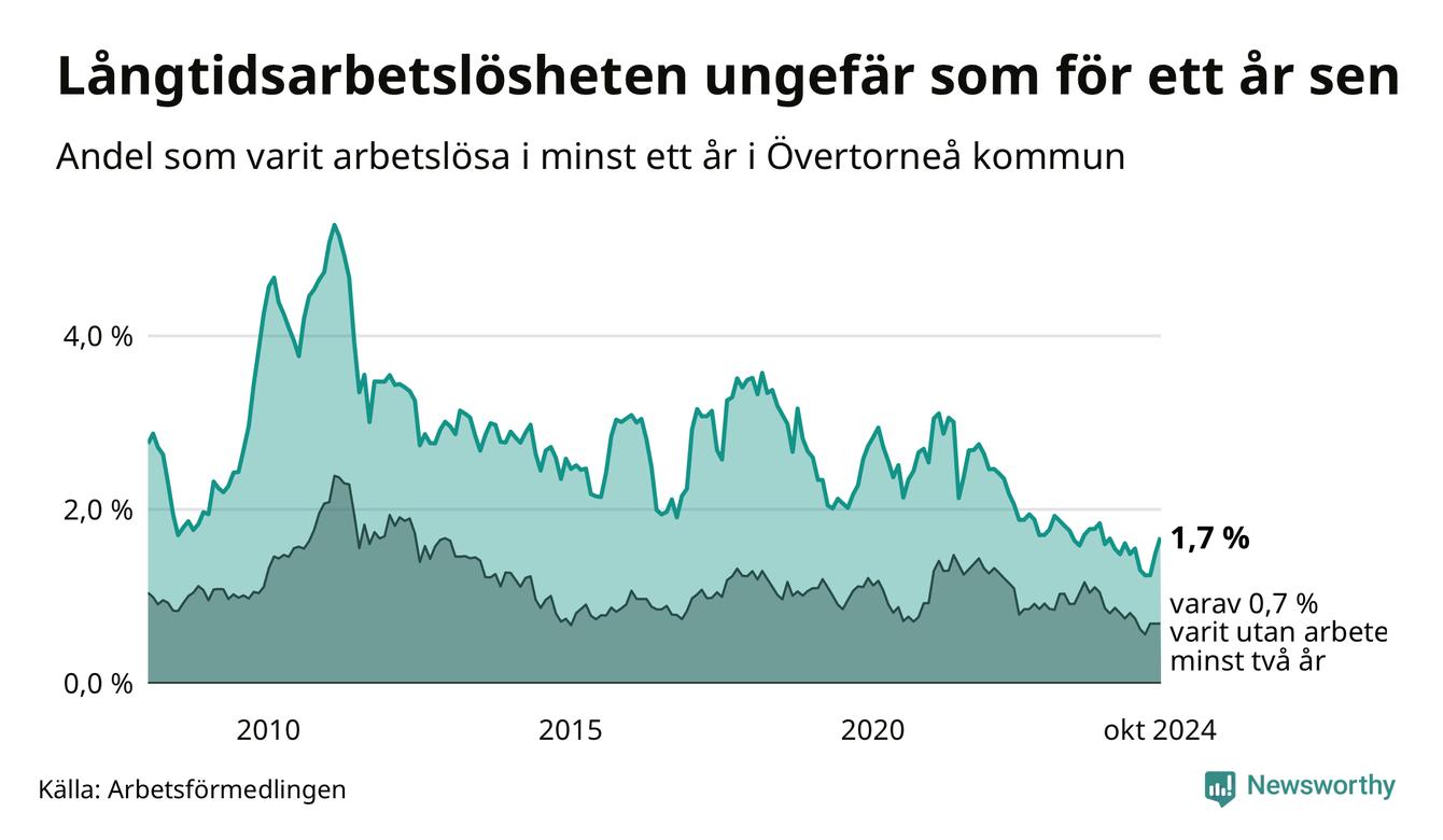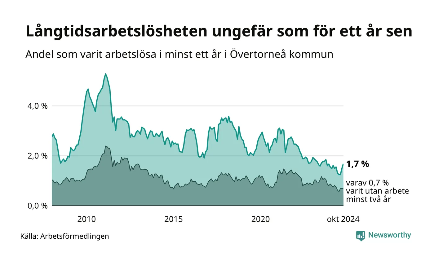I oktober hade 27 Övertorneåbor varit arbetslösa i minst ett år, vilket är tre fler än månaden innan. 27 personer motsvarar 1,7 procent av arbetskraften i kommunen – andelen långtidsarbetslösa är ungefär på samma nivå som för ett år sedan.