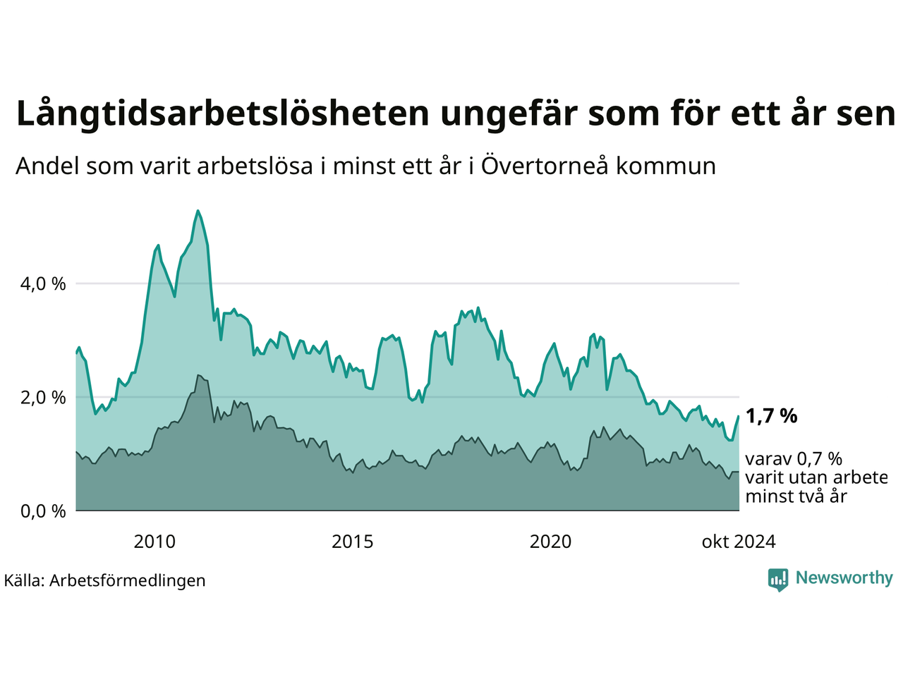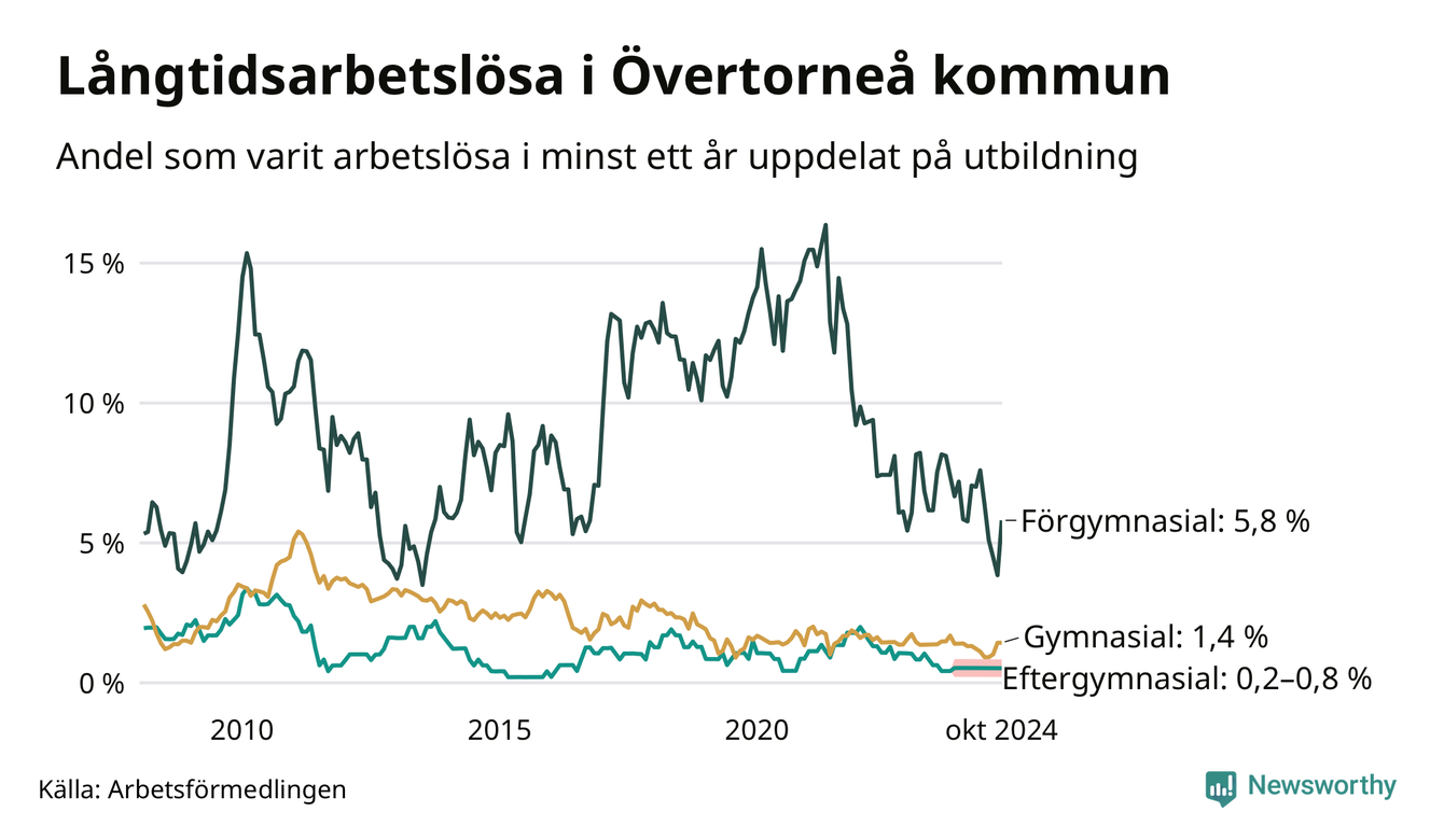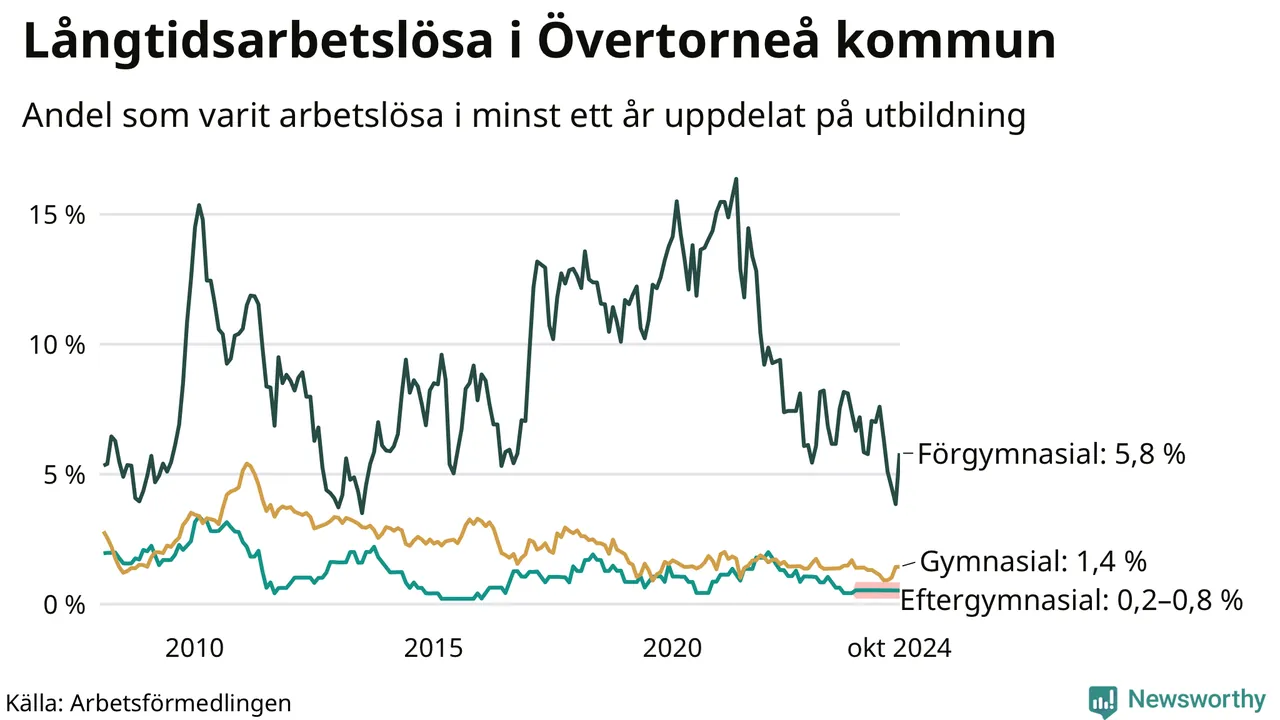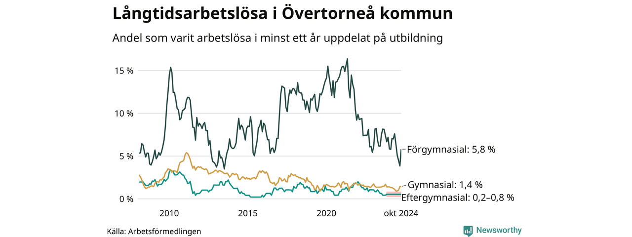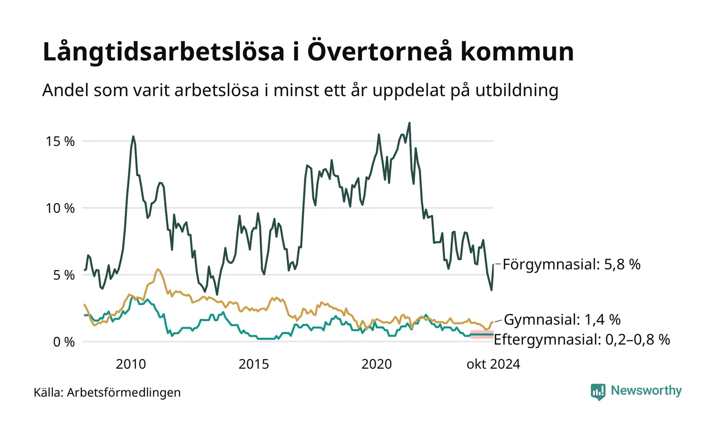 I oktober hade 27 Övertorneåbor varit arbetslösa i minst ett år, vilket är tre fler än månaden innan. 27 personer motsvarar 1,7 procent av arbetskraften i kommunen – andelen långtidsarbetslösa är ungefär på samma nivå som för ett år sedan.