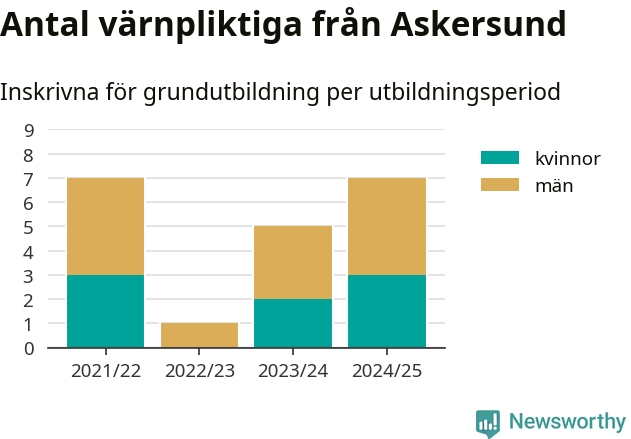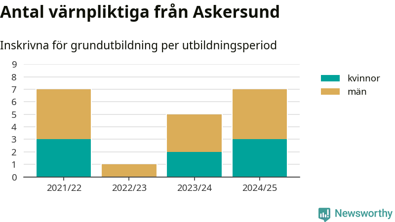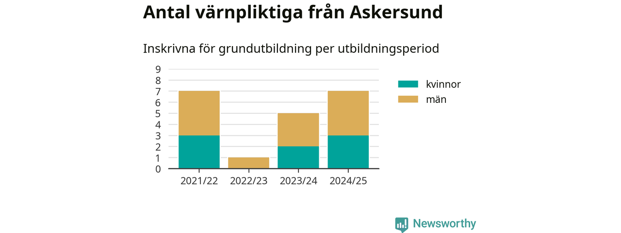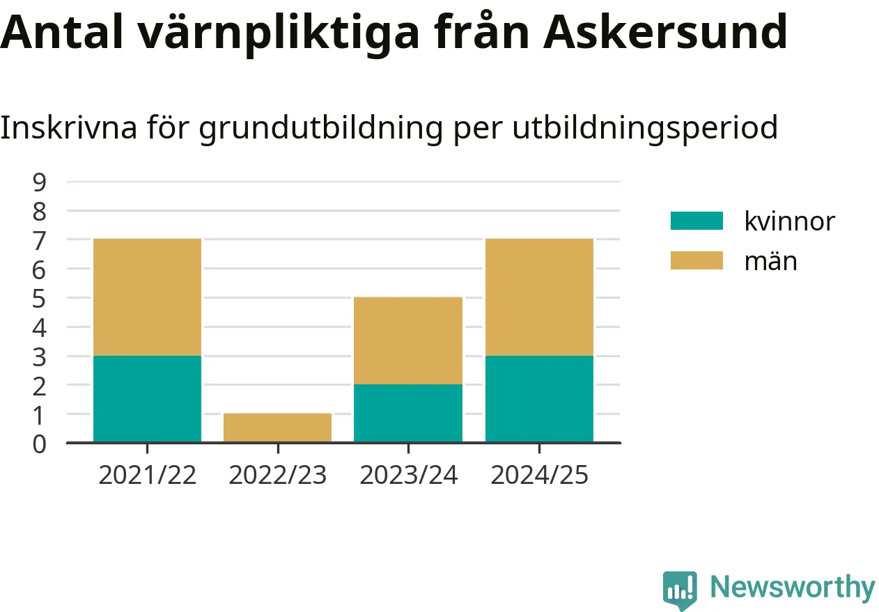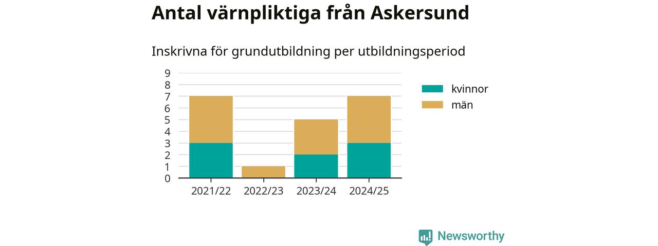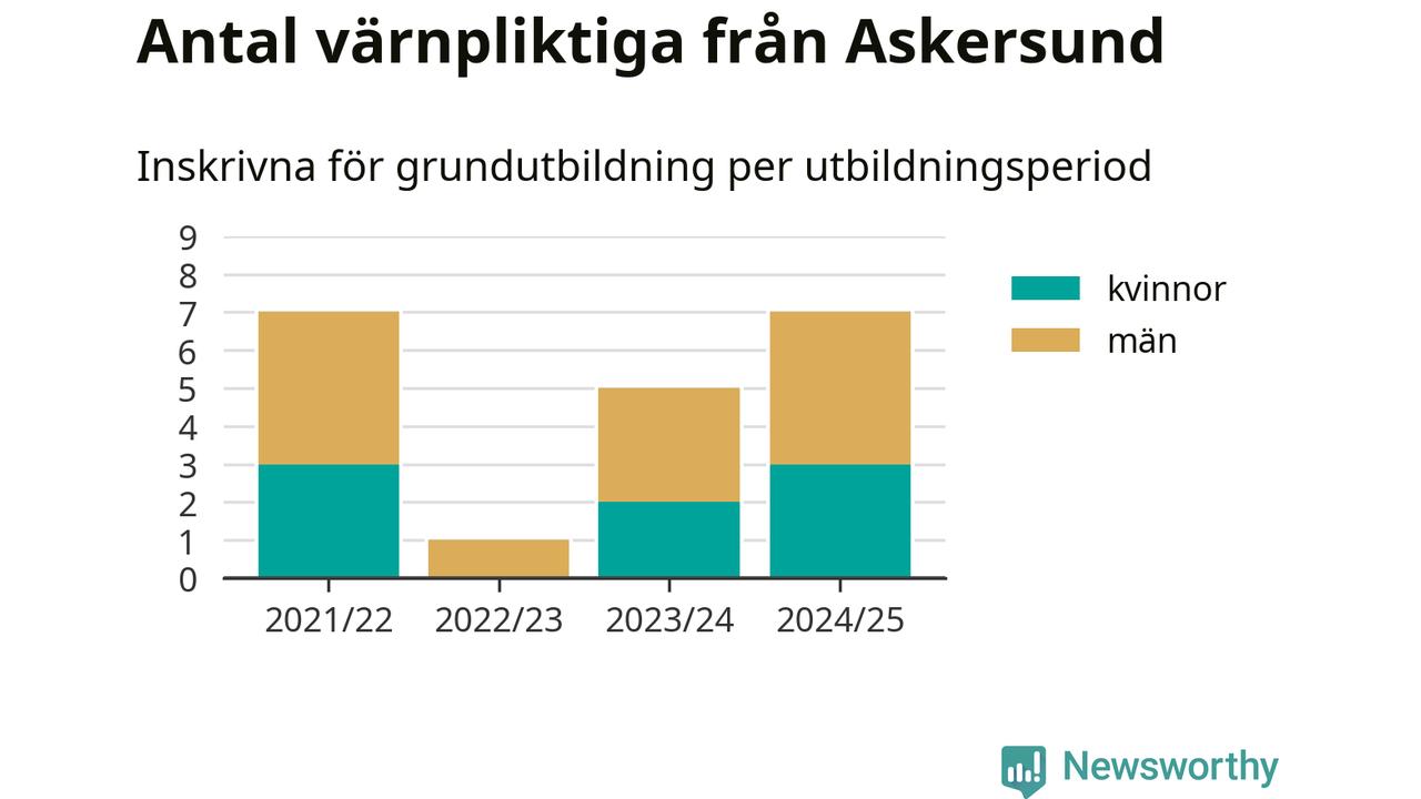 Antalet värnpliktiga från Askersund ökar stadigt, visar siffror från Plikt- och prövningsverket. Under det här värnpliktsåret, med utbildningsstart från juni 2024 till början av 2025, är sju värnpliktiga inskrivna för att påbörja sin grundutbildning. Det är lika många som 2021/22. Den allmänna värnplikten återinfördes 2018.