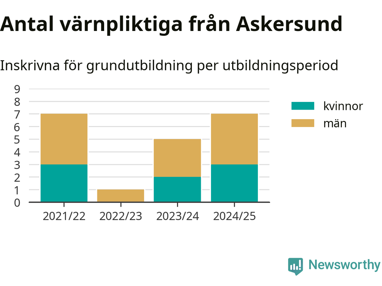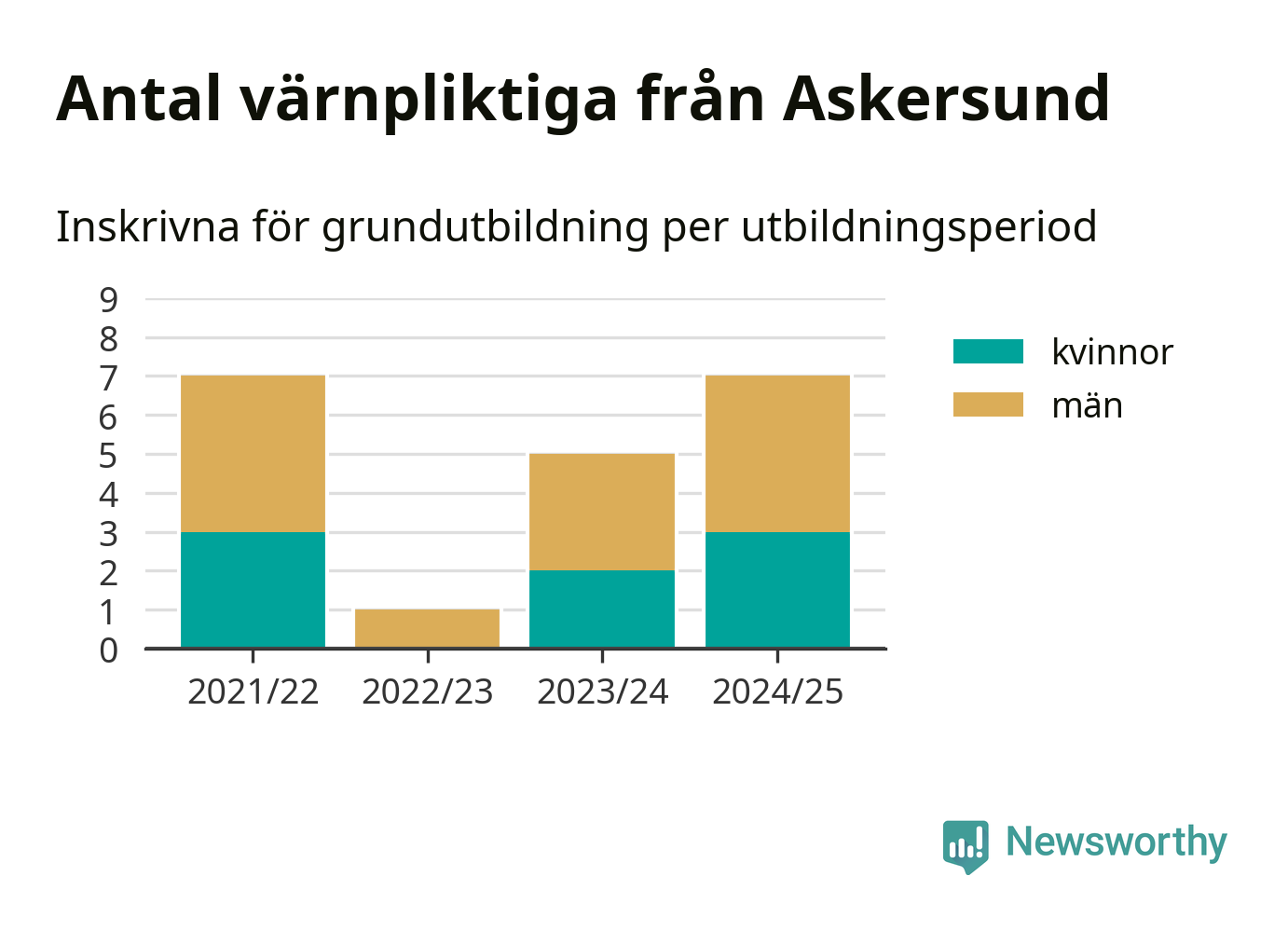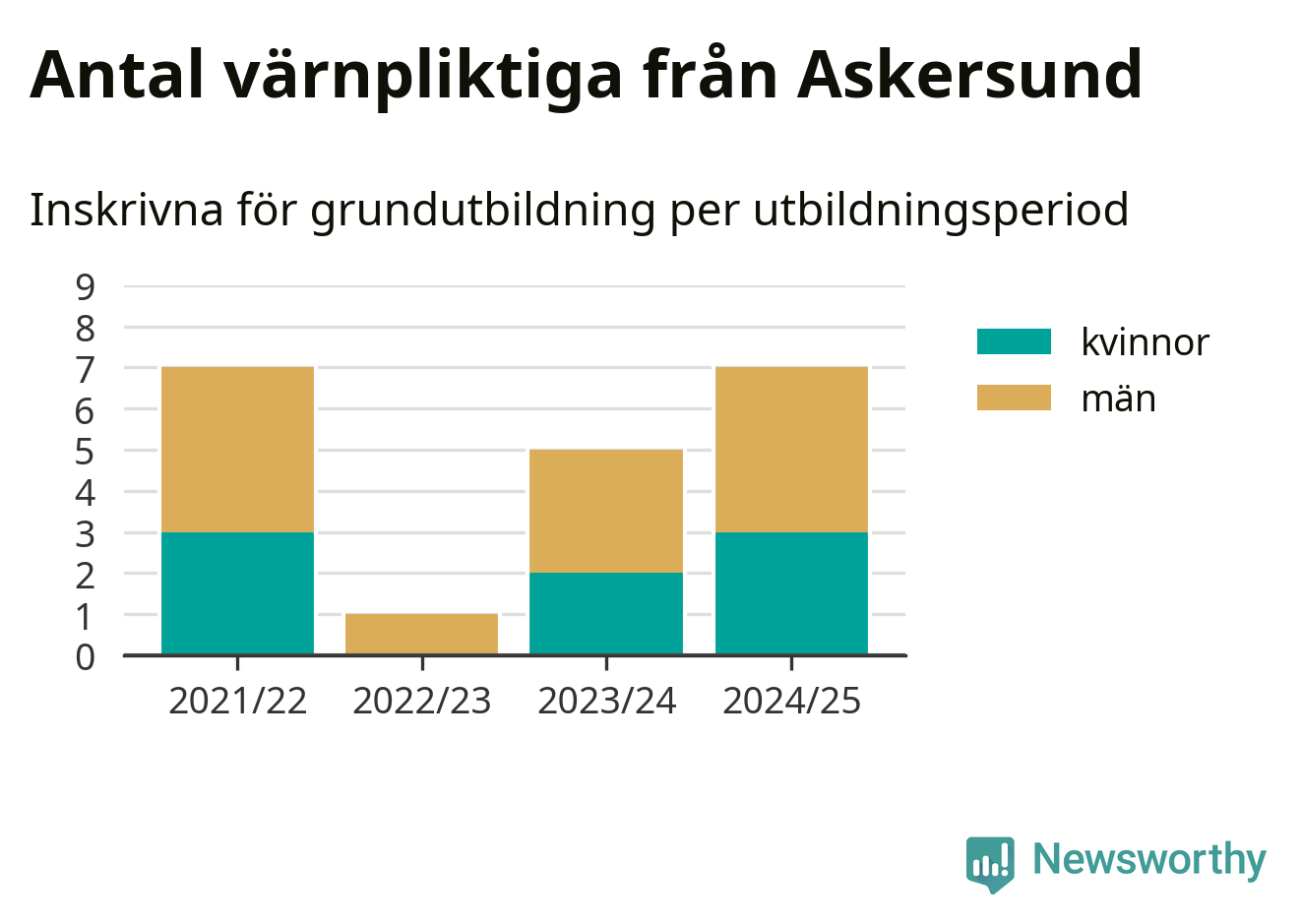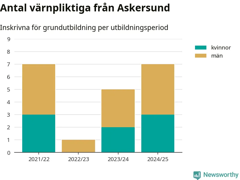 Antalet värnpliktiga från Askersund ökar stadigt, visar siffror från Plikt- och prövningsverket. Under det här värnpliktsåret, med utbildningsstart från juni 2024 till början av 2025, är sju värnpliktiga inskrivna för att påbörja sin grundutbildning. Det är lika många som 2021/22. Den allmänna värnplikten återinfördes 2018.