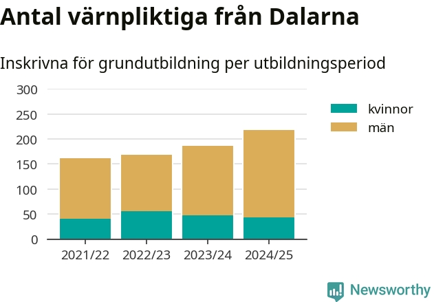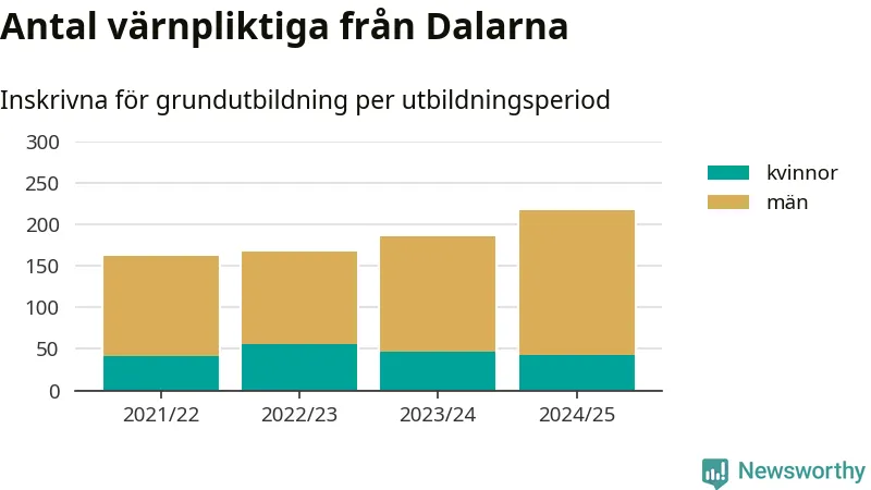 I riket som helhet har antalet som skrivits in ökat de senaste åren – från omkring 5 600 2022/23 till omkring 8 300 personer 2024/25. Samtidigt har mansdominansen bland de värnpliktiga ökat, antalet kvinnor har legat stadigt kring 1 400 och ökningen har egentligen bara skett bland männen. Det innebär att 2022/23 – när andelen kvinnor var som högst – var ungefär 24 procent av de inskrivna kvinna, i år är motsvarande siffra 17 procent.